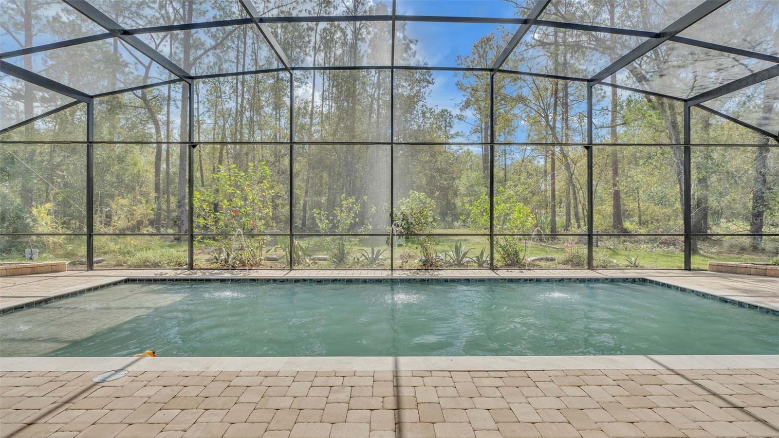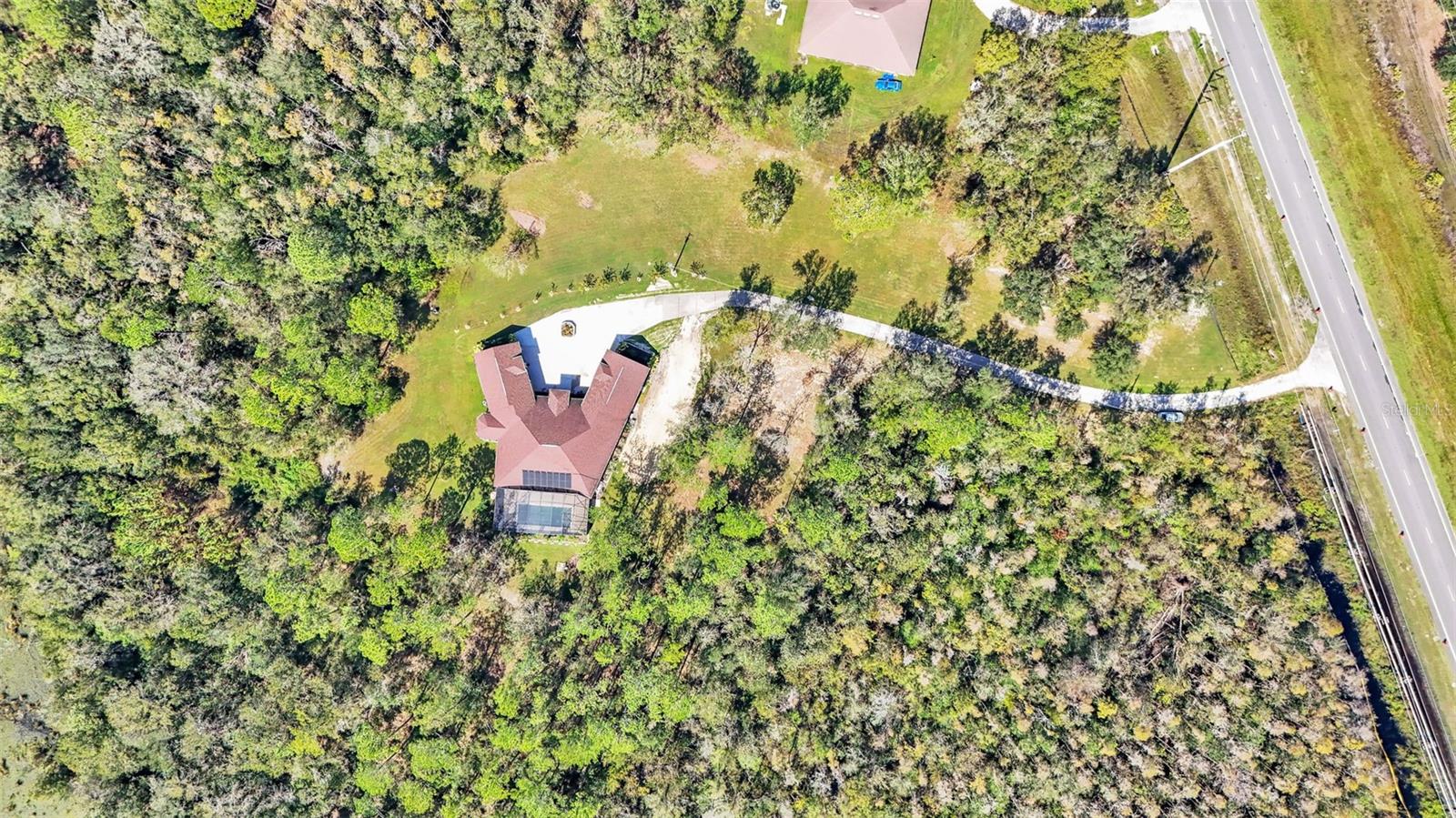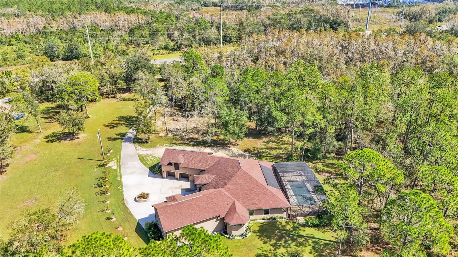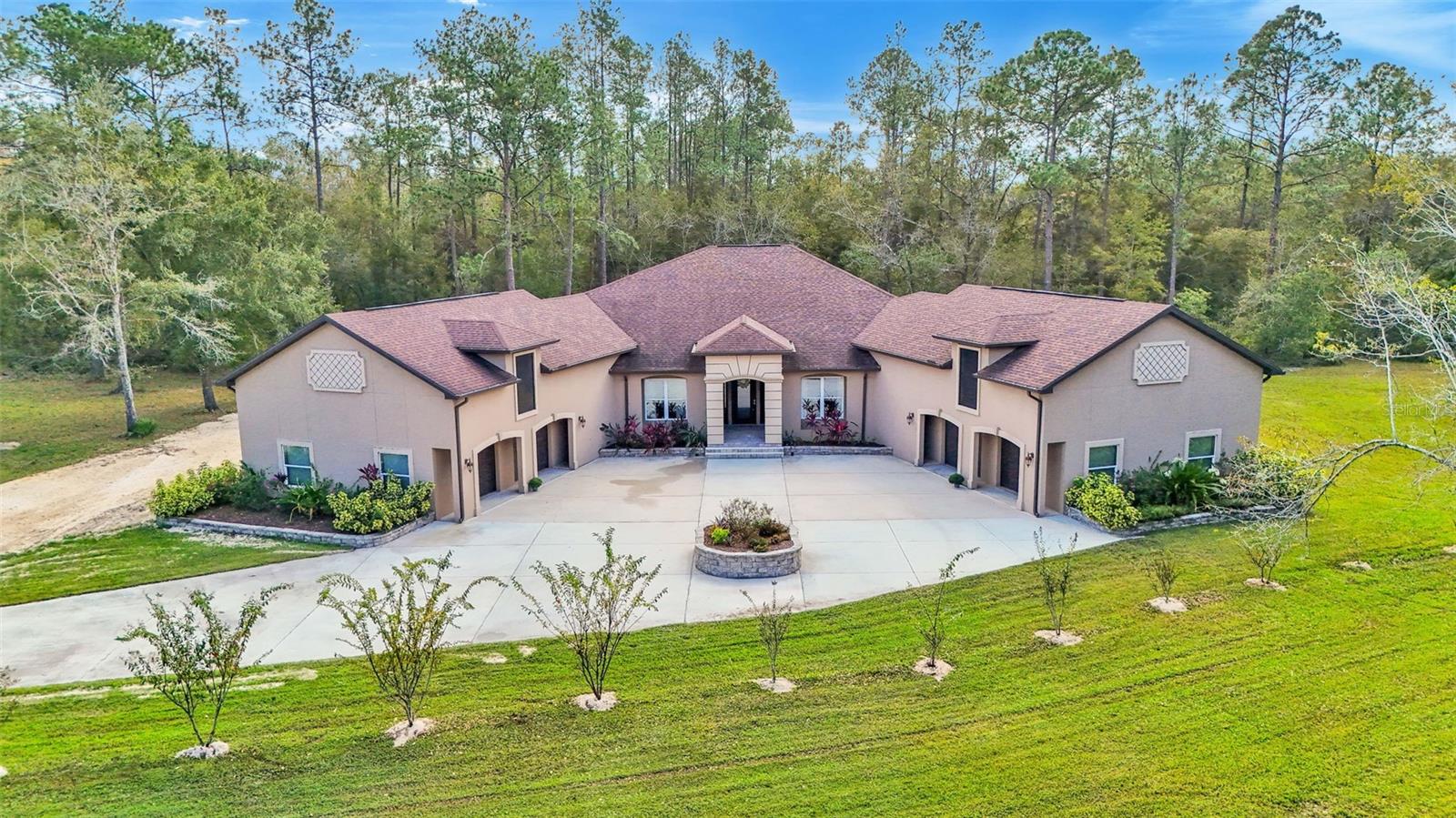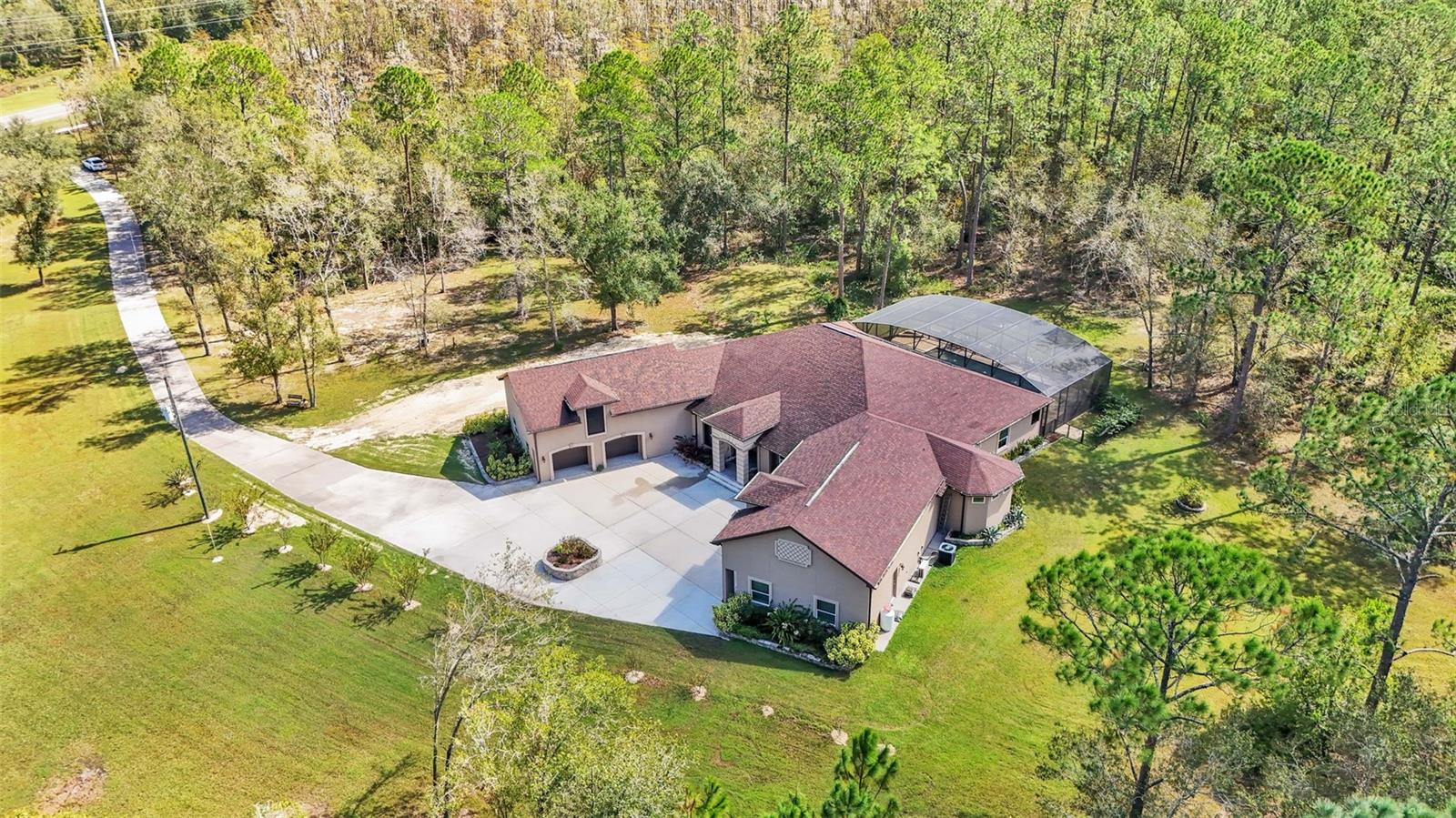 One or more photo(s) has been virtually staged. Welcome to luxury living in a country setting! You're sure to be thrilled by this custom-built 5 bedroom and 4.5 bath home, boasting 4,331 square feet of living space. The 4.94 acre property's long driveway brings you far from the street while a surrounding tree line bolsters an air of private extravagance. A pair of two-car garages flank the front entry, and beyond the glass-paned doorway you'll find elegant tiling adorning the floor of the foyer. High, 10 foot ceilings persist through the home, heightened further by tray ceilings in many of the common areas and neatly framed with beautiful crown molding. Wood pattern tiling begins at the foot of the foyer and continues through the home as well. The living room is the spacious heart of the home, its own ceiling uniquely patterned with a series of recessed rectangles. An electric fireplace and triple-pane sliding glass door to the pool patio accentuate the already-impressive room. The neighboring kitchen is spacious and pristine with light stone countertops along the walls and atop the central island with built-in microwave. Dark subway tiling gives tasteful contrast between the counter and cabinets above. The home presents a split floor plan with each of the wings containing a separate stairway to rooms on the second floor. Two of the bedrooms share a bathroom while the third and forth each enjoy their own. The primary bedroom lies on the first floor, and is a spacious room with tray ceiling and its own sliding door to the pool patio. An abundance of storage space can be found in the generously sized walk-in closet, complete with built in shelving. The primary bathroom is of a unique quality, its walk-in u-turn style shower tiled with elegant stone shades and accompanied by convenient bench seating below a pair of shower heads. Throughout the rest of the home you'll find an office with built-in Victorian shelving, a large bonus room, and screened in balcony space outside of the second-floor bedroom. But there's even more to this property as you continue to the immense covered patio at the rear of the home, furnished with its own outdoor kitchen and pair of fans along the high ceiling. Paver flooring stretches toward and around the pool, all of which is enclosed within the screened pool cage. Equipped with both a conventional and solar pool heater, this outdoor space is ready for your enjoyment no matter the weather. The home's water softener as well as gas stove and dryer are just a few of the conveniences you'll find within this private paradise. Just off of Hwy 98 N in North Lakeland, this extravagant home remains close to the city while enjoying the blissful privacy of its 4.94 acre lot. An adjacent 5 acre lot is vacant, and currently listed for sale as well.