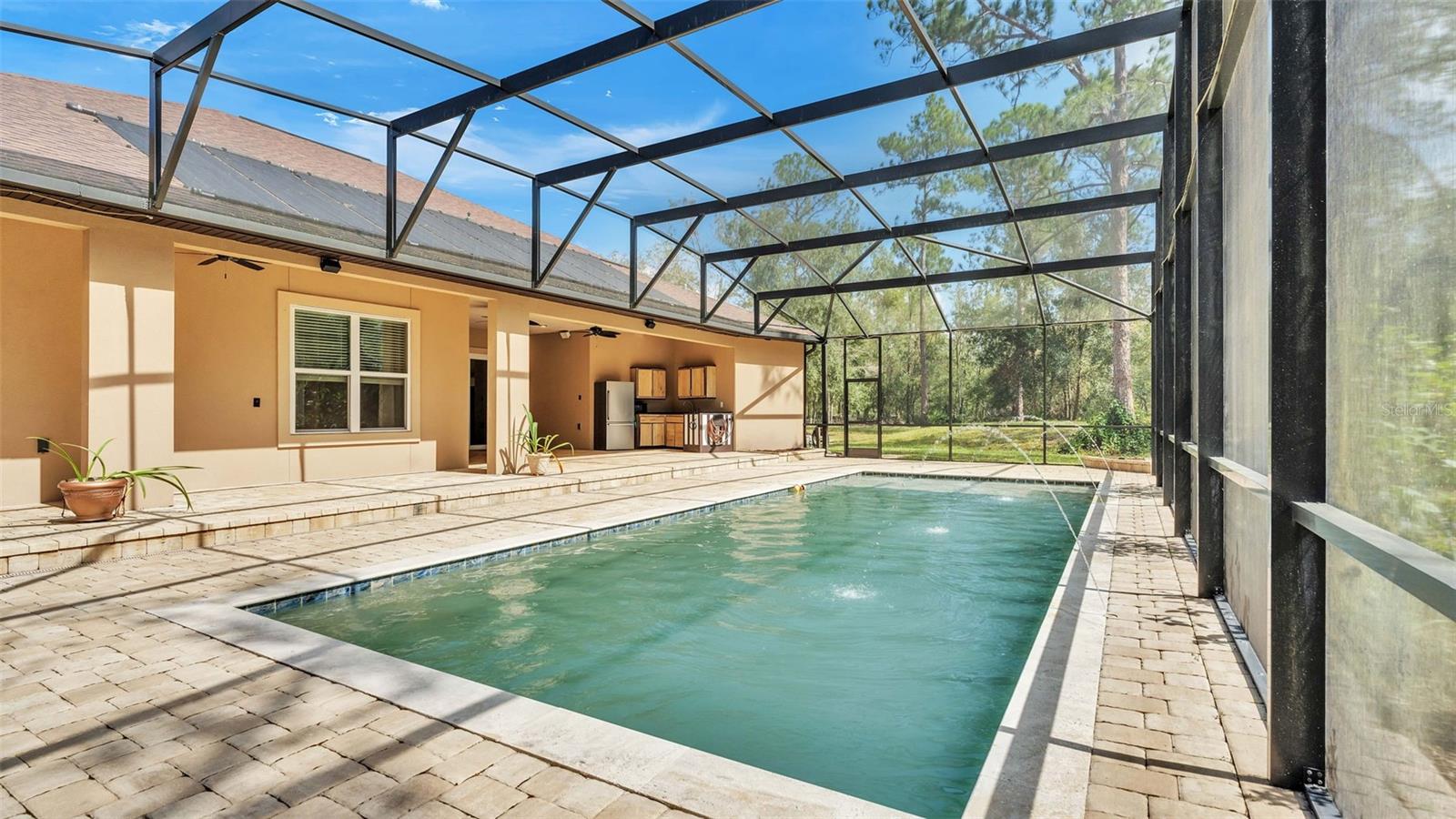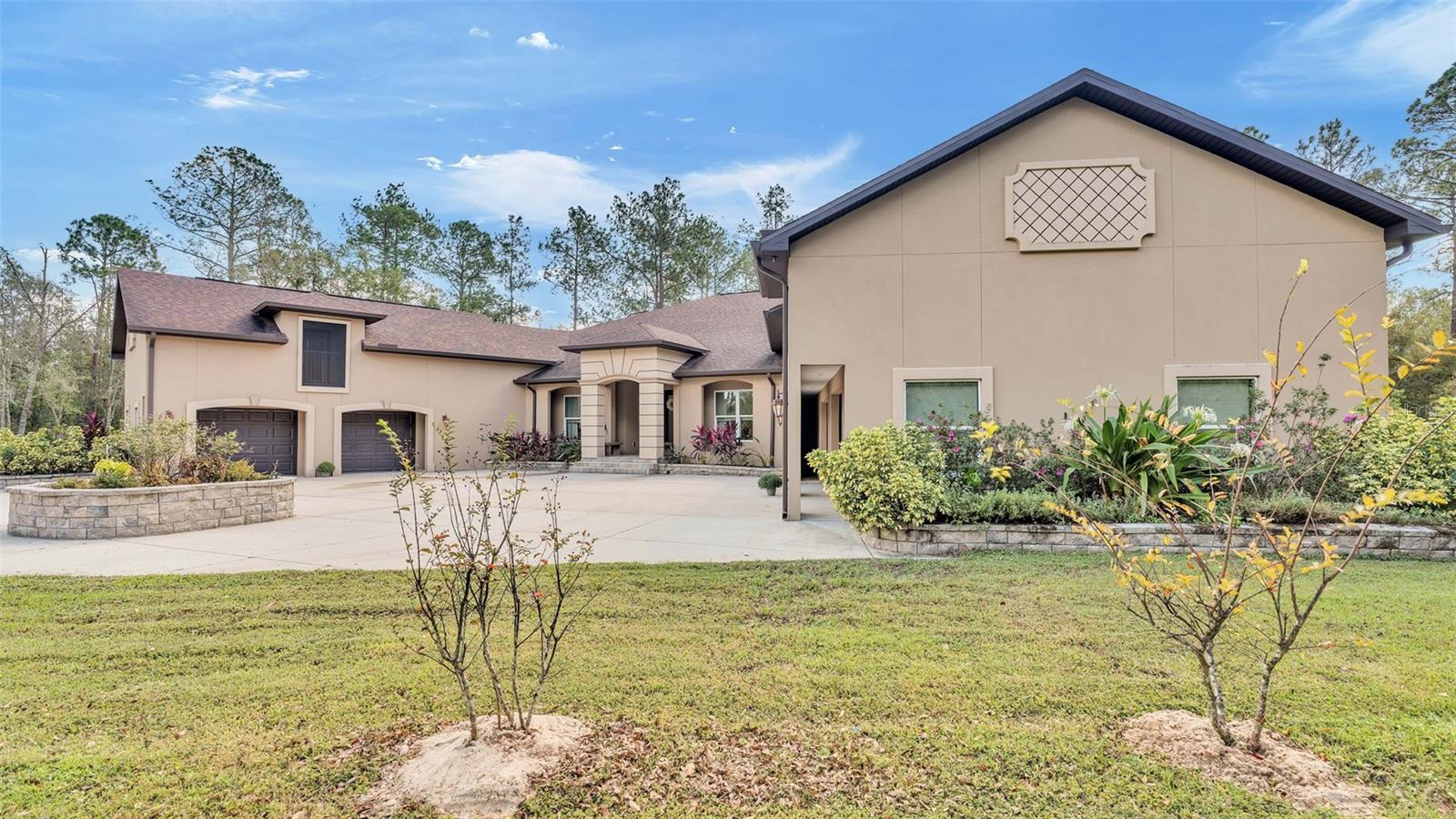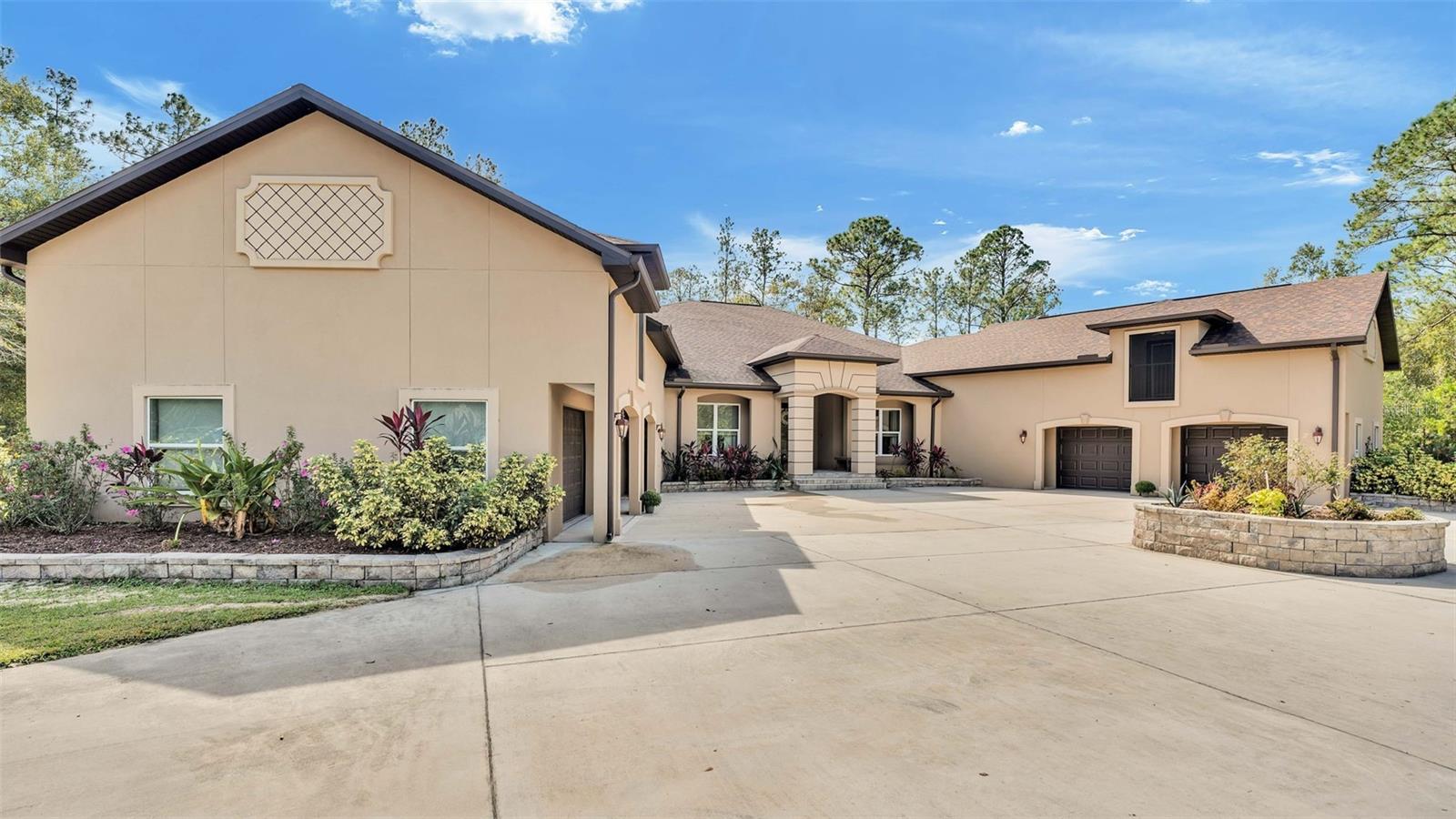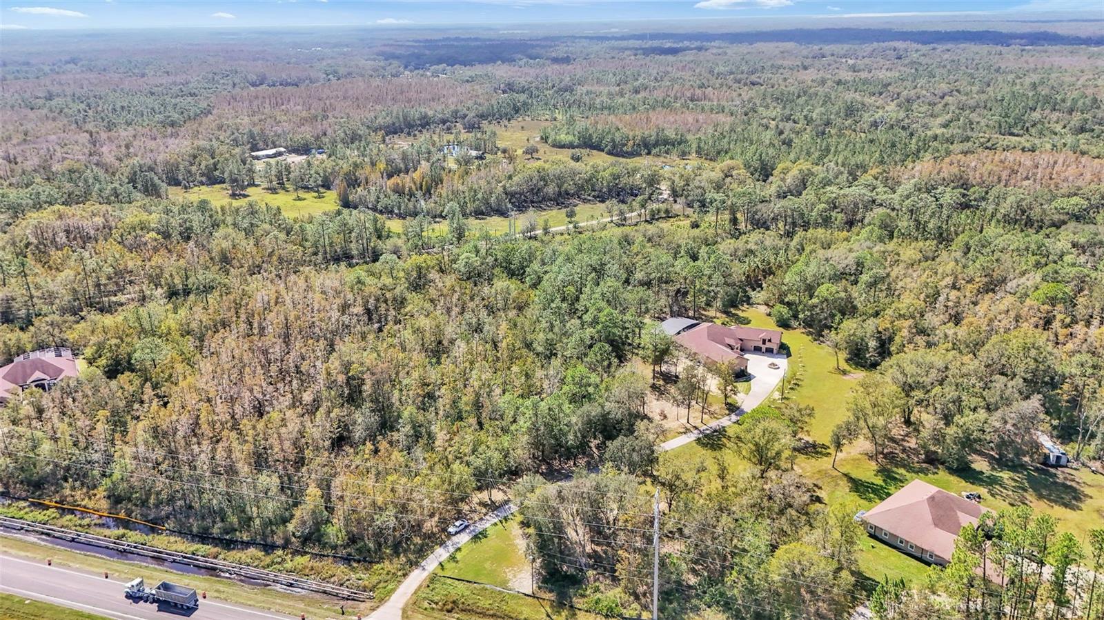 One or more photo(s) has been virtually staged. Welcome to luxury living in a country setting! You're sure to be thrilled by this custom-built 5 bedroom and 4.5 bath home, boasting 4,331 square feet of living space. The 4.94 acre property's long driveway brings you far from the street while a surrounding tree line bolsters an air of private extravagance. A pair of two-car garages flank the front entry, and beyond the glass-paned doorway you'll find elegant tiling adorning the floor of the foyer. High, 10 foot ceilings persist through the home, heightened further by tray ceilings in many of the common areas and neatly framed with beautiful crown molding. Wood pattern tiling begins at the foot of the foyer and continues through the home as well. The living room is the spacious heart of the home, its own ceiling uniquely patterned with a series of recessed rectangles. An electric fireplace and triple-pane sliding glass door to the pool patio accentuate the already-impressive room. The neighboring kitchen is spacious and pristine with light stone countertops along the walls and atop the central island with built-in microwave. Dark subway tiling gives tasteful contrast between the counter and cabinets above. The home presents a split floor plan with each of the wings containing a separate stairway to rooms on the second floor. Two of the bedrooms share a bathroom while the third and forth each enjoy their own. The primary bedroom lies on the first floor, and is a spacious room with tray ceiling and its own sliding door to the pool patio. An abundance of storage space can be found in the generously sized walk-in closet, complete with built in shelving. The primary bathroom is of a unique quality, its walk-in u-turn style shower tiled with elegant stone shades and accompanied by convenient bench seating below a pair of shower heads. Throughout the rest of the home you'll find an office with built-in Victorian shelving, a large bonus room, and screened in balcony space outside of the second-floor bedroom. But there's even more to this property as you continue to the immense covered patio at the rear of the home, furnished with its own outdoor kitchen and pair of fans along the high ceiling. Paver flooring stretches toward and around the pool, all of which is enclosed within the screened pool cage. Equipped with both a conventional and solar pool heater, this outdoor space is ready for your enjoyment no matter the weather. The home's water softener as well as gas stove and dryer are just a few of the conveniences you'll find within this private paradise. Just off of Hwy 98 N in North Lakeland, this extravagant home remains close to the city while enjoying the blissful privacy of its 4.94 acre lot. An adjacent 5 acre lot is vacant, and currently listed for sale as well.