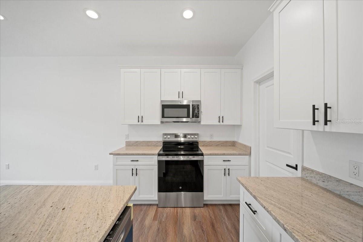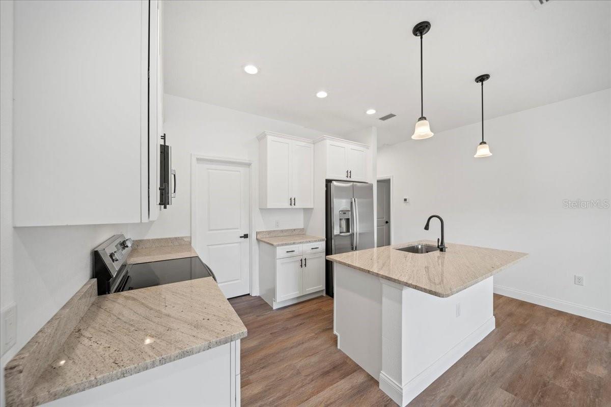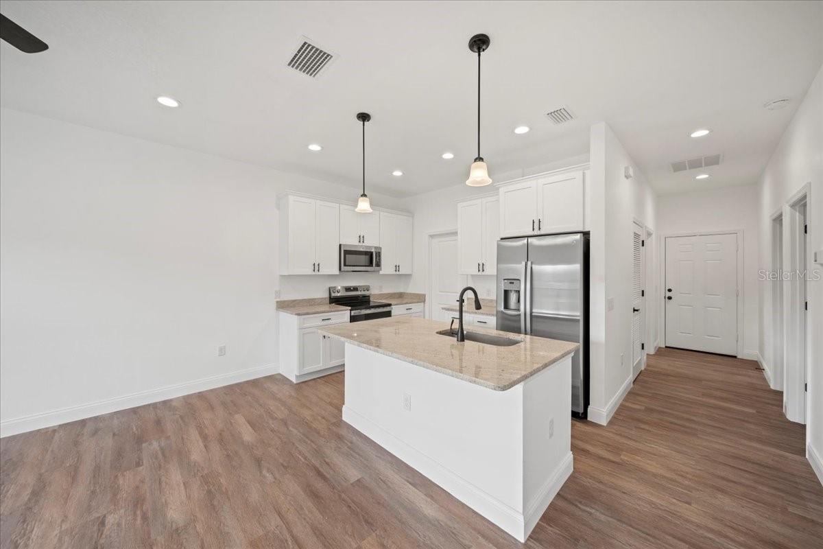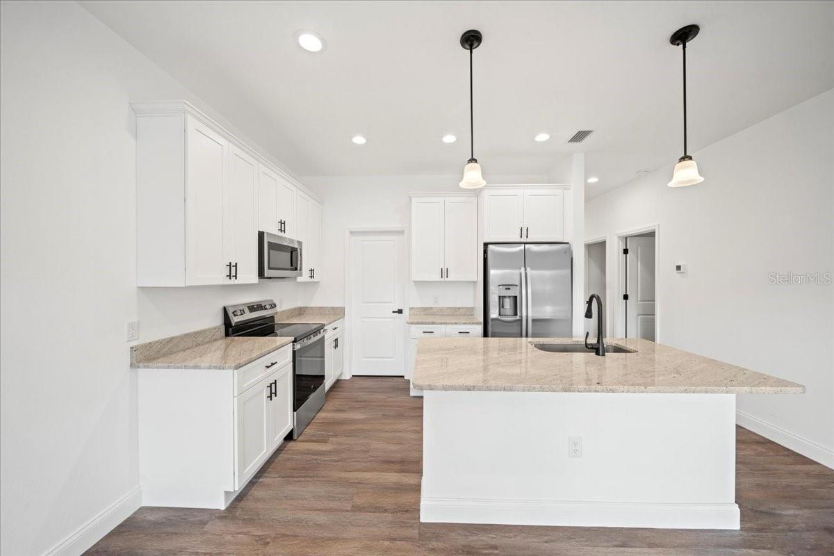 Welcome to this brand-new, beautifully crafted 3-bedroom, 2-bathroom home, nestled in the desirable South Lakeland area. This home offers an ideal location, just minutes from major employers like Geico and Publix corporate offices, and provides easy access to the Polk Parkway for effortless commuting. Boasting 9.3-foot floor-to-ceiling heights, the home features energy-efficient HVAC and luxury vinyl plank flooring throughout. The spacious living room is enhanced by recessed lighting and a large window that overlooks the front yard. The primary bedroom is a tranquil retreat, featuring a large window with a stunning view of the wooded conservation area, visible not only from the room but also from the two additional bedrooms. The ensuite bathroom is a luxurious haven, complete with a built-in closet, a frameless glass shower door, a tiled walk-in shower with an accented base, and an additional window that frames the natural beauty outside. The kitchen is a chef's dream, featuring level two granite countertops, a large island with seating for three, two pendant lights, and recessed lighting. Brand-new GE stainless steel appliances, including a refrigerator, dishwasher, and built-in microwave, are complemented by slow-shut cabinets and an undermount single farm-style sink. The laundry room, accessible from the kitchen, includes a 40-gallon water heater and ample space for a side-by-side washer and dryer. The home provides privacy on the right side and in the backyard, where you can enjoy scenic views of the conservation area and the soothing sounds of nature. Perfectly located minutes from Publix, Target, Lakeside Village, and Lakeland Airport, this home combines comfort, convenience, and serenity. Schedule your tour today and experience all this home has to offer!