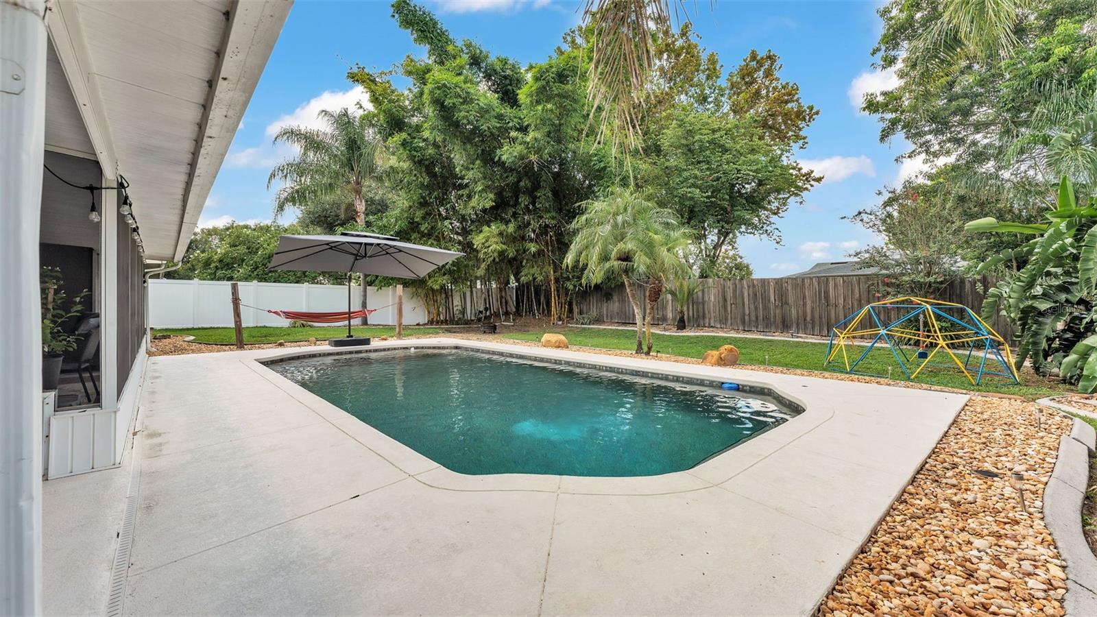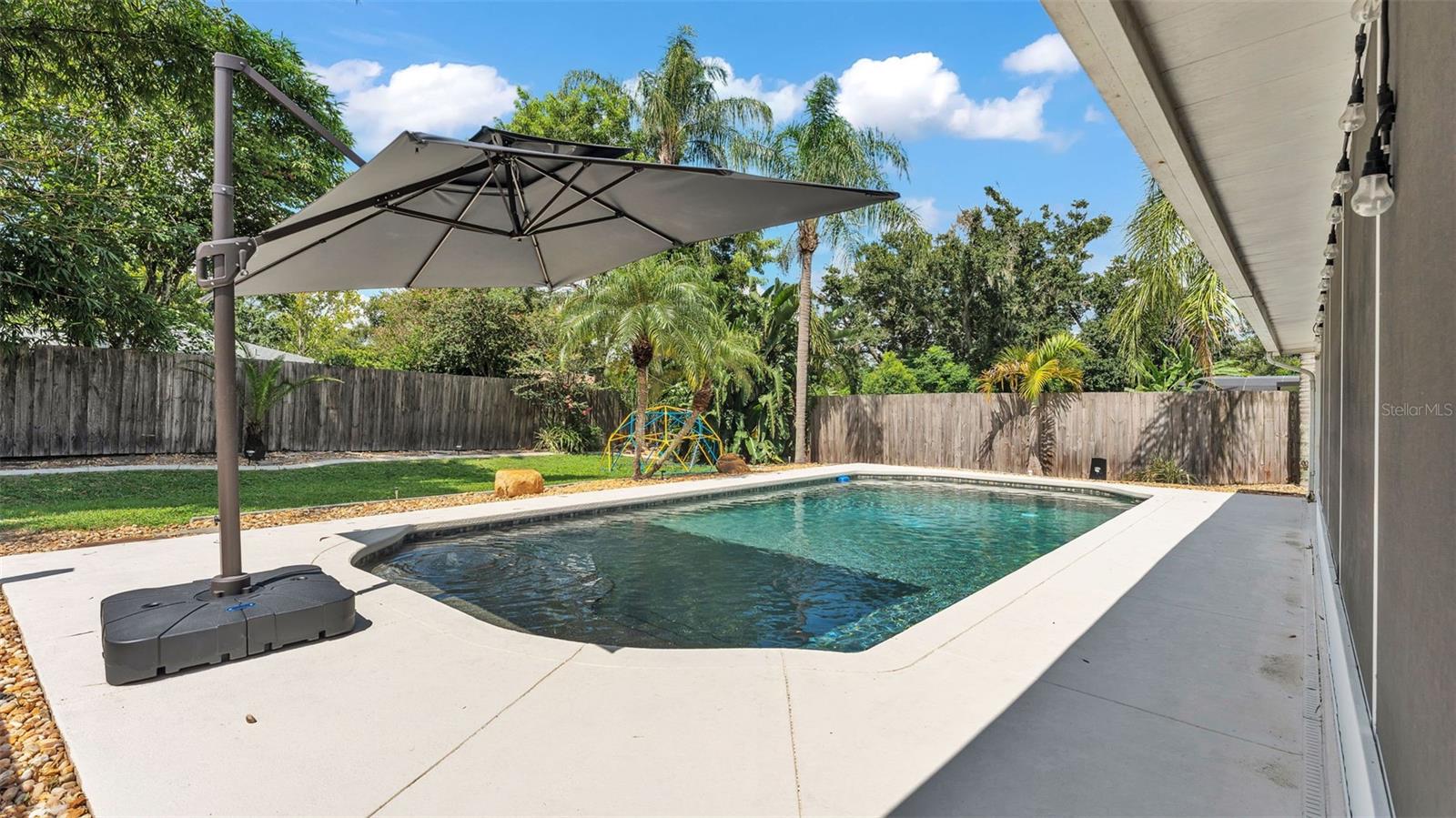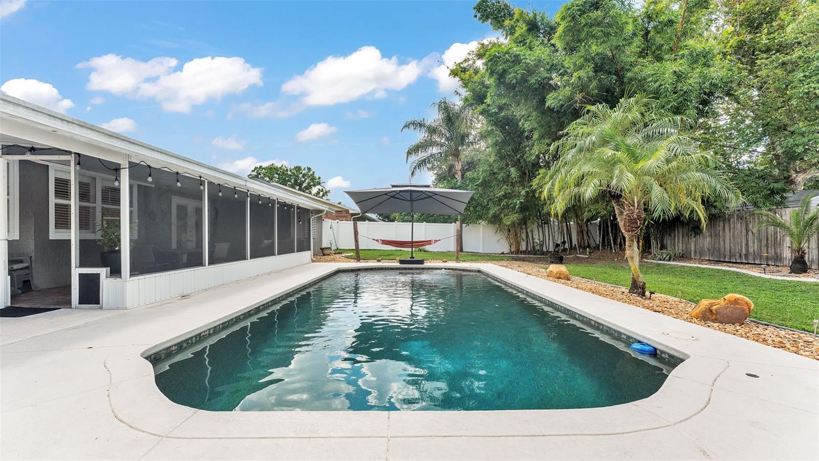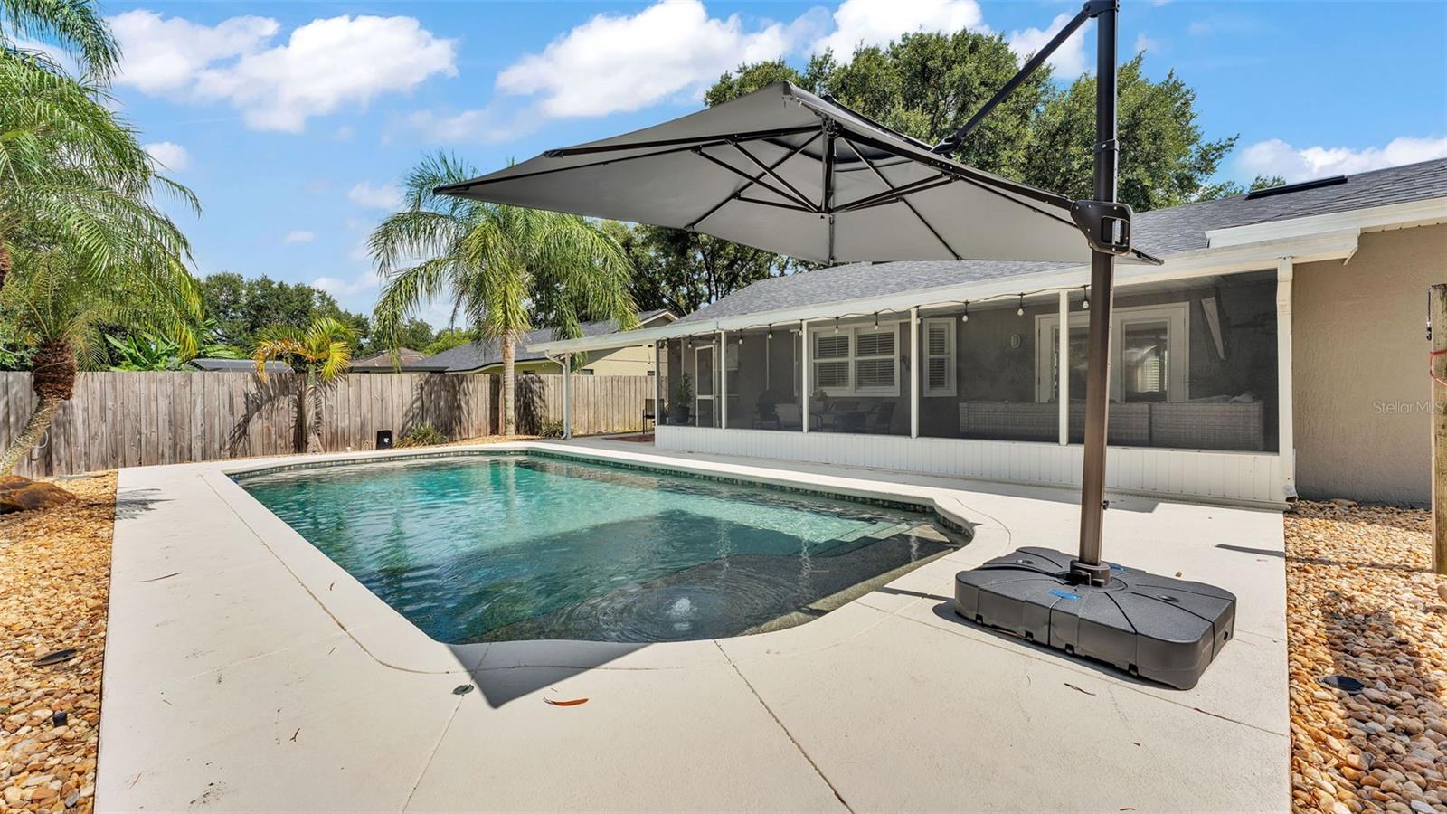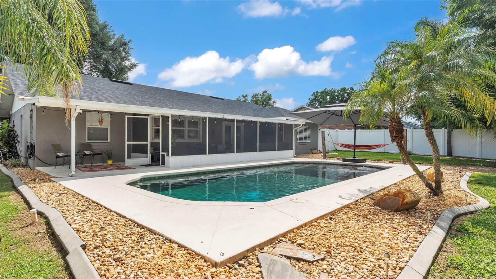 Welcome to your dream home in the heart of South Lakeland! This beautifully maintained 4-bedroom, 2-bathroom residence with an additional office or bonus room is perfectly move-in ready--and packed with features you'll love. Step inside to an elegant kitchen that serves as the heart of the home, featuring granite countertops, stainless steel appliances, stylish tile backsplash, and an abundance of cabinet storage. There's even space for a dining table, with a seamless view into the wide-open living area--ideal for entertaining or everyday living. Down the hallway, you'll find three spacious guest bedrooms that share a full bathroom, offering both comfort and functionality. The home's split floor plan ensures privacy, with the primary suite tucked away for your own personal retreat. Outside, your screened-in back lanai overlooks a sparkling inground pool and a fully fenced, expansive backyard--perfect for relaxing, entertaining, or outdoor play. The tropical landscaping and privacy fencing create a serene, resort-like atmosphere right in your own backyard. Located just minutes from the Polk Parkway, commuting is a breeze, and you'll love the proximity to Highlands Grove Elementary, Parkway Christian Academy, shopping, dining, and the upcoming Orlando Health campus. With newer wood-look tile throughout, vaulted ceilings, and an abundance of natural light, this home is the perfect blend of style, space, and location. Don't miss out on this South Lakeland gem--schedule your private tour today!