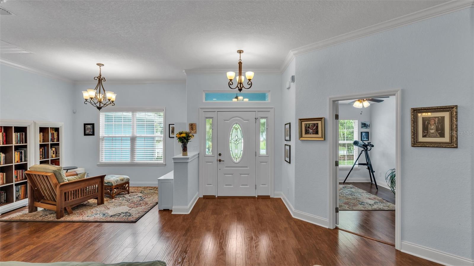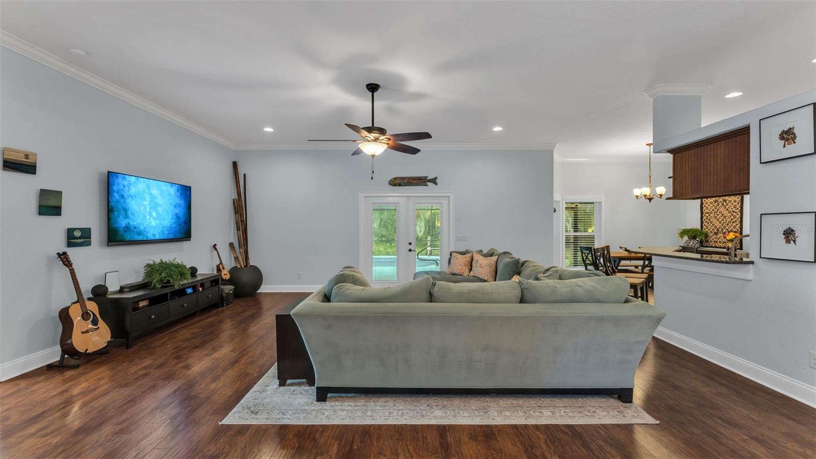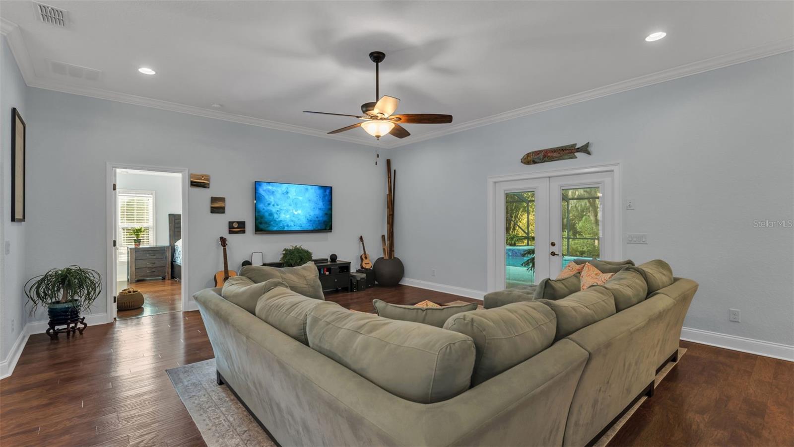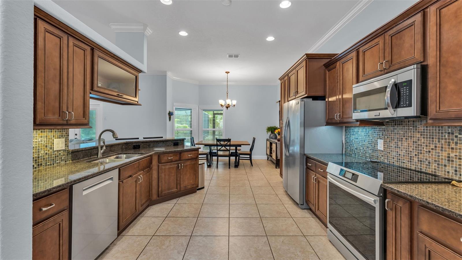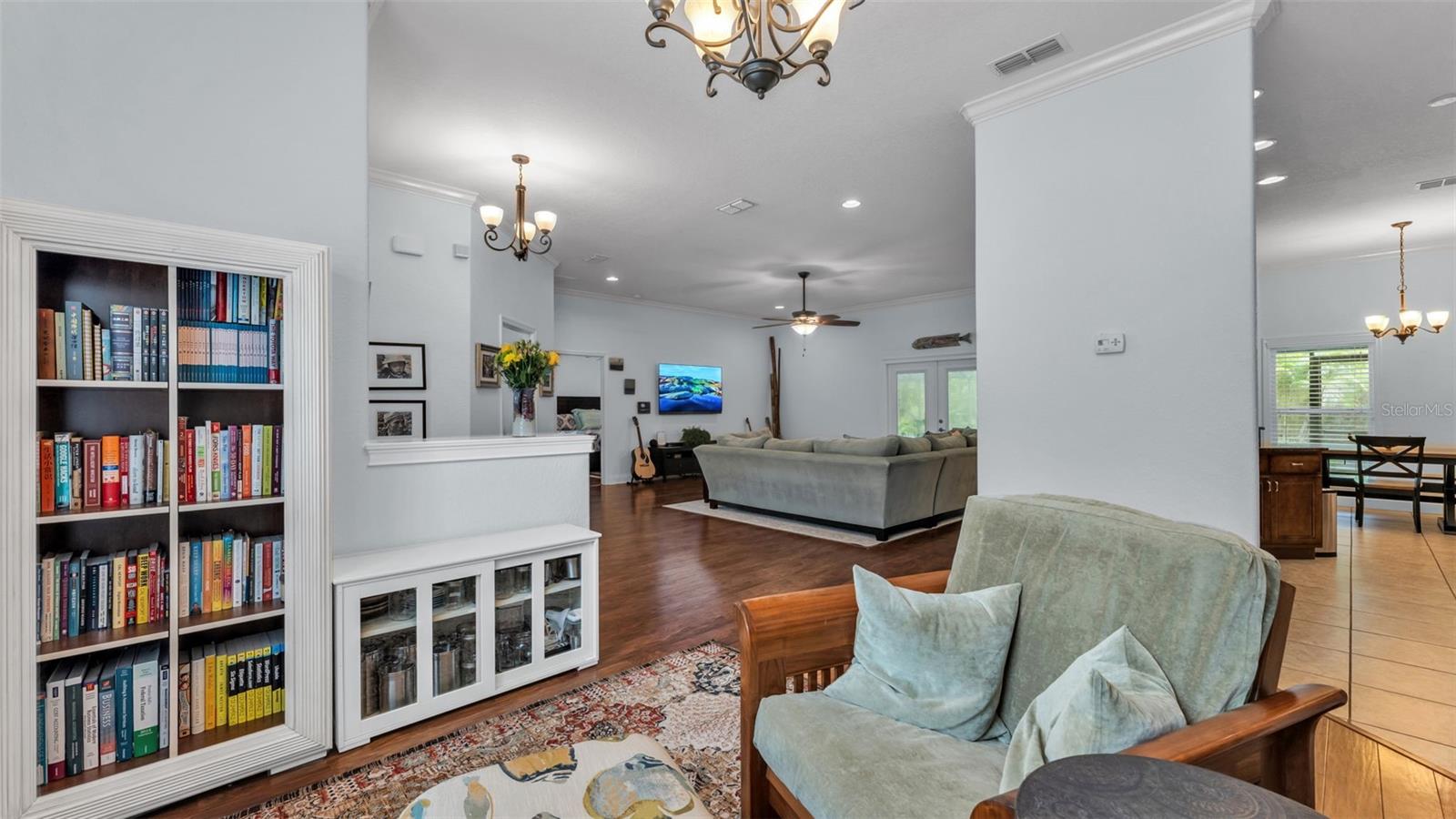 Welcome to this exquisite 3-bedroom, 2-bathroom pool home with a dedicated office, set on a spacious half-acre lot in the highly desirable Deer Brooke subdivision of South Lakeland. Built in 2015 by Danny Sadler, Inc., this custom-crafted masterpiece blends modern design with timeless craftsmanship, offering the perfect combination of style, comfort, and functionality. As you step inside, soaring ceilings and elegant crown molding immediately create a sense of openness and sophistication. Beautiful wood laminate flooring runs seamlessly throughout, adding both warmth and durability. The expansive living room is designed for family gatherings and entertaining, offering effortless flow and connection between the main living spaces. At the heart of the home, the chef's kitchen is a true showstopper, featuring gleaming granite countertops, stainless steel appliances--including a newer dishwasher and induction oven--and abundant cabinetry and counter space to inspire your culinary creativity. A formal dining room, currently styled as a cozy study, provides versatile space to suit your lifestyle. The primary suite is an elegant private retreat, highlighted by tray ceilings and French doors leading directly to the serene lanai and pool. The spa-like en-suite bathroom features dual vanities, a walk-in tiled shower, and a soaking garden tub, creating the ultimate space to relax, unwind, and recharge at the end of the day. The spacious home office offers a quiet space for work or study at the front of the home. Two additional bedrooms on the opposite wing each include walk-in closets, ensuring comfort, privacy, and ample storage for family or guests. A thoughtfully designed second bathroom opens directly to the screened-in patio and pool--perfect for outdoor living. Step outside to your poolside paradise, where you can relax and entertain under the screened-in patio while taking in the tranquility of your backyard. With no rear neighbors and a natural backdrop, the sparkling pool invites you to unwind. Open the French doors and the outdoor living area seamlessly blends with the open floor plan, creating the ideal setting for a festive celebration or a memorable family barbecue. Conveniently located near shopping, dining, and with quick access to the Polk Parkway, commuting to Tampa or Orlando is a breeze. Move-in ready and meticulously maintained, this exceptional property is awaiting new owners ready to enjoy all it has to offer. Don't miss the opportunity to make this South Lakeland pool home your own!