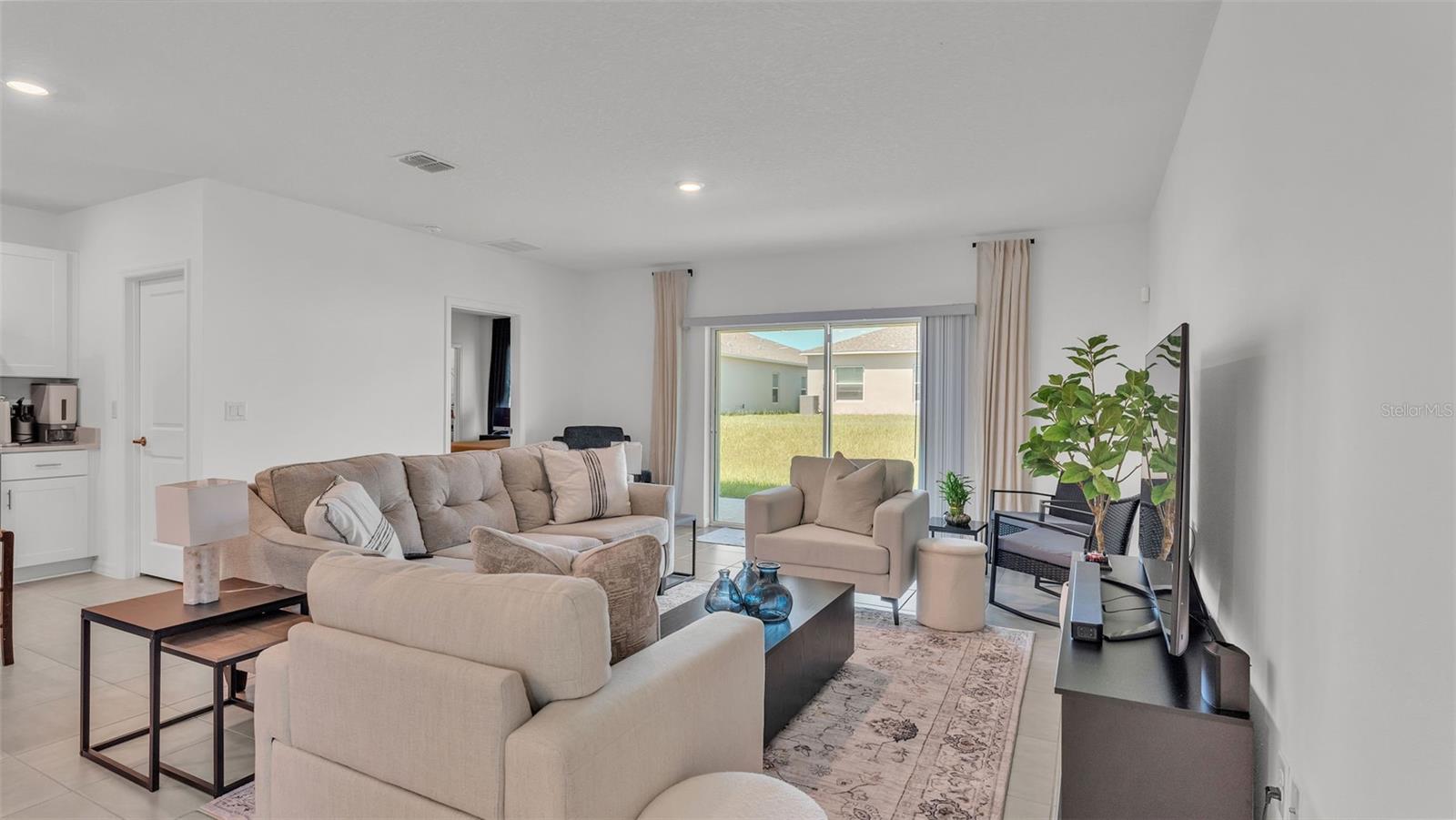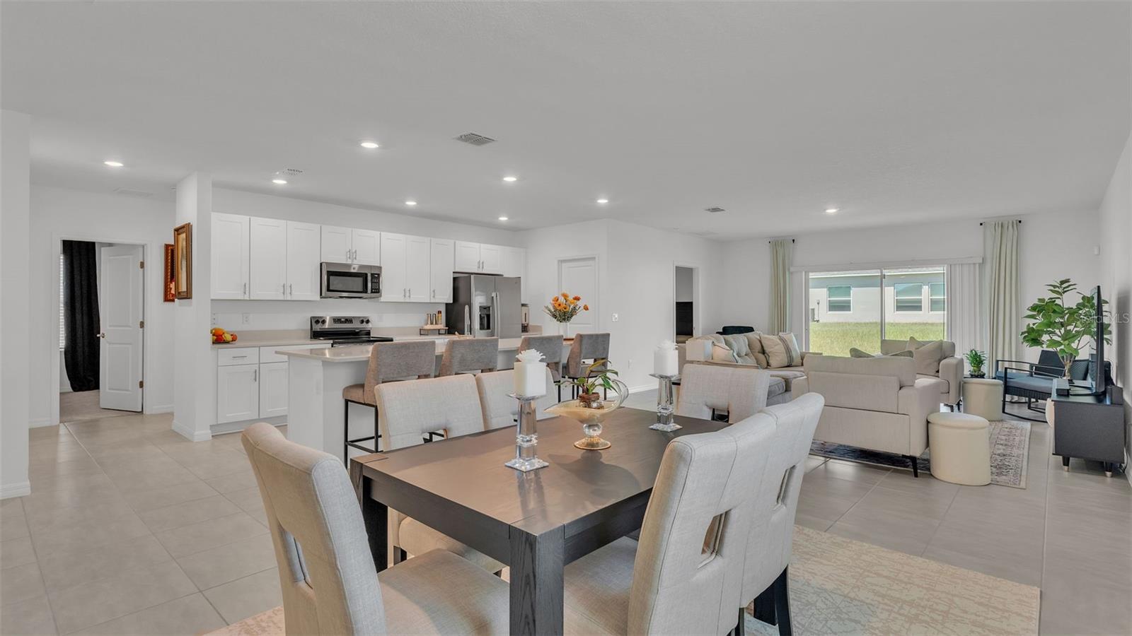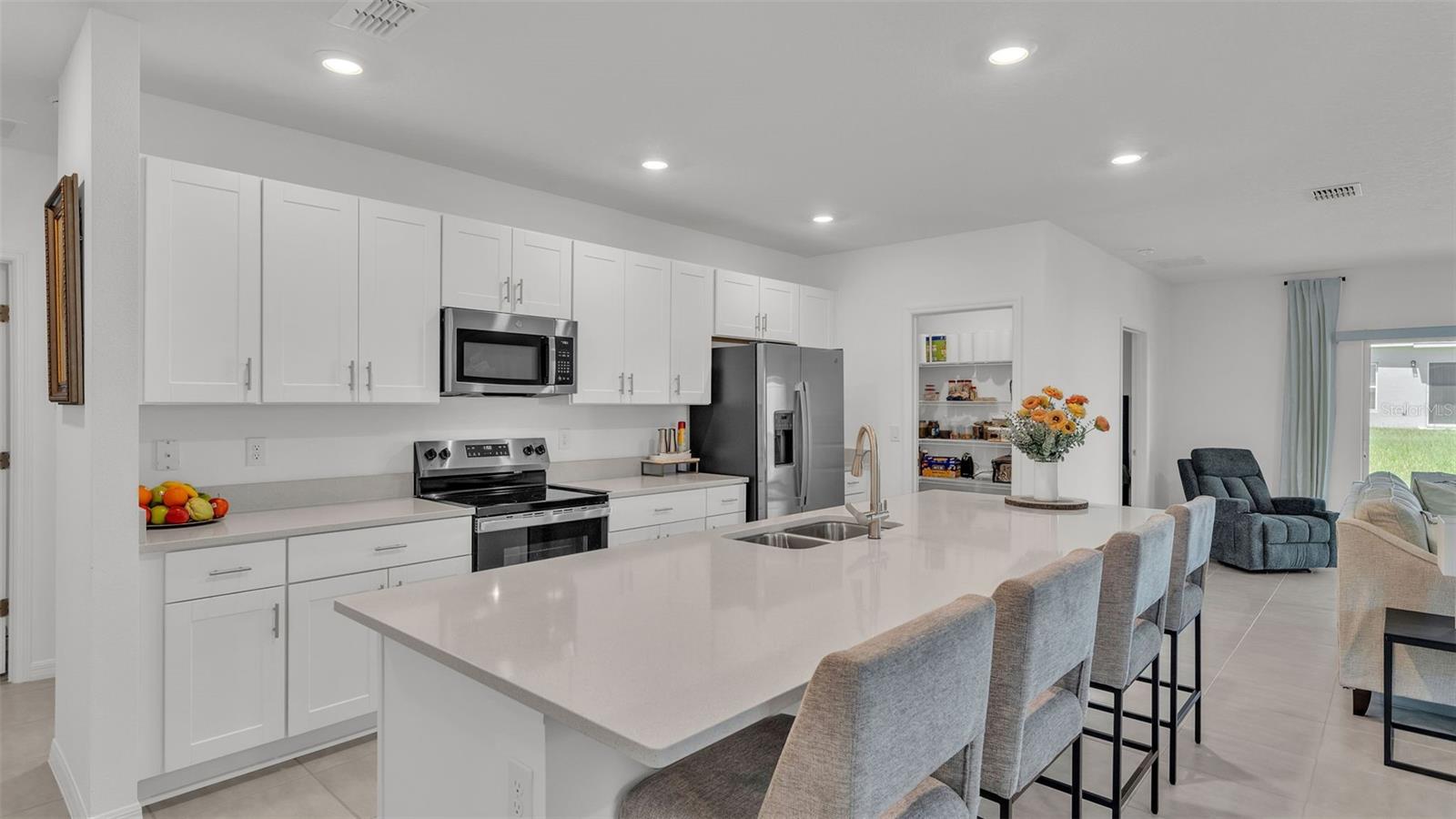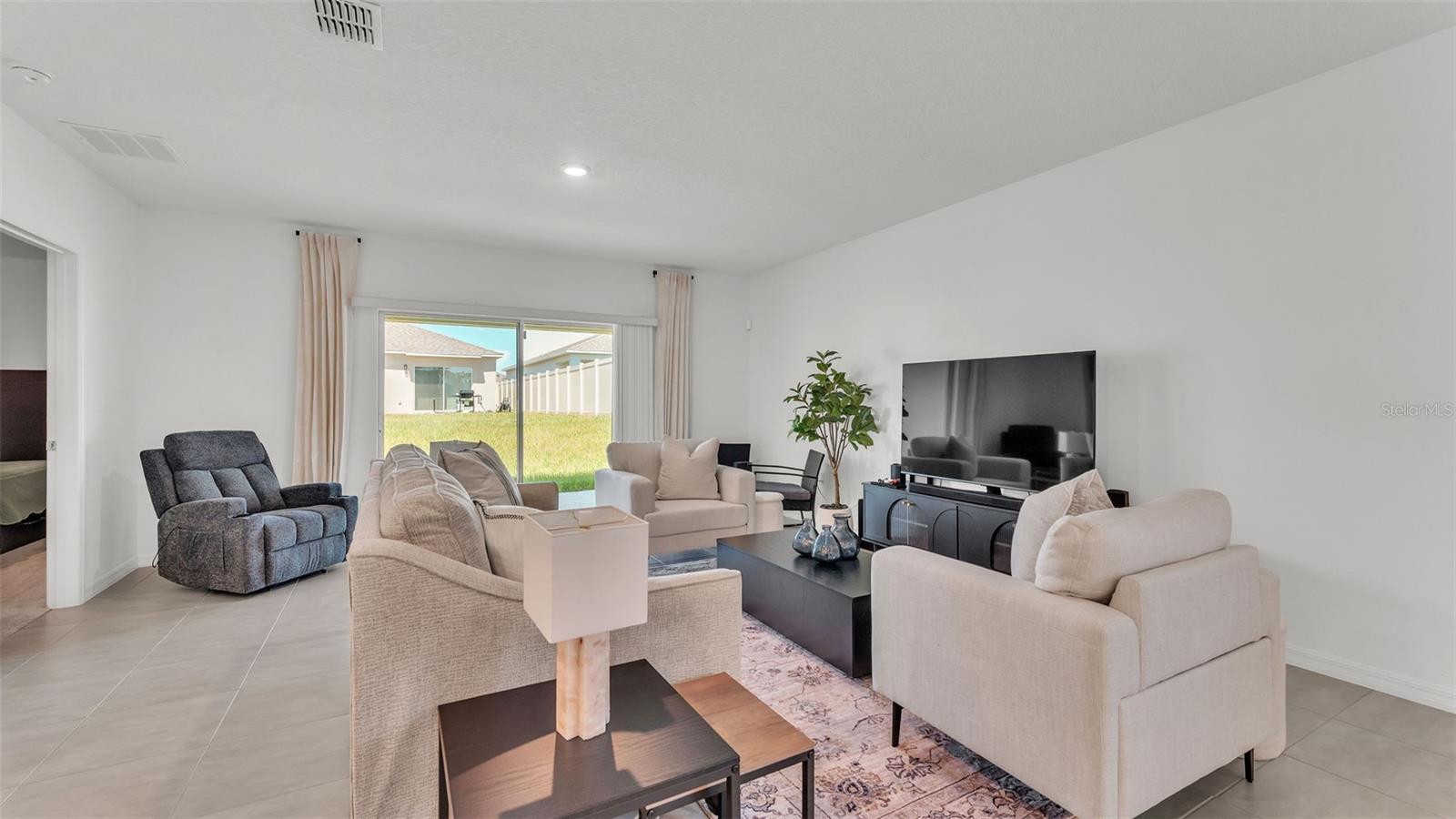 Introducing a beautifully crafted 4-bedroom, 3-bathroom home completed in April 2025 by Taylor Morrison, nestled in the Scenic Terrace community. This stunning property boasts a modern open floor plan, ideal for both comfortable living and entertaining guests. As you enter the home, you are greeted by a bright and airy living space that seamlessly connects the living room and dining room--perfect for family gatherings or hosting friends. The heart of the home is the gourmet kitchen, featuring exquisite quartz countertops and stainless steel appliances. Ample cabinetry and counter space provide functionality and style, while a large walk-in pantry ensures that you have all the storage you need to keep your kitchen organized. The primary bedroom serves as a luxurious retreat, complete with an ensuite bathroom featuring dual sinks, a spacious walk-in shower, and a generous walk-in closet. This private oasis is designed for relaxation and comfort. On the opposite side of the home, you will find two additional bedrooms that are equal in size, sharing a well-appointed second bathroom. This thoughtful layout provides privacy and convenience for family members or guests. The fourth bedroom is ideally situated near the entrance, accompanied by a third bathroom, making it perfect for visitors or as a flexible home office space. Step outside to the covered patio, where you can enjoy your morning coffee or host summer barbecues in the privacy of your backyard. Residency in Scenic Terrace means access to fantastic community amenities, including a refreshing community pool, a playground, and a dog park for your furry friends. The location offers exceptional convenience, with various retailers and dining options just a stone's throw away, as well as easy access to I-4 for effortless commuting. Discover the perfect blend of style, comfort, and community in this exquisite home. Don't miss the chance to make it your own!