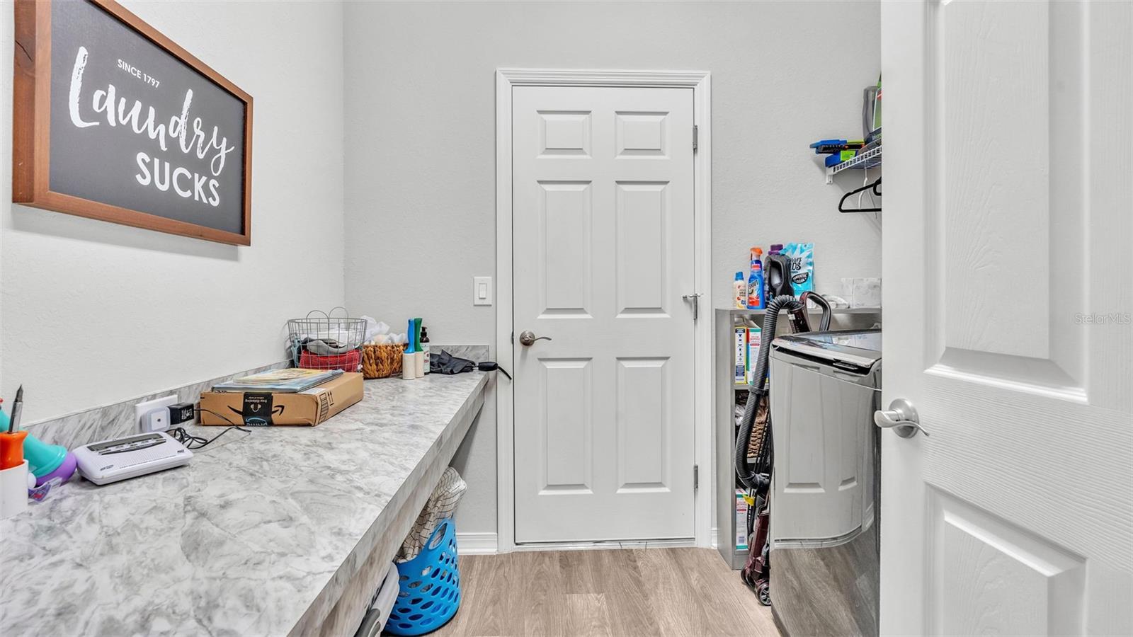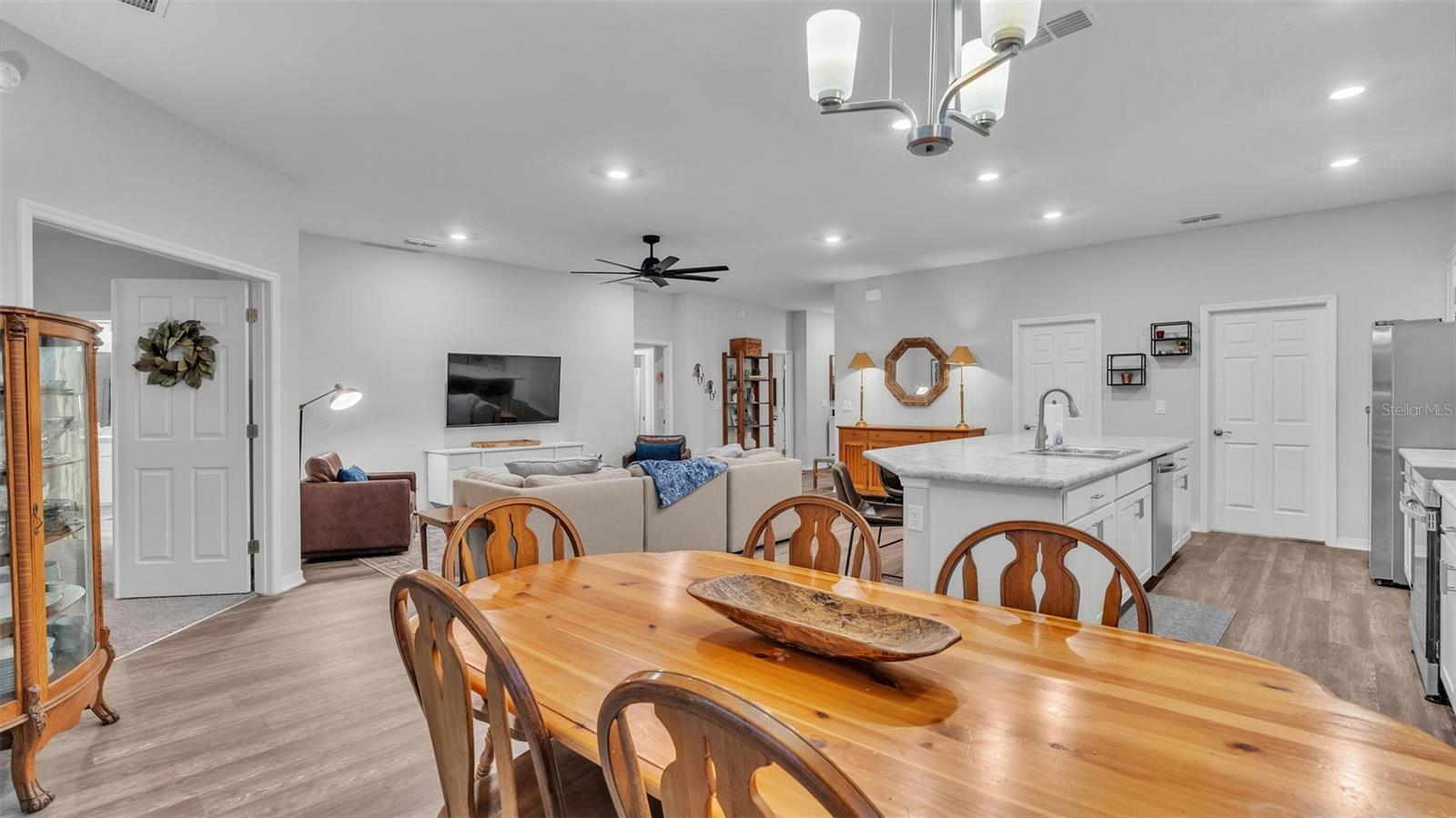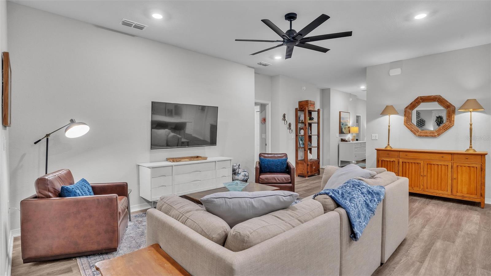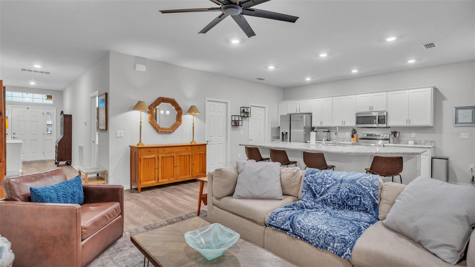 This stunning home offers 4 bedrooms, 2.5 bathrooms located in the Auburn Cove subdivision. The open floor plan is a popular design choice for social gatherings. This kitchen is a true showstopper! The cabinets with crown molding add a touch of elegance, while the stainless-steel appliances provide a sleek and modern contrast. The large, oversized kitchen island offers ample counter space and storage, making it perfect for food preparation and cooking and with the oversized walk-in pantry, you'll have plenty of room to store all your ingredients and cooking essentials, making meal prep a breeze. The thoughtful selection of flooring in this home prioritizes both style and practicality. The living area, laundry room, and bathrooms boast luxurious wood vinyl plank flooring, adding a touch of sophistication and elegance. Meanwhile, the stain-resistant carpet in the remaining areas provides a comfortable and low-maintenance option for everyday use. The luxurious owner's suite offers a serene retreat with ample space for relaxation and pampering. The walk-in wardrobe provides ample storage for one's personal style, while the private en-suite bath features dual vanities, a refreshing tiled shower, a romantic garden bathtub, and a convenient closeted toilet, creating a haven of comfort and tranquility. This home offers a relaxing outdoor living space with a covered lanai, perfect for enjoying the fresh air and scenic views while staying protected from the elements. The water softener is a convenient feature that ensures clean and soft water throughout the home as well as energy-efficient insulation and windows, while the oversized vinyl fenced-in backyard provides a secure and private outdoor area for endless play. Situated just minutes away from the Polk Parkway and I-4. Located between Orlando & Tampa. Also, close proximity to shopping and dining establishments ensures convenience and easy access to everyday necessities. Schedule a showing today and make this dream home your reality.