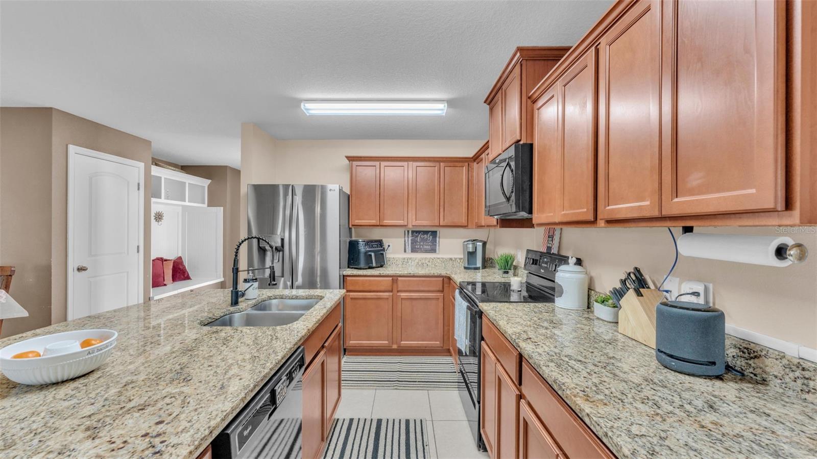 Inside, you'll find an open floor plan with plenty of natural light. The kitchen features ample cabinetry, granite countertops, and a functional layout, perfect for cooking or entertaining. The living area flows seamlessly to a private outdoor space--ideal for morning coffee or unwinding after a long day. The split-bedroom layout offers privacy, with the spacious bedrooms located on opposite sides of the home for maximum comfort. An indoor laundry room adds extra convenience.