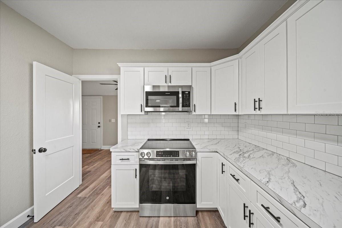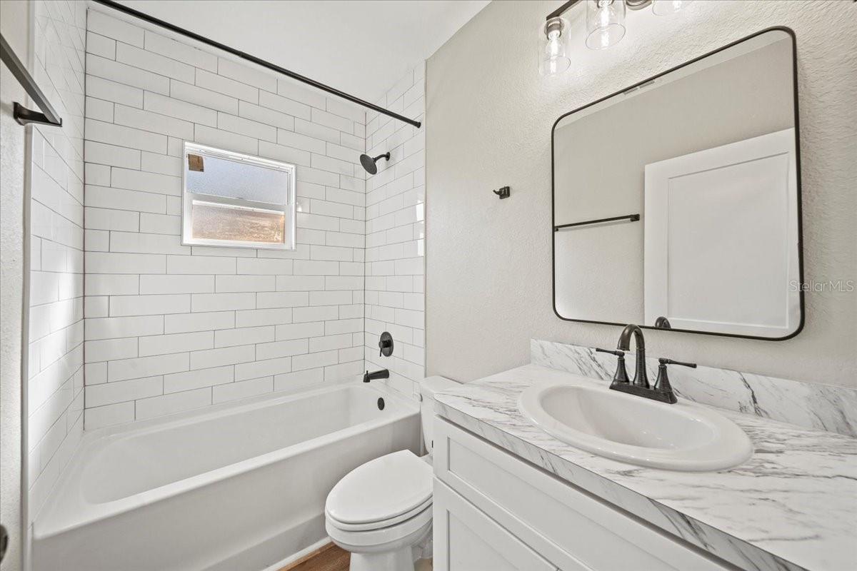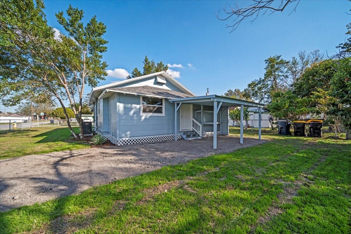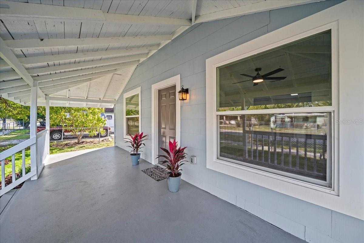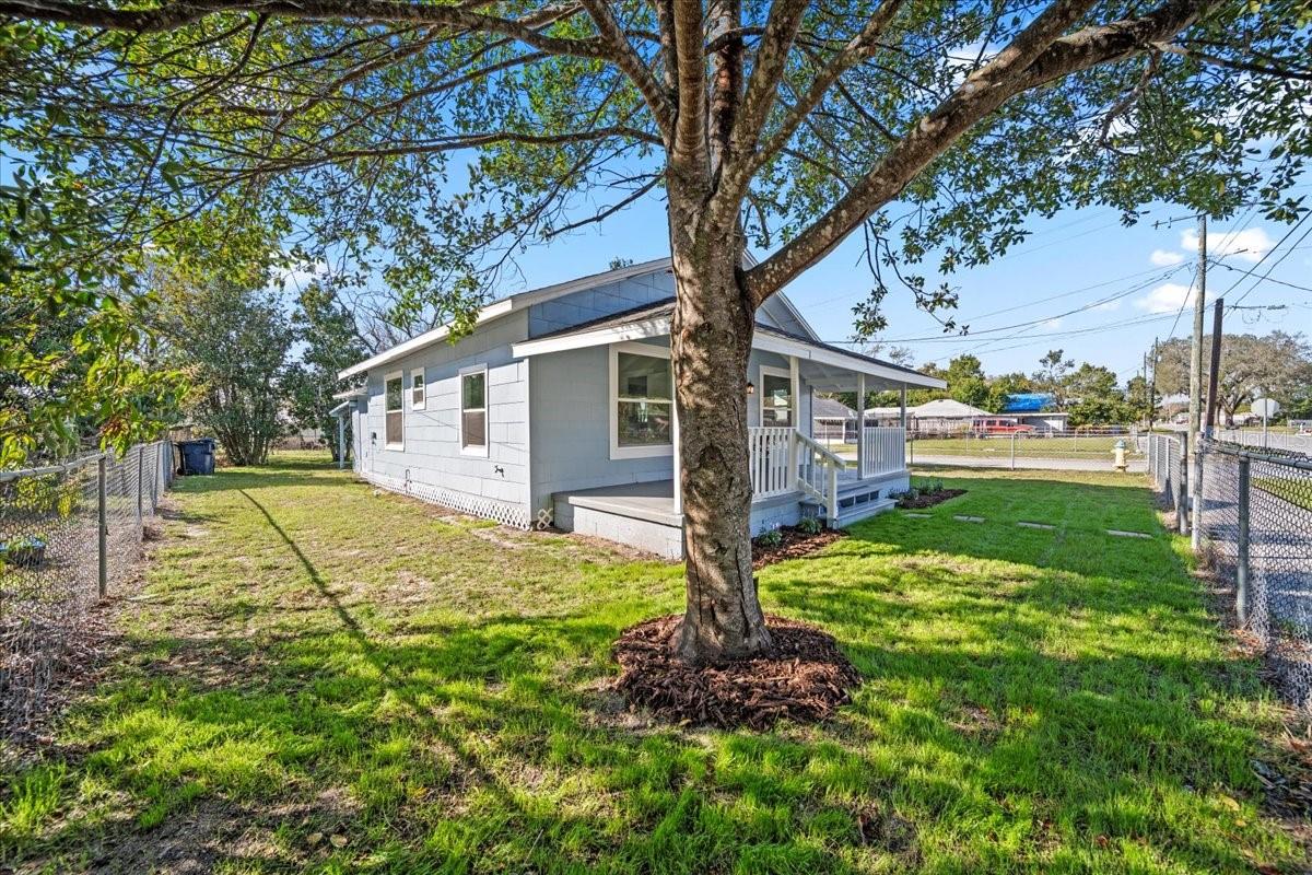 This beautifully remodeled historic 3-bedroom, 1-bathroom home is full of charm and modern updates. Situated on a corner lot, the property features a large front porch that overlooks a spacious, fully fenced yard, perfect for outdoor activities. Upon entering, you'll step into the cozy living room, complete with a ceiling fan and large windows that fill the space with natural light. The entire home boasts sleek wood-look luxury vinyl plank flooring, adding to its inviting atmosphere. The entirely remodeled kitchen is a highlight, offering brand-new cabinets, brand-new stainless steel appliances, and a stylish subway-tiled backsplash. A window above the sink provides a view of the side yard, bringing in more light and a pleasant breeze. The kitchen has ample space for a dining table, creating a great spot for family meals. The first and second bedrooms share a hallway bathroom featuring a fully tiled bathtub and shower combo, as well as an upgraded vanity. The third bedroom, which could easily serve as an office, is located just past the kitchen. Adjacent to it is the laundry room, where you'll find the brand-new water heater. The back door opens to a carport and a generously sized yard with a gated entrance and the benefit of a mature, fruiting avocado and pecan tree, while offering plenty of room for parking or outdoor enjoyment. This home has been thoughtfully updated with a brand-new AC, roof, and all new plumbing supply lines and water traps. It's connected to sewer, and the electrical system has been completely rewired with a new panel and breaker box, featuring GFCI protection for added safety. This home also boasts a brand-new roof and AC unit, ensuring peace of mind for the new homeowners. Easy to show and move in ready for its next owner, this home is a must-see. Schedule your tour today!