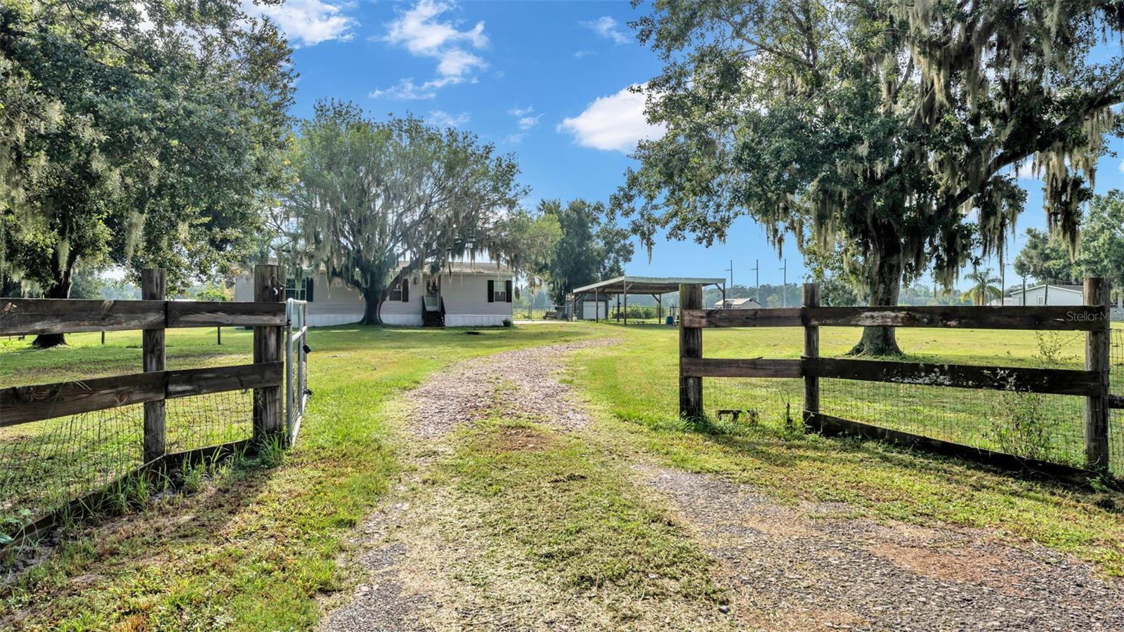 One or more photo(s) has been virtually staged. Nearly 5 acres of fenced and cross-fenced land offering privacy and room to spread out. This 3-bedroom, 2 bath split plan home features an open living and dining area filled with natural light and a large, screened lanai overlooking the property. The private primary suite includes a walk-in closet, granite counters, soaking tub, and separate shower. Two additional bedrooms share a hall bath, and there is an indoor laundry for convenience. Outside you'll find a 2-car carport and detached garage/workshop, plus plenty of space for animals, gardens, or outdoor projects. This corner lot property gives you the freedom of country living while still being just minutes from shopping, dining, and major roadways.