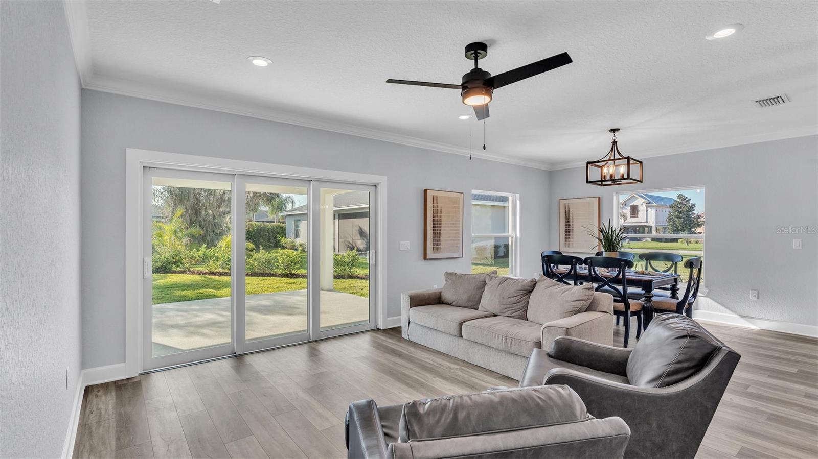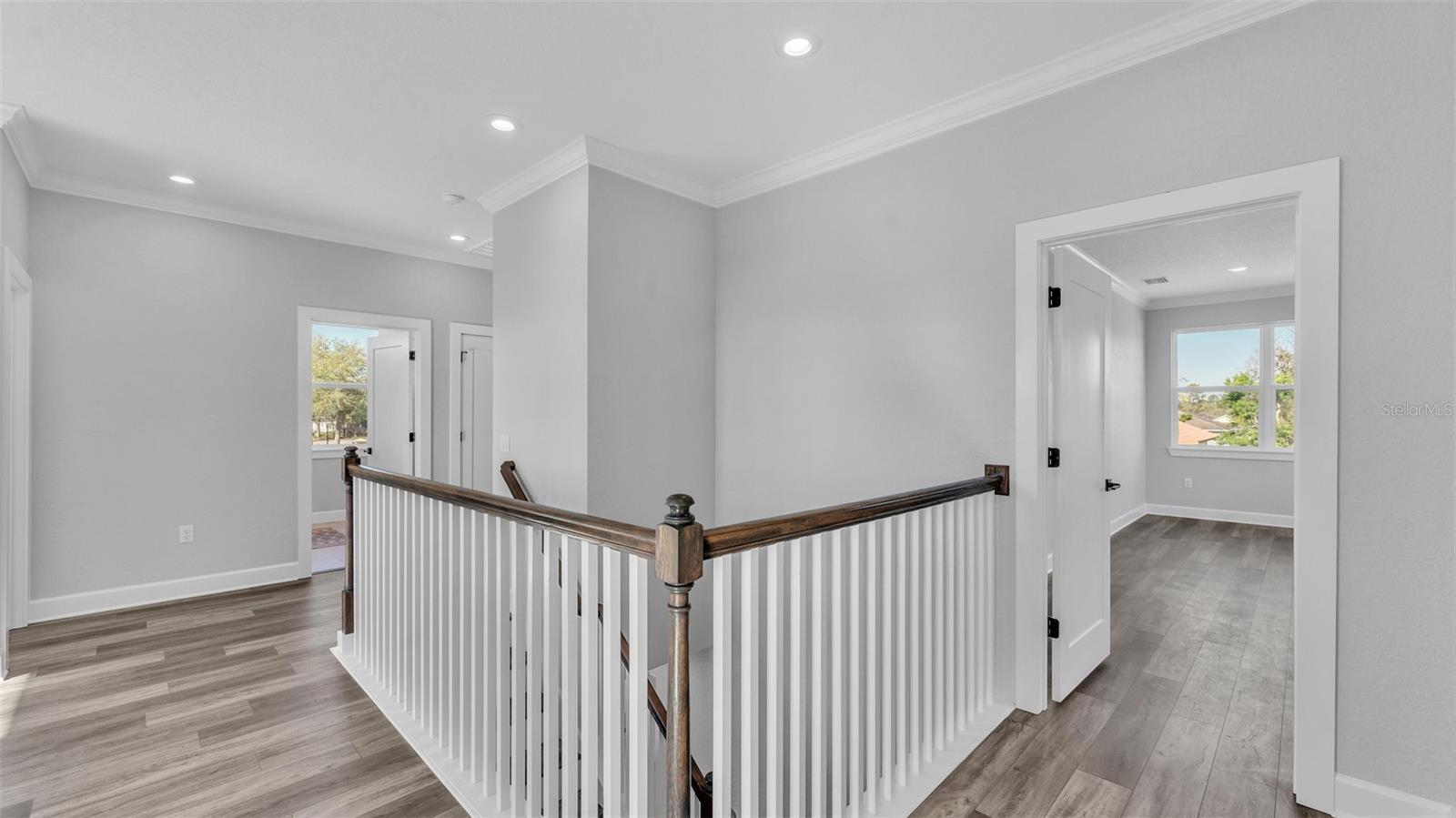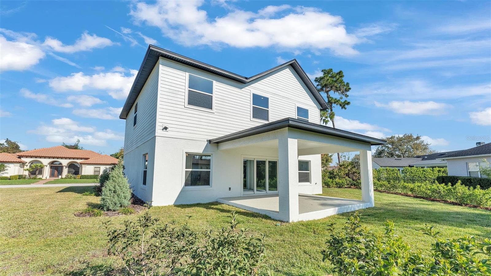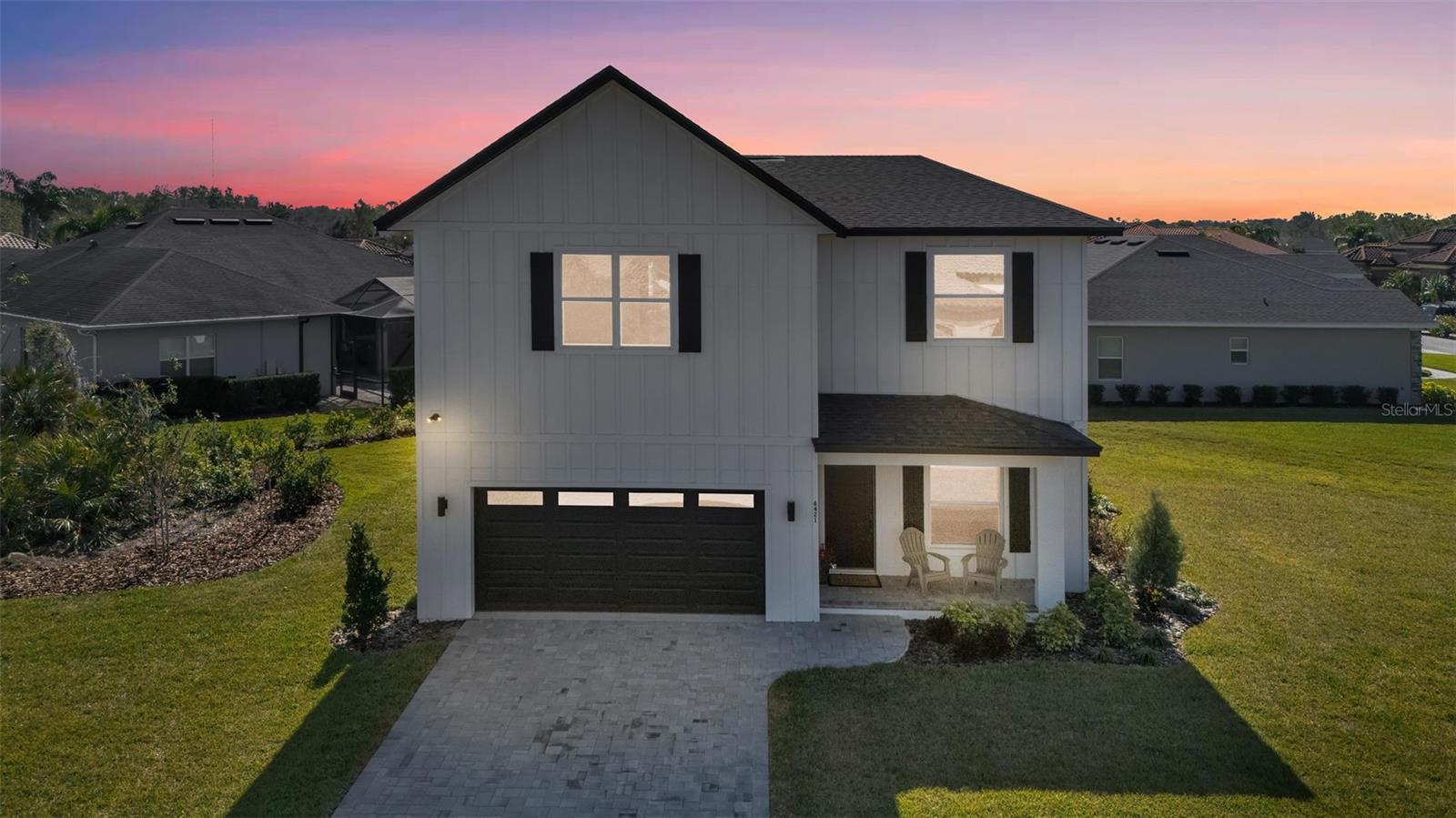 Welcome to 6421 Highlands Oak Trail, a stunning brand-new custom-built home, recently completed, offering 5-bedrooms and 3-bathrooms with an additional flex room, located in the gated community of Hallam Preserve East. This exquisite two-story residence boasts impressive curb appeal, featuring a pavered driveway and a charming front porch perfect for seating and enjoying the neighborhood's serene atmosphere. Ideally positioned in South Lakeland, this home offers easy access to local schools, dining, shopping, and the nearby Publix shopping center. Just off 540A and only minutes from the Polk Parkway, convenience is at your doorstep. The community itself offers fantastic amenities, including an on-site playground and pool, providing a perfect setting for relaxation and recreation. Step inside to discover an open and inviting foyer, leading to a flexible room that can serve as a formal dining area, complete with a large window overlooking the front yard. You'll notice the luxury vinyl plank flooring throughout with the decorative crown molding. This home offers an open and split bedroom floor plan, ensuring privacy and flow throughout. Continue further into the home, where you'll find the heart of the house: a beautifully designed kitchen featuring stainless steel appliances, granite countertops, and a generously sized corner pantry. The kitchen overlooks the spacious living area, which is flooded with natural light from an abundance of windows. Triple sliding glass doors open to an expansive lanai, perfect for enjoying the outdoors in a tranquil, private setting. The backyard is beautifully landscaped, offering a serene environment for relaxation. With five bedrooms and three bathrooms, this home provides plenty of space for the entire family. The first floor includes a guest bedroom and a bathroom with a beautifully tiled shower, providing a welcoming space for visitors. Additionally, there's plenty of room for a work-from-home office, offering a perfect balance of comfort and functionality. Upstairs, the primary suite awaits, offering a spa-like ensuite bathroom with a freestanding tub, dual vanity, a step-in tiled walk-in shower, and an expansive walk-in closet. The upstairs area is a true highlight, featuring a wooden-railed balcony, a secondary living space, ample closet storage, and three additional generously sized bedrooms, each with built-in closets. A third full bathroom is conveniently located in the hallway. The garage is ready to store your vehicles and tools with the addition of epoxy flooring. This home has been meticulously designed for comfort and elegance, and with the opportunity to be the first owner, it's truly a rare find. Schedule your showing today and experience the luxury and convenience of this exceptional property!