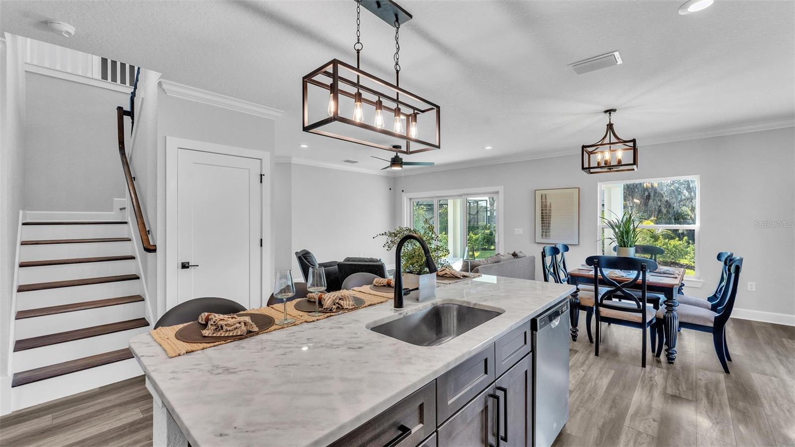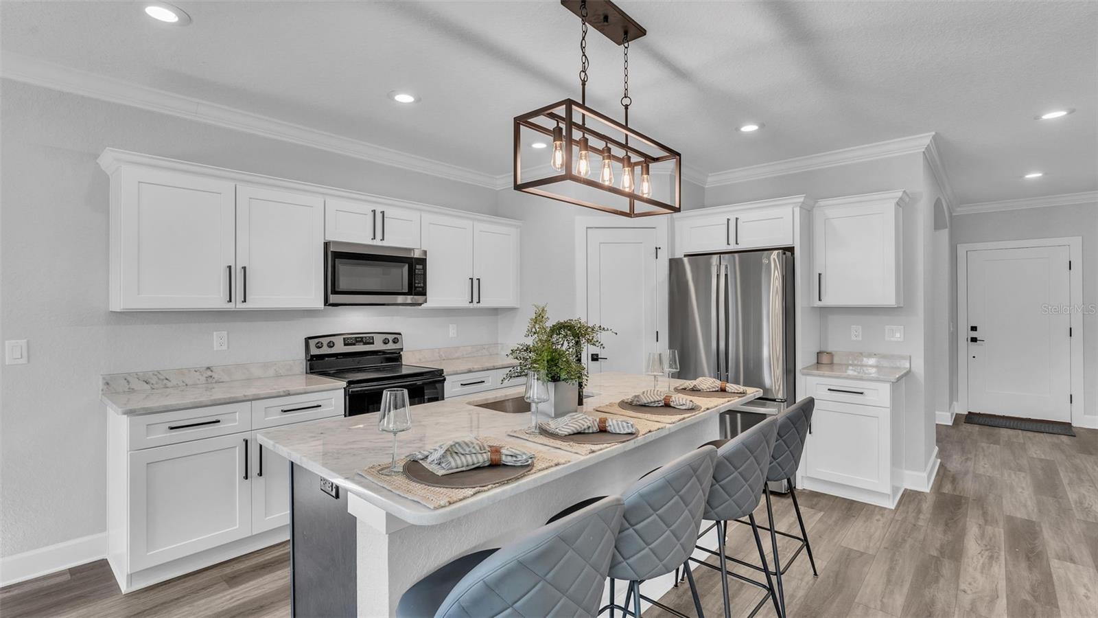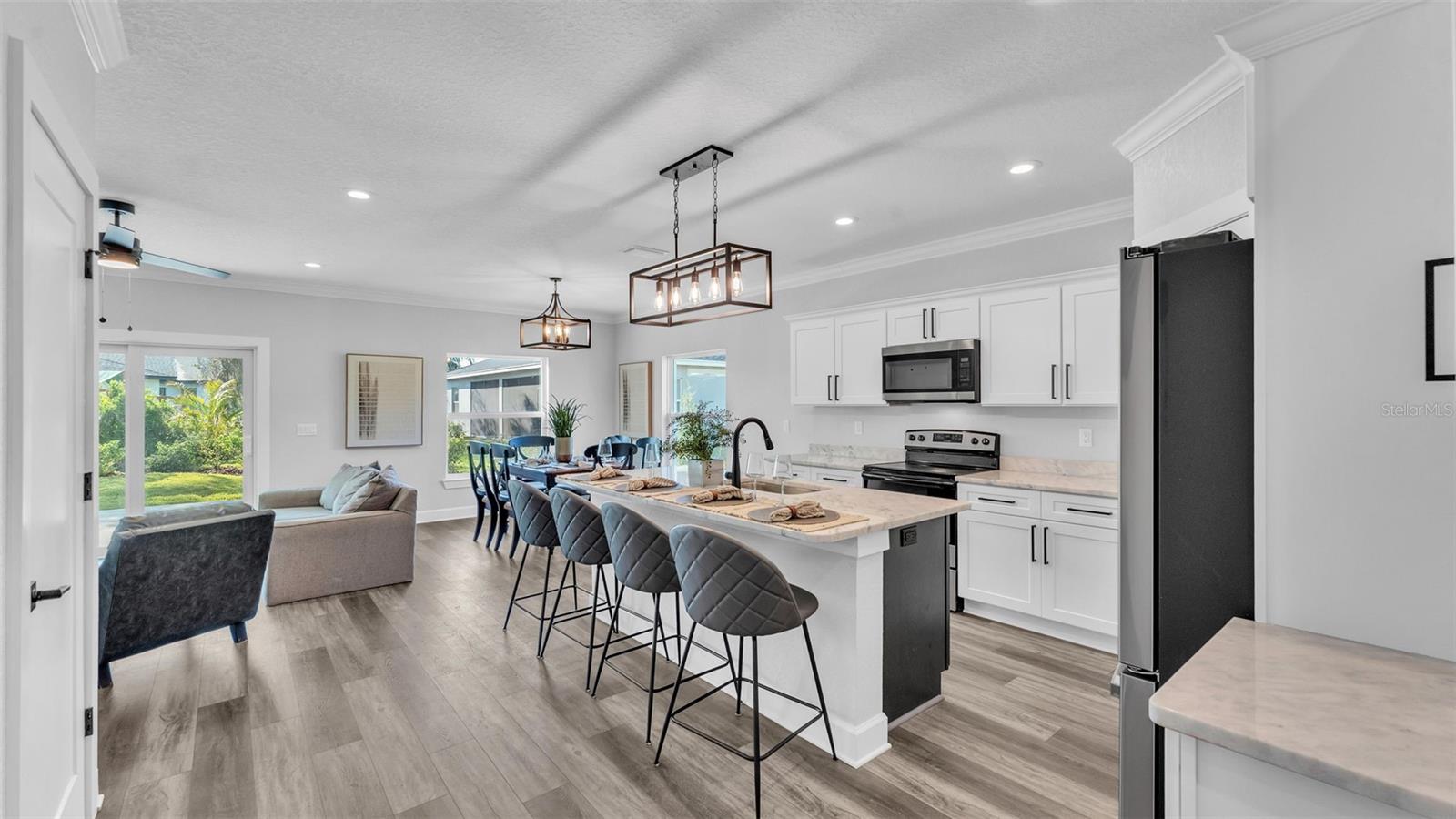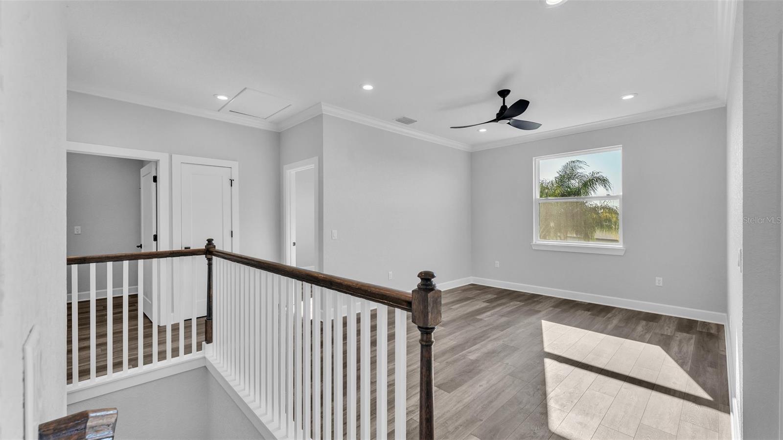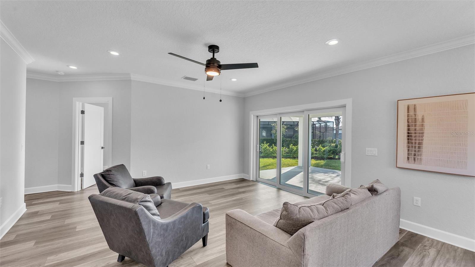 Welcome to 6421 Highlands Oak Trail, a stunning brand-new custom-built home, recently completed, offering 5-bedrooms and 3-bathrooms with an additional flex room, located in the gated community of Hallam Preserve East. This exquisite two-story residence boasts impressive curb appeal, featuring a pavered driveway and a charming front porch perfect for seating and enjoying the neighborhood's serene atmosphere. Ideally positioned in South Lakeland, this home offers easy access to local schools, dining, shopping, and the nearby Publix shopping center. Just off 540A and only minutes from the Polk Parkway, convenience is at your doorstep. The community itself offers fantastic amenities, including an on-site playground and pool, providing a perfect setting for relaxation and recreation. Step inside to discover an open and inviting foyer, leading to a flexible room that can serve as a formal dining area, complete with a large window overlooking the front yard. You'll notice the luxury vinyl plank flooring throughout with the decorative crown molding. This home offers an open and split bedroom floor plan, ensuring privacy and flow throughout. Continue further into the home, where you'll find the heart of the house: a beautifully designed kitchen featuring stainless steel appliances, granite countertops, and a generously sized corner pantry. The kitchen overlooks the spacious living area, which is flooded with natural light from an abundance of windows. Triple sliding glass doors open to an expansive lanai, perfect for enjoying the outdoors in a tranquil, private setting. The backyard is beautifully landscaped, offering a serene environment for relaxation. With five bedrooms and three bathrooms, this home provides plenty of space for the entire family. The first floor includes a guest bedroom and a bathroom with a beautifully tiled shower, providing a welcoming space for visitors. Additionally, there's plenty of room for a work-from-home office, offering a perfect balance of comfort and functionality. Upstairs, the primary suite awaits, offering a spa-like ensuite bathroom with a freestanding tub, dual vanity, a step-in tiled walk-in shower, and an expansive walk-in closet. The upstairs area is a true highlight, featuring a wooden-railed balcony, a secondary living space, ample closet storage, and three additional generously sized bedrooms, each with built-in closets. A third full bathroom is conveniently located in the hallway. The garage is ready to store your vehicles and tools with the addition of epoxy flooring. This home has been meticulously designed for comfort and elegance, and with the opportunity to be the first owner, it's truly a rare find. Schedule your showing today and experience the luxury and convenience of this exceptional property!