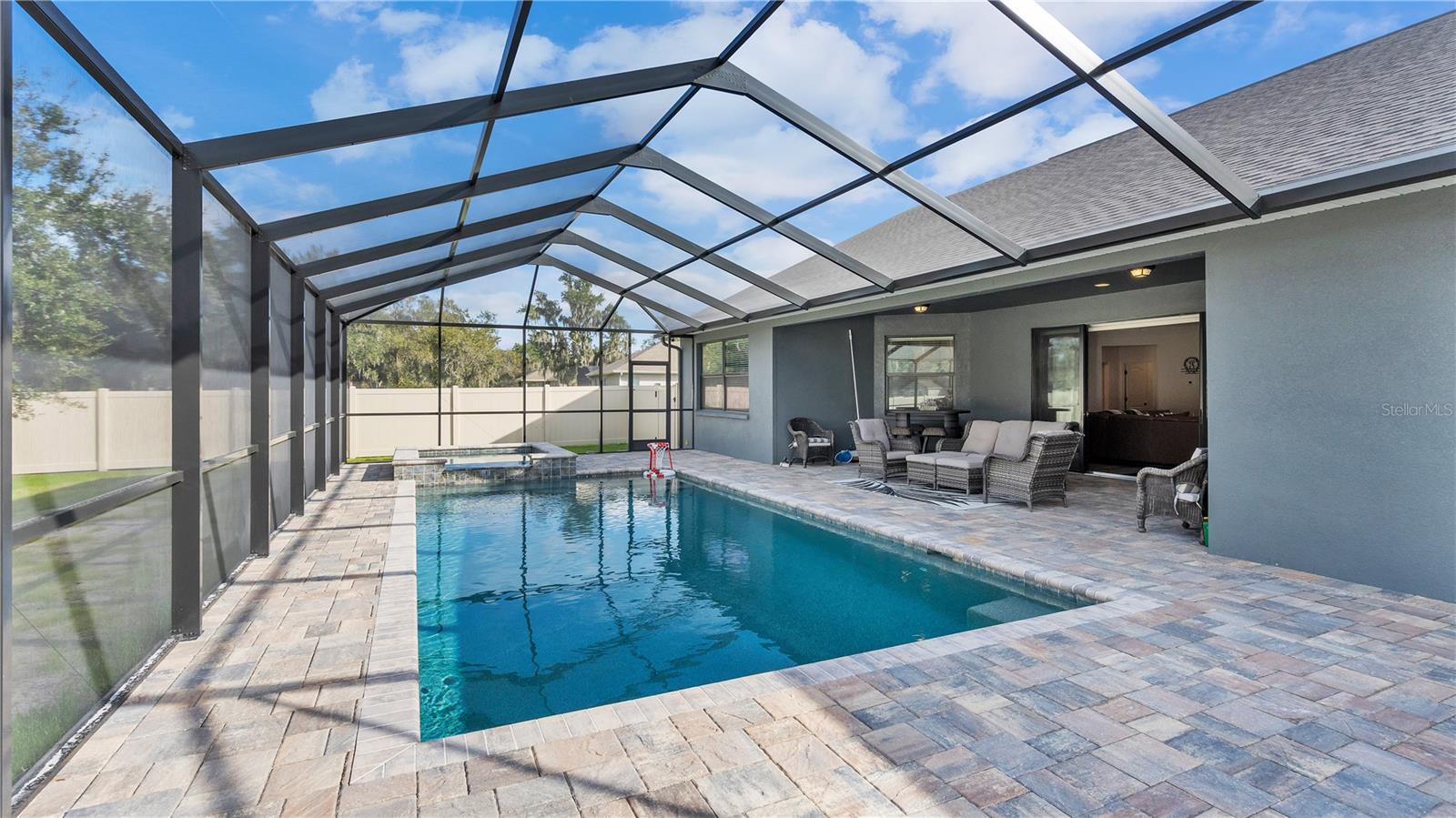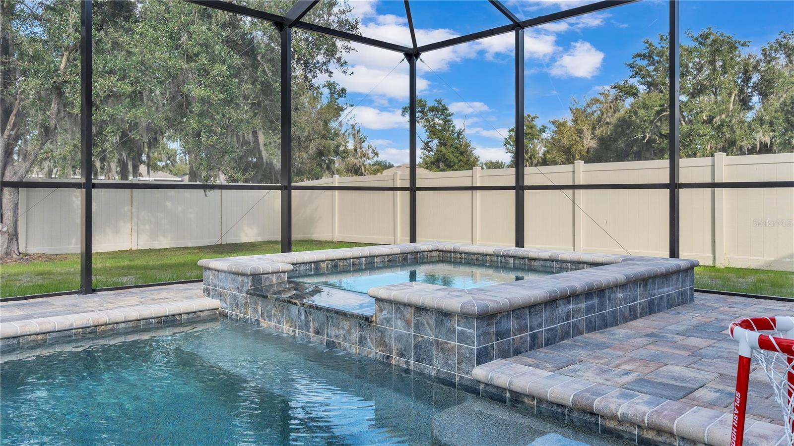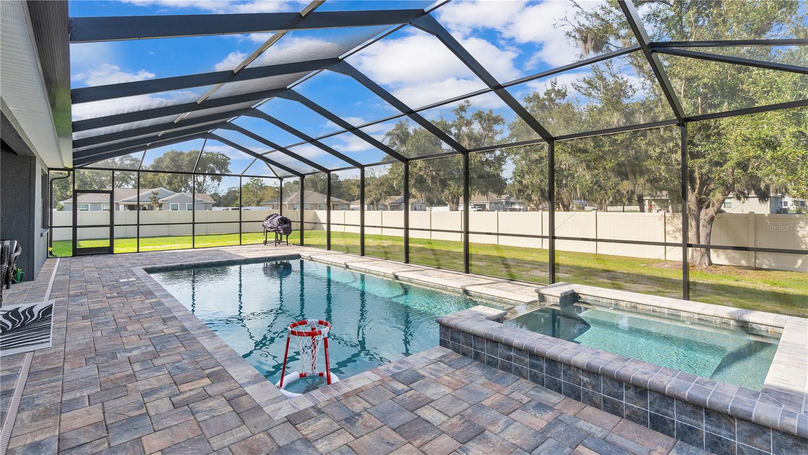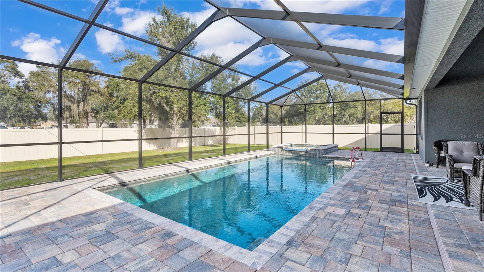 Welcome to this exquisite and recently enhanced modern residence situated on a sprawling .78-acre lot at the cul-de-sac within the gated community of English Creek by Southern Homes. This residence offers a total of 5 bedrooms and 3 bathrooms, providing ample space for family and guests. With upgraded luxury vinyl plank flooring gracing the main living areas, this home seamlessly blends style and functionality. The kitchen boasts dark gray wood crowned cabinetry, granite countertops, and stainless steel appliances, creating a sleek culinary space. Additionally, bar stools may be added to the kitchen island, providing a casual and social space for family and guests. The inviting living room is a focal point of the home, featuring sliding glass doors that open up to the lanai, allowing for a seamless indoor-outdoor transition. Ample windows flood the space with natural light, creating a bright and airy atmosphere, while designed for entertaining and hosting, with a decorative wall and entertainment center with a TV that can be set at any light, creating the perfect ambiance. The primary bedroom suite is a true retreat, featuring a double tray ceiling, two separate walk-in closets, and an ensuite bathroom that includes a step-in tiled glass door shower, a garden tub with jets, and two separate vanities. The guest suite includes its own walk-in closet, enhancing privacy and comfort. The outdoor oasis is equally impressive, featuring a brand new saltwater heated pool and spa with a pavered lanai, all installed within the last few months. Enjoy the inviting poolside atmosphere, complete with beautiful accent lighting, and control the settings conveniently through WiFi on your phone. The oversized corner lot, privacy fence, and large screened-in lanai further contribute to the allure of this home. Practical features, such as boat and RV parking in the driveway or behind fencing, cater to an active lifestyle. The property's location is a commuter's dream, just minutes away from I4, and conveniently close to Publix. This residence offers not only a modern and stylish living space but also the perfect blend of comfort, convenience, and luxury within a secure and gated community, now enhanced by the recent addition of a stunning pool and spa. All appliances and the outdoor television are included, as well as the bar in the 5th bedroom/office are negotiable. Schedule your tour today and feel the welcome of home!