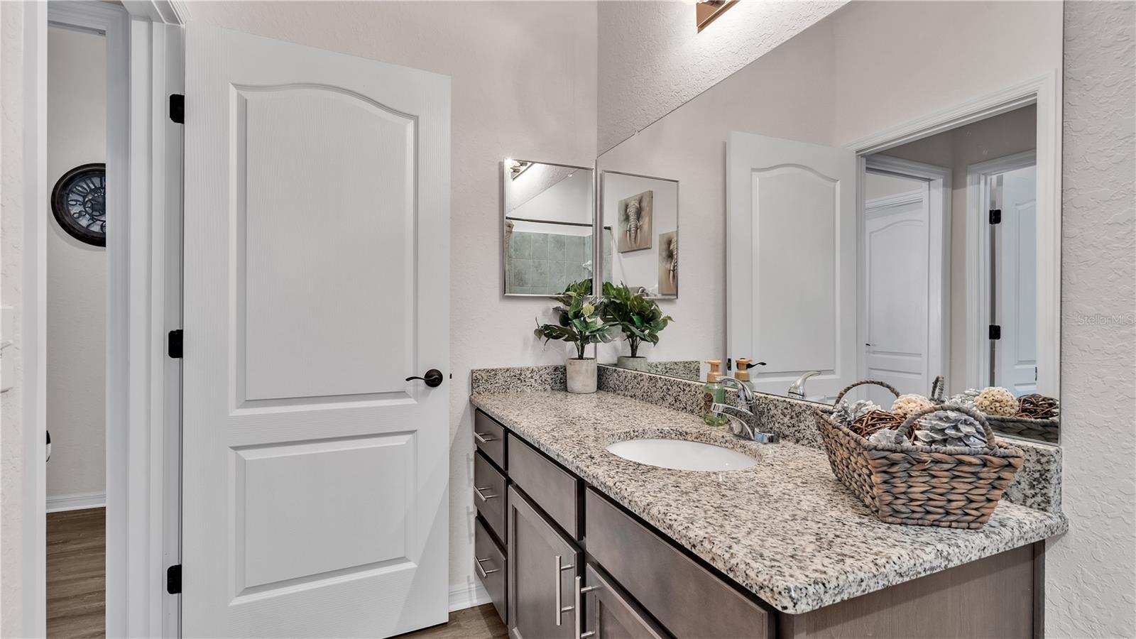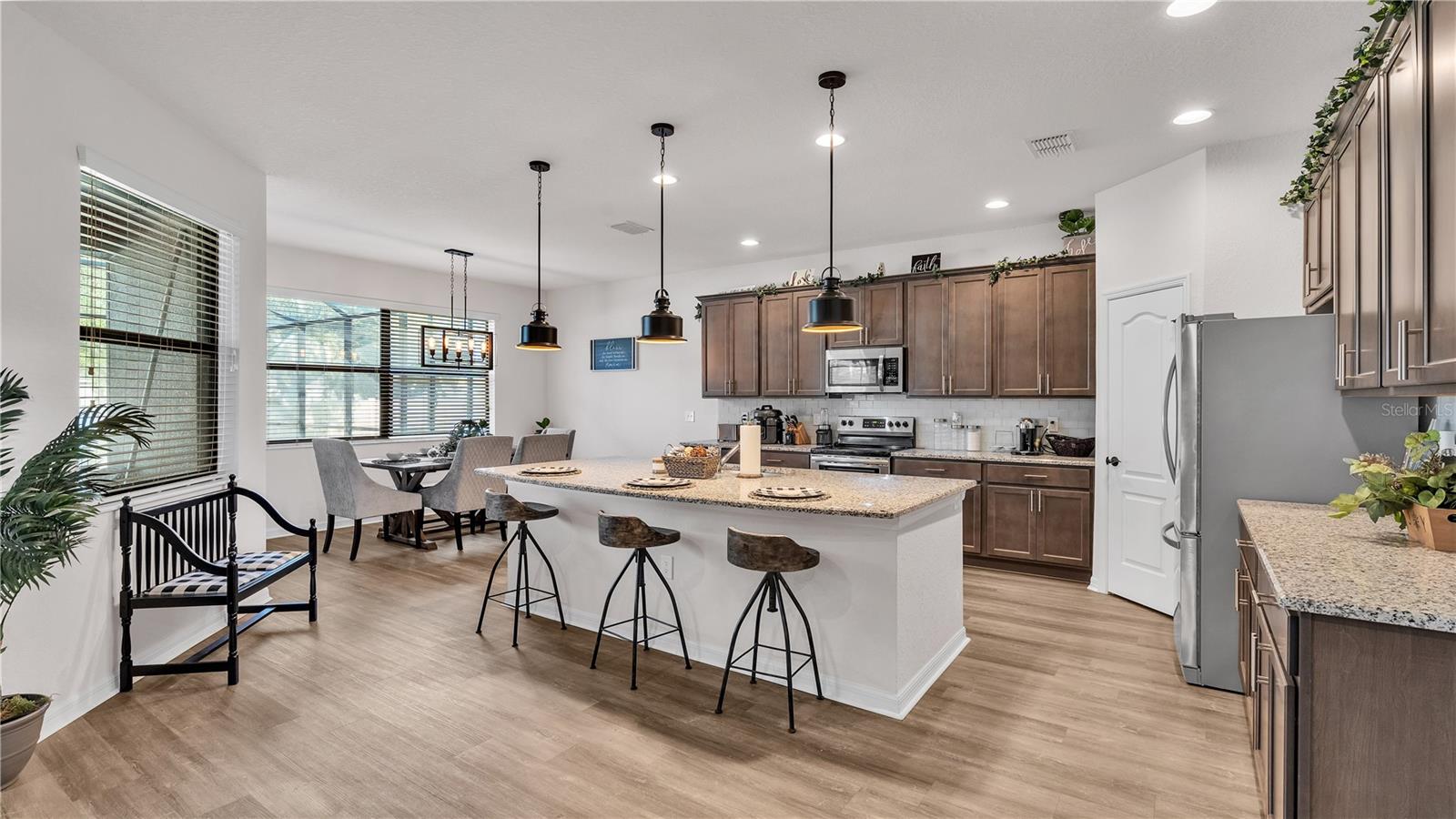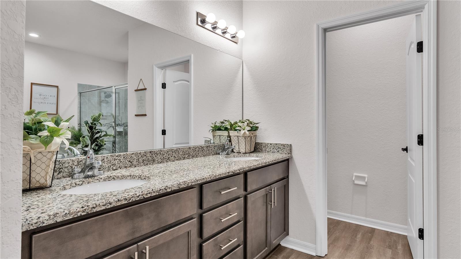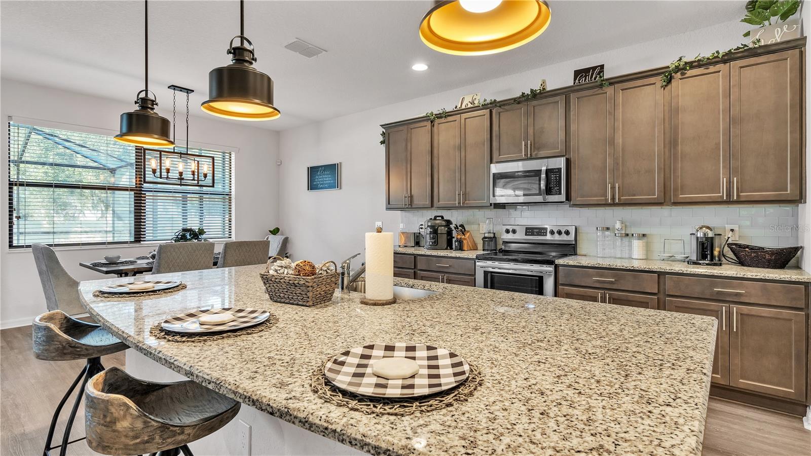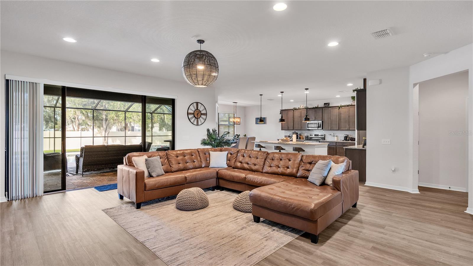 Welcome to this exquisite and recently enhanced modern residence situated on a sprawling .78-acre lot at the cul-de-sac within the gated community of English Creek by Southern Homes. This residence offers a total of 5 bedrooms and 3 bathrooms, providing ample space for family and guests. With upgraded luxury vinyl plank flooring gracing the main living areas, this home seamlessly blends style and functionality. The kitchen boasts dark gray wood crowned cabinetry, granite countertops, and stainless steel appliances, creating a sleek culinary space. Additionally, bar stools may be added to the kitchen island, providing a casual and social space for family and guests. The inviting living room is a focal point of the home, featuring sliding glass doors that open up to the lanai, allowing for a seamless indoor-outdoor transition. Ample windows flood the space with natural light, creating a bright and airy atmosphere, while designed for entertaining and hosting, with a decorative wall and entertainment center with a TV that can be set at any light, creating the perfect ambiance. The primary bedroom suite is a true retreat, featuring a double tray ceiling, two separate walk-in closets, and an ensuite bathroom that includes a step-in tiled glass door shower, a garden tub with jets, and two separate vanities. The guest suite includes its own walk-in closet, enhancing privacy and comfort. The outdoor oasis is equally impressive, featuring a brand new saltwater heated pool and spa with a pavered lanai, all installed within the last few months. Enjoy the inviting poolside atmosphere, complete with beautiful accent lighting, and control the settings conveniently through WiFi on your phone. The oversized corner lot, privacy fence, and large screened-in lanai further contribute to the allure of this home. Practical features, such as boat and RV parking in the driveway or behind fencing, cater to an active lifestyle. The property's location is a commuter's dream, just minutes away from I4, and conveniently close to Publix. This residence offers not only a modern and stylish living space but also the perfect blend of comfort, convenience, and luxury within a secure and gated community, now enhanced by the recent addition of a stunning pool and spa. All appliances and the outdoor television are included, as well as the bar in the 5th bedroom/office are negotiable. Schedule your tour today and feel the welcome of home!