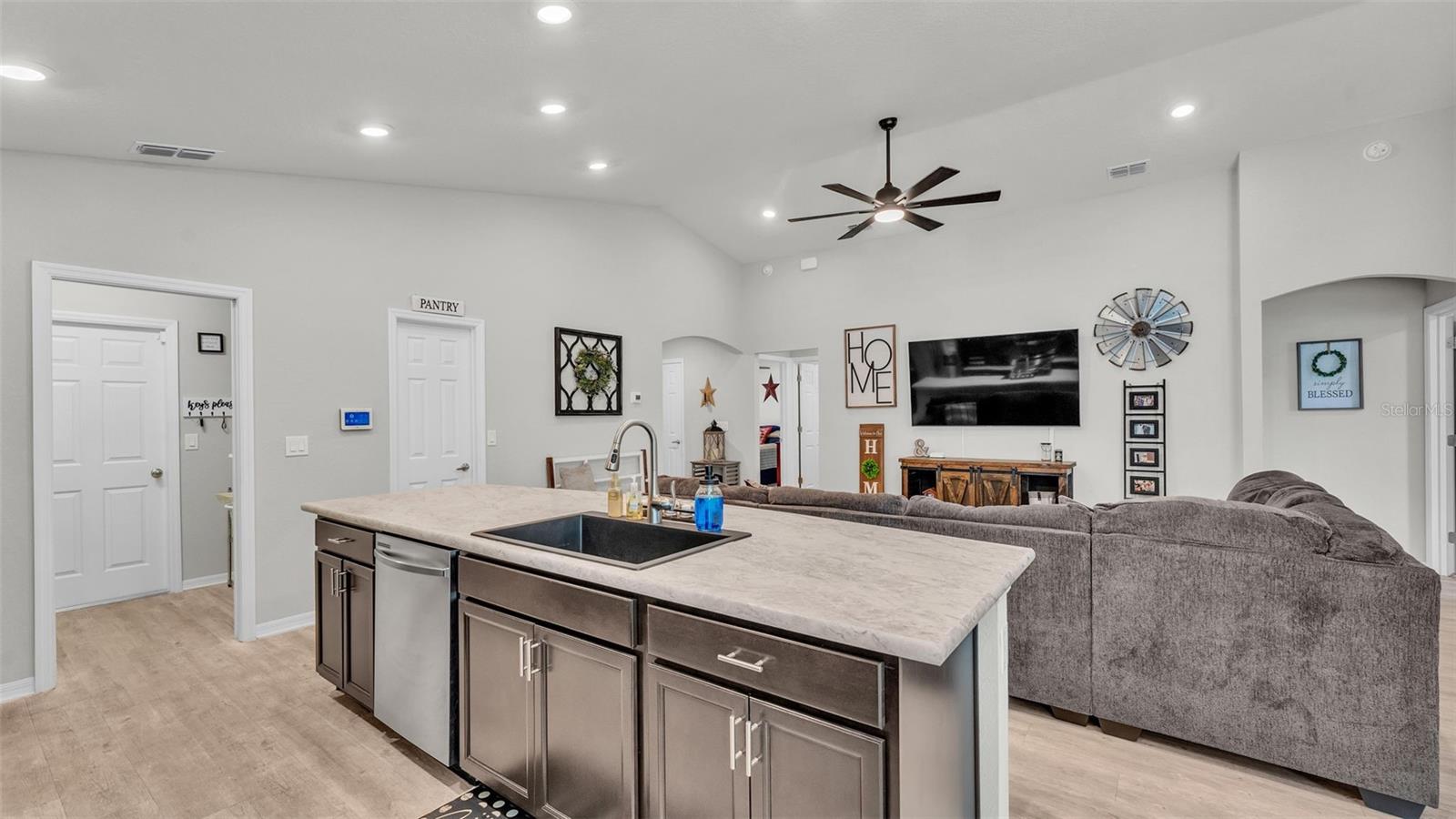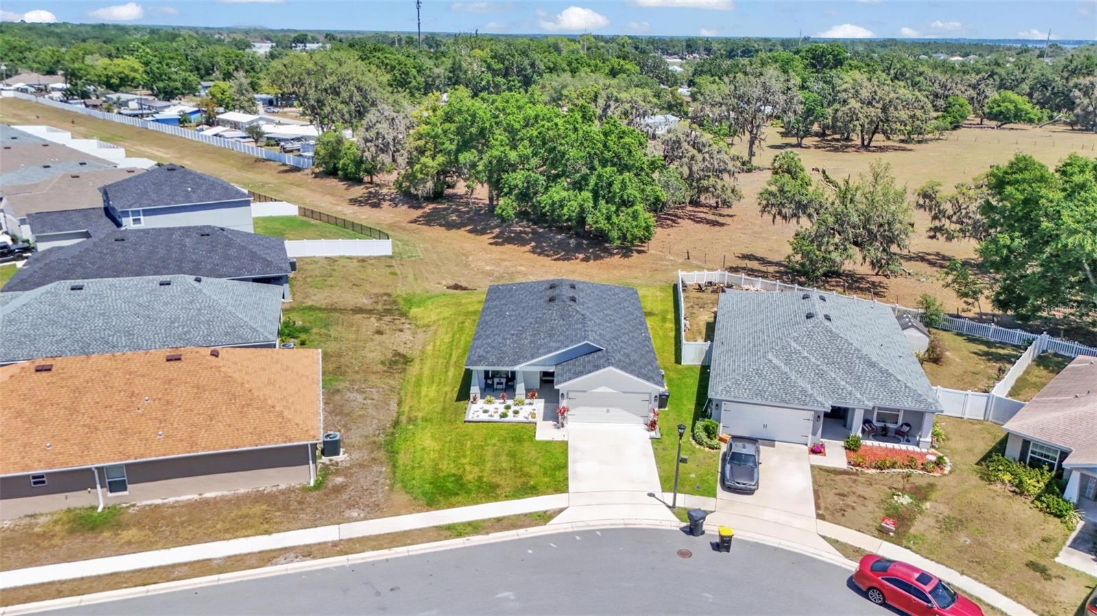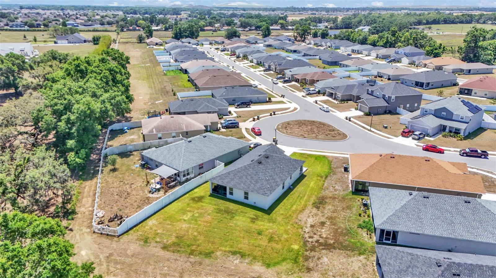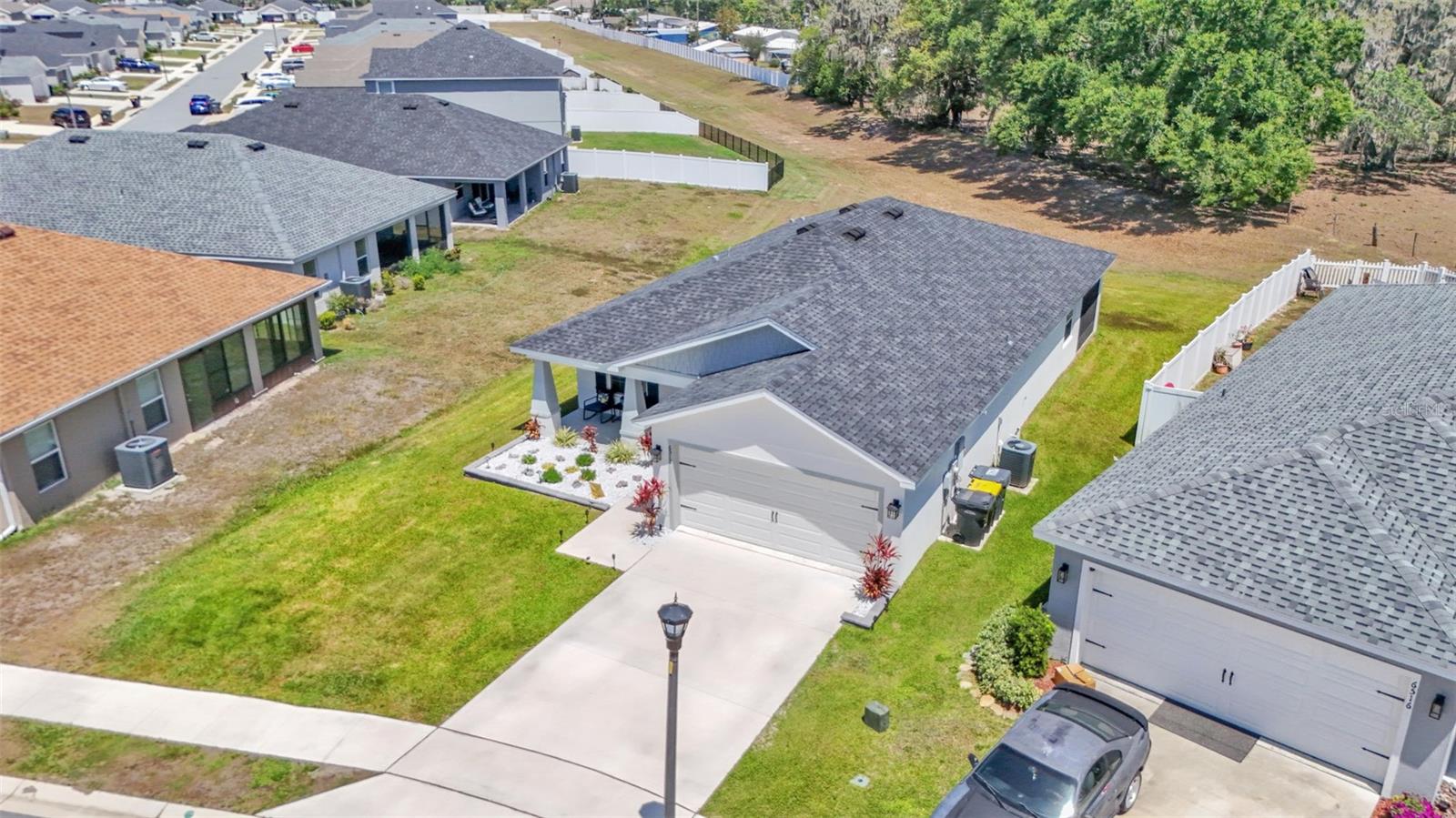 Welcome to this beautifully maintained 2021-built home by Highland Homes, located in the South Lakeland community of Aniston. Nestled on a cul-de-sac lot with no rear neighbors, this home offers both privacy and peaceful views, all while being conveniently close to Bartow Highway, the Polk Parkway, shopping, dining, and more. The Aniston community features sidewalks, perfect for evening strolls or morning jogs. Step through the front door into a spacious open-concept living area highlighted by a vaulted ceiling and luxury vinyl plank flooring with a wood-look finish throughout the common areas. To the left of the entryway, you'll find a hallway leading to two well-sized bedrooms and a guest bathroom. As you continue through the home, the kitchen opens to the living room and features a large island with bar seating, a custom deep farmhouse sink, a tiled backsplash, and a generously sized walk-in pantry. Just off the kitchen is a laundry room complete with cabinet and shelving, providing access to the two-car garage. The primary bedroom is located at the rear of the home for added privacy and boasts a spacious en-suite bathroom with a dual sink vanity, a large walk-in closet, a tiled step-in shower, and an additional deep storage closet. The dining area is situated off the kitchen and flows seamlessly into the living room, which is adorned with recessed lighting and an industrial-style ceiling fan. Step outside through the sliding glass doors to the covered lanai, which overlooks a large, fenced-in backyard--ideal for entertaining or relaxing in your private outdoor space. This home features the popular Parsyn floor plan by Highland Homes and includes newer 2021 appliances, a Google camera-equipped doorbell, and ADT monitoring for added security. Don't miss your chance to tour this move-in ready home in one of Lakeland's sought-after neighborhoods. Schedule your showing today!