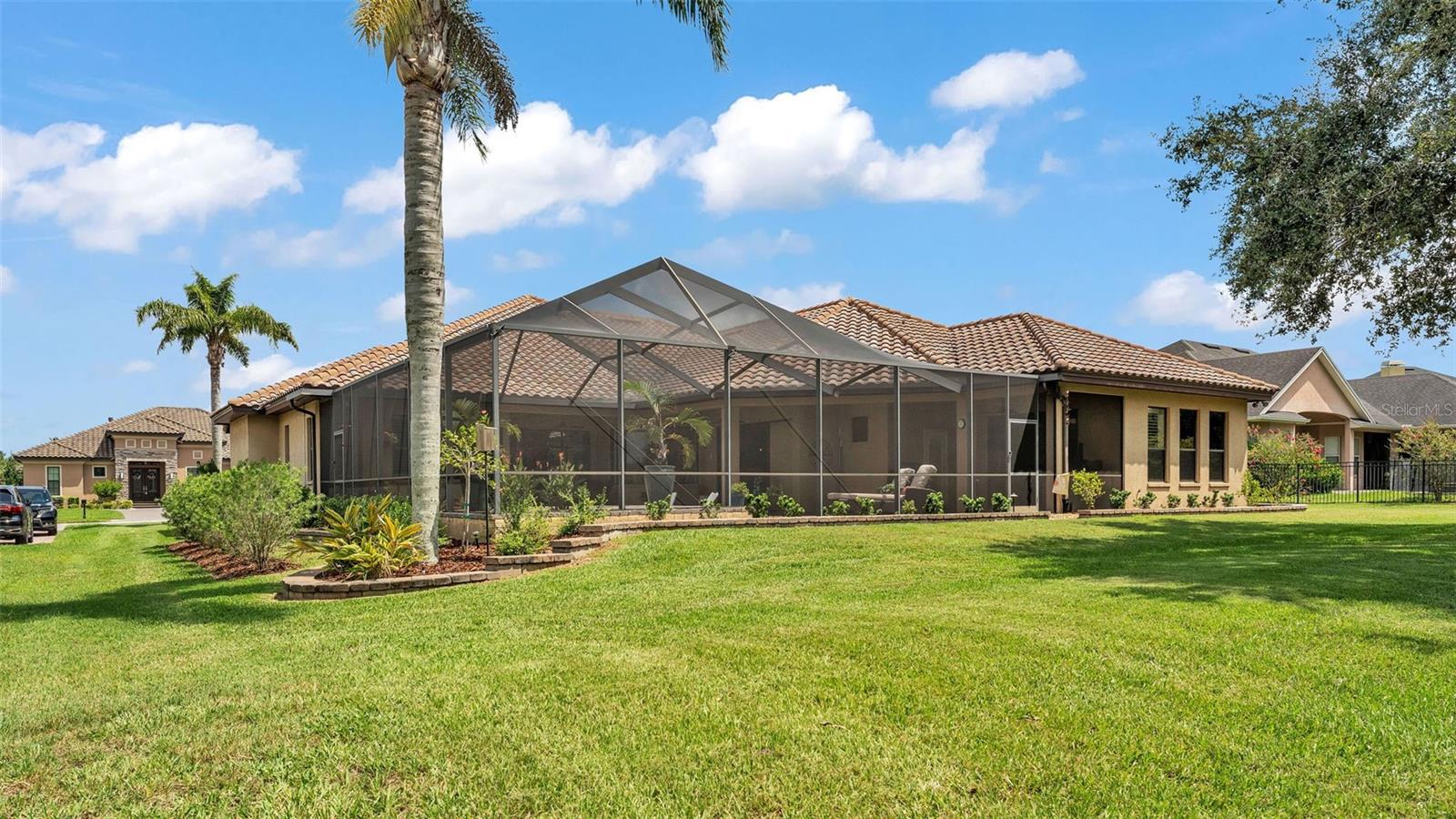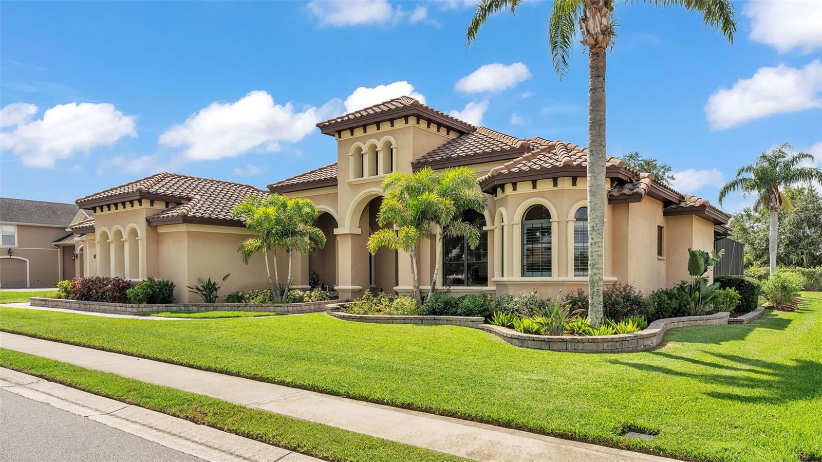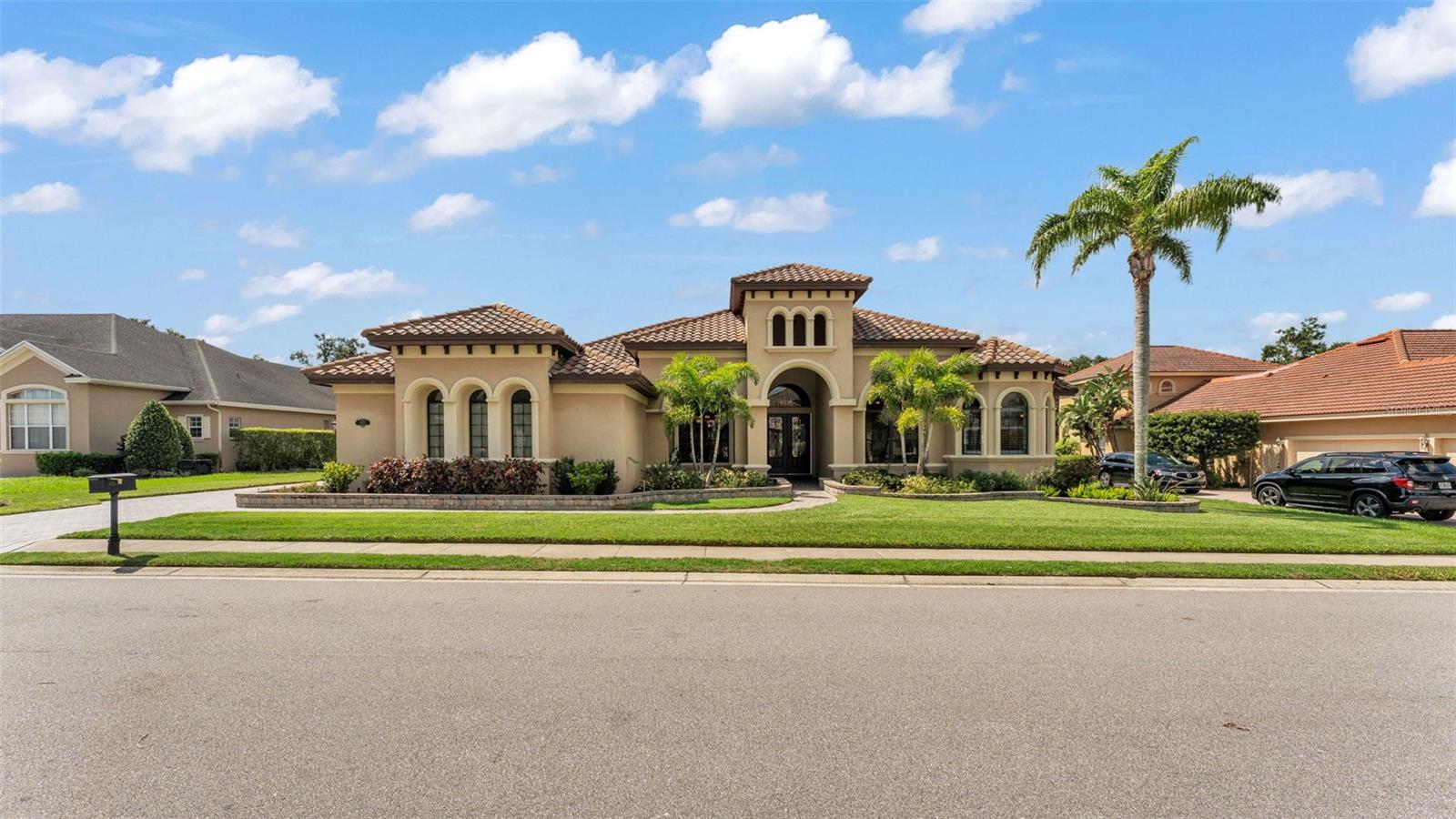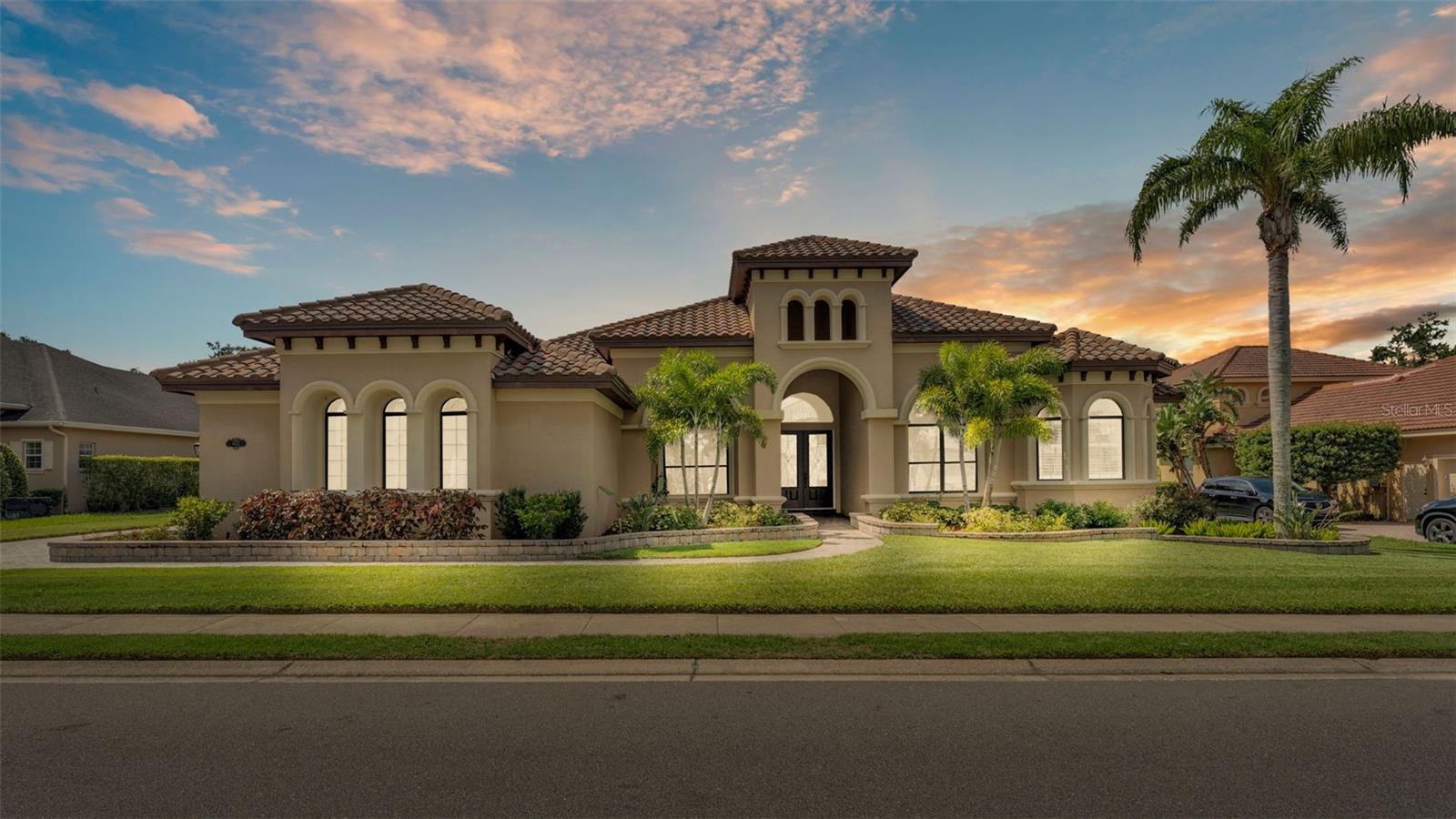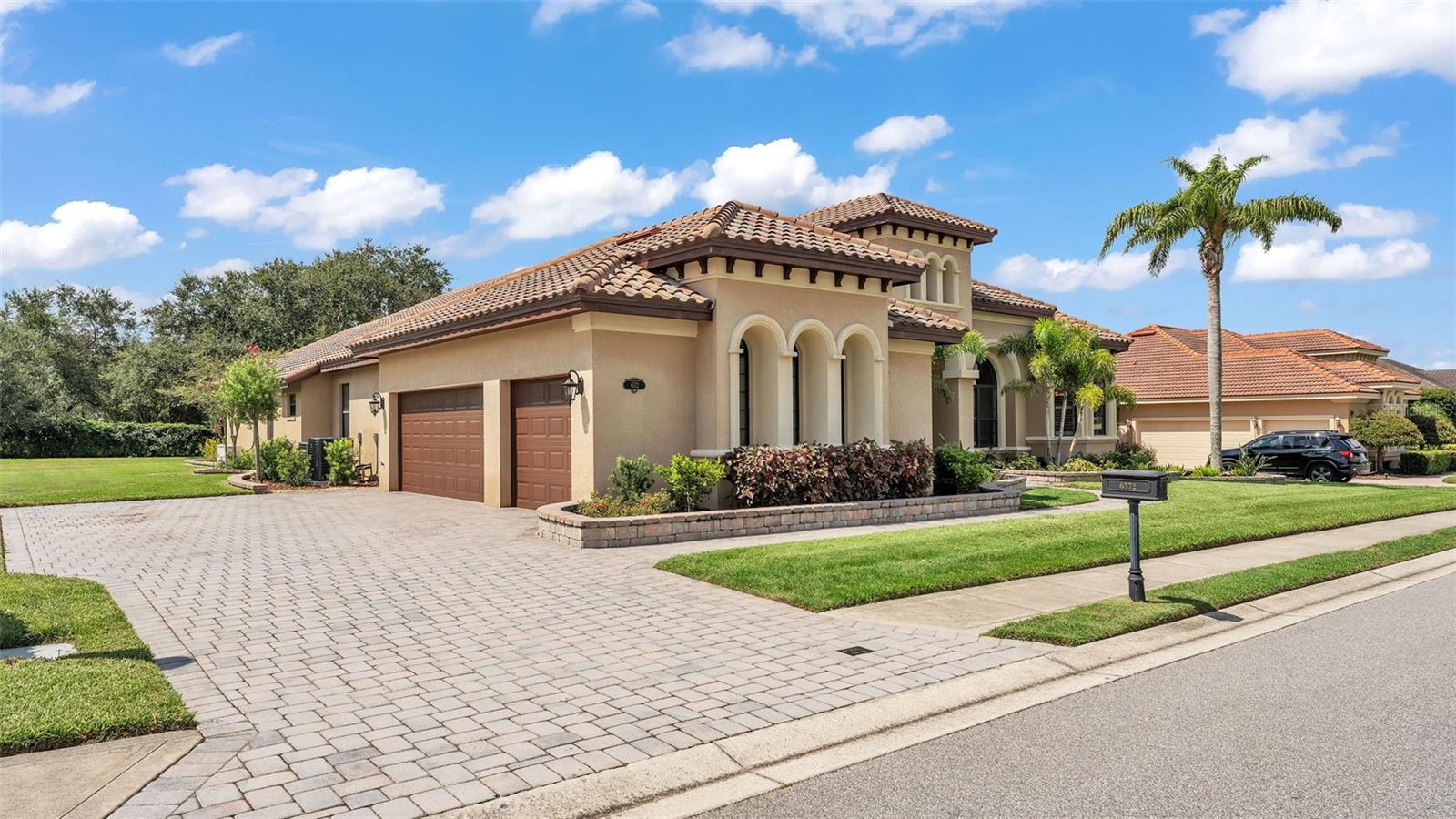 Welcome to 6572 Eagle View Loop, a stunning Mediterranean-style estate nestled in the heart of The Preserve at Eaglebrooke North, one of Lakeland's most sought after 24-hour guarded and gated Country Club communities. This impeccably maintained 5-bedroom, 3.5-bathroom custom home spans 3,546 square feet of refined single-level living and sits on an expansive 0.34-acre lot. Built by award-winning Hulbert Homes, this residence offers the perfect blend of elegance, comfort, and modern convenience. A grand barrel tile roof, paver driveway, and elegant eight-foot double front doors set the stage for the luxury found within. Step inside to discover a freshly repainted interior (August 2025) and rich hardwood flooring added in 2023, complemented by sleek tile throughout the wet and common areas. Every detail is carefully curated from the custom closets by Closets by Design to the classic Florida Plantation Shutters gracing the windows. The gourmet kitchen is the heart of the home, featuring custom wood cabinetry, granite countertops, stainless steel appliances, and a spacious island. A built-in double oven, gas cooktop with decorative hood, and microwave make culinary endeavors a delight, while the breakfast bar comfortably seats four. The adjacent wet bar with a built-in icemaker is perfect for entertaining guests. The living room is anchored by a stunning stone-accented gas fireplace, offering a warm and inviting space to gather. This home also includes a private study and a versatile bonus/theatre room, designed to fit your lifestyle needs. The primary suite is a true retreat, showcasing a spacious bedroom with custom closets and an opulent en-suite bathroom featuring granite counters, abundant cabinetry, a walk-in shower, and eye-catching decorative mirrors. Step into your outdoor paradise with an expansive screen-enclosed lanai with paver flooring, recently refreshed in 2024 with new screening, tie-downs, and three new outdoor fans in 2025. Enjoy Florida's year-round sunshine by the beach entry pool, a resort-style feature with a gradual, walk-in slope that mimics the shoreline of a tropical beach. This luxurious pool is enhanced with a sun shelf, soothing fountains, and two built-in seating areas for ultimate relaxation. A tranquil waterfall completes this private backyard oasis. Notable upgrades include a full-home Generac 26kW generator (2024), water softener and reverse osmosis system (2023), and a Bosch 800 dishwasher (2023). The pool pump, salt system, and valves were also updated in 2023, ensuring peak performance. Two brand-new AC systems were installed in August 2025 for optimal climate control year-round. Additional features include a beautifully landscaped Zoysia lawn with upgraded outdoor lighting (2024), and a new ice machine added in 2025 for everyday convenience. The oversized three-car garage offers plenty of space for vehicles and storage, while the meticulously serviced irrigation system keeps the grounds lush and vibrant. Residents of Eaglebrooke enjoy access to a 4 1/2-Star Championship Golf Course, Junior Olympic swimming pool, tennis, pickleball courts, and a clubhouse with formal dining, sports bar, event space, and a fully stocked pro shop, all with available membership options. Luxury, comfort, and resort-style living await you at 6572 Eagle View Loop where every detail has been thoughtfully crafted for the most discerning homeowner.