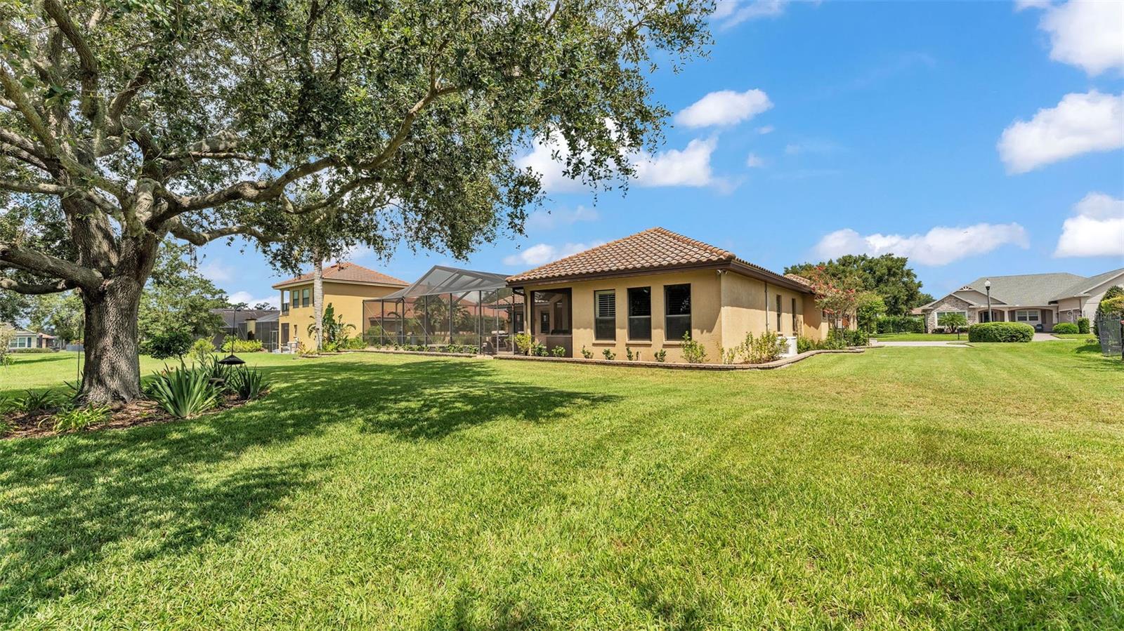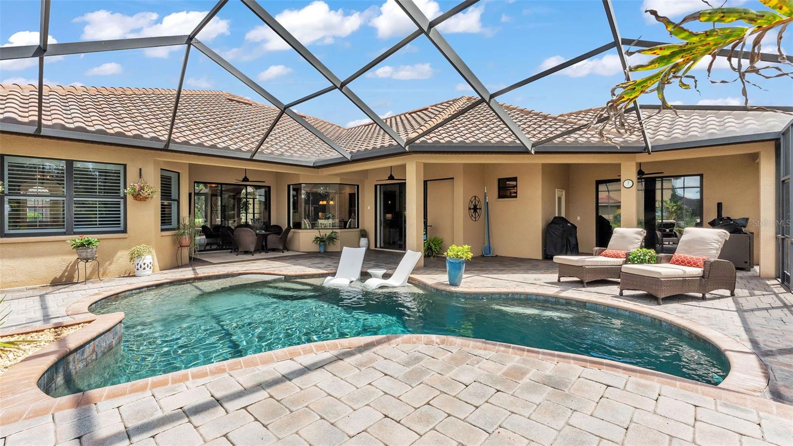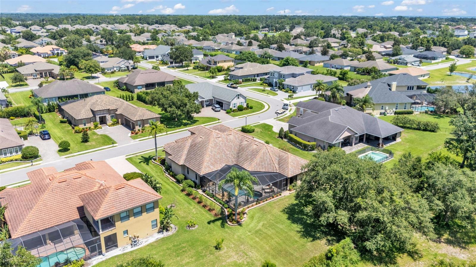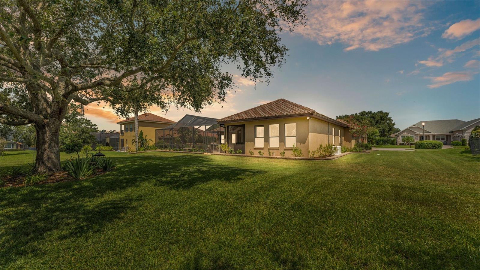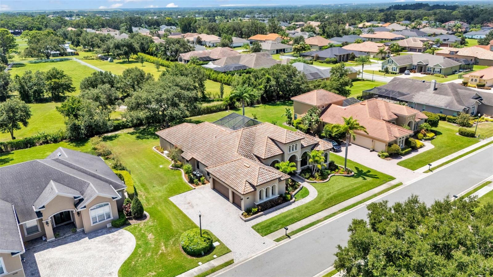 Welcome to 6572 Eagle View Loop, a stunning Mediterranean-style estate nestled in the heart of The Preserve at Eaglebrooke North, one of Lakeland's most sought after 24-hour guarded and gated Country Club communities. This impeccably maintained 5-bedroom, 3.5-bathroom custom home spans 3,546 square feet of refined single-level living and sits on an expansive 0.34-acre lot. Built by award-winning Hulbert Homes, this residence offers the perfect blend of elegance, comfort, and modern convenience. A grand barrel tile roof, paver driveway, and elegant eight-foot double front doors set the stage for the luxury found within. Step inside to discover a freshly repainted interior (August 2025) and rich hardwood flooring added in 2023, complemented by sleek tile throughout the wet and common areas. Every detail is carefully curated from the custom closets by Closets by Design to the classic Florida Plantation Shutters gracing the windows. The gourmet kitchen is the heart of the home, featuring custom wood cabinetry, granite countertops, stainless steel appliances, and a spacious island. A built-in double oven, gas cooktop with decorative hood, and microwave make culinary endeavors a delight, while the breakfast bar comfortably seats four. The adjacent wet bar with a built-in icemaker is perfect for entertaining guests. The living room is anchored by a stunning stone-accented gas fireplace, offering a warm and inviting space to gather. This home also includes a private study and a versatile bonus/theatre room, designed to fit your lifestyle needs. The primary suite is a true retreat, showcasing a spacious bedroom with custom closets and an opulent en-suite bathroom featuring granite counters, abundant cabinetry, a walk-in shower, and eye-catching decorative mirrors. Step into your outdoor paradise with an expansive screen-enclosed lanai with paver flooring, recently refreshed in 2024 with new screening, tie-downs, and three new outdoor fans in 2025. Enjoy Florida's year-round sunshine by the beach entry pool, a resort-style feature with a gradual, walk-in slope that mimics the shoreline of a tropical beach. This luxurious pool is enhanced with a sun shelf, soothing fountains, and two built-in seating areas for ultimate relaxation. A tranquil waterfall completes this private backyard oasis. Notable upgrades include a full-home Generac 26kW generator (2024), water softener and reverse osmosis system (2023), and a Bosch 800 dishwasher (2023). The pool pump, salt system, and valves were also updated in 2023, ensuring peak performance. Two brand-new AC systems were installed in August 2025 for optimal climate control year-round. Additional features include a beautifully landscaped Zoysia lawn with upgraded outdoor lighting (2024), and a new ice machine added in 2025 for everyday convenience. The oversized three-car garage offers plenty of space for vehicles and storage, while the meticulously serviced irrigation system keeps the grounds lush and vibrant. Residents of Eaglebrooke enjoy access to a 4 1/2-Star Championship Golf Course, Junior Olympic swimming pool, tennis, pickleball courts, and a clubhouse with formal dining, sports bar, event space, and a fully stocked pro shop, all with available membership options. Luxury, comfort, and resort-style living await you at 6572 Eagle View Loop where every detail has been thoughtfully crafted for the most discerning homeowner.
