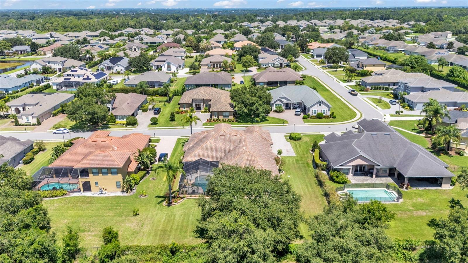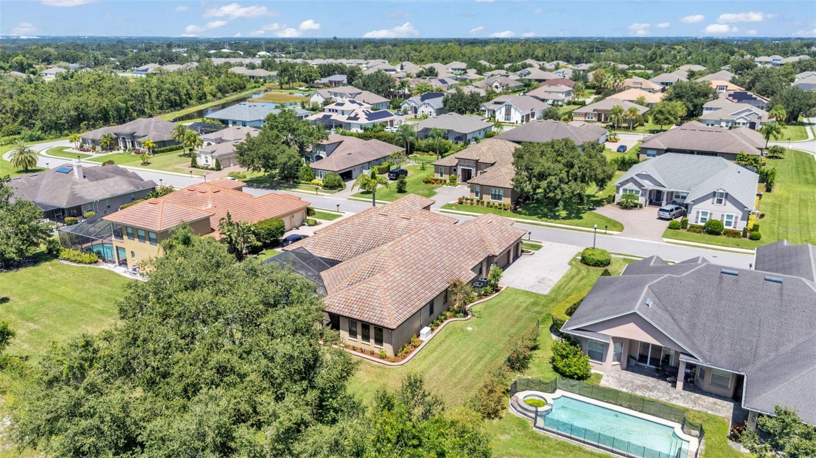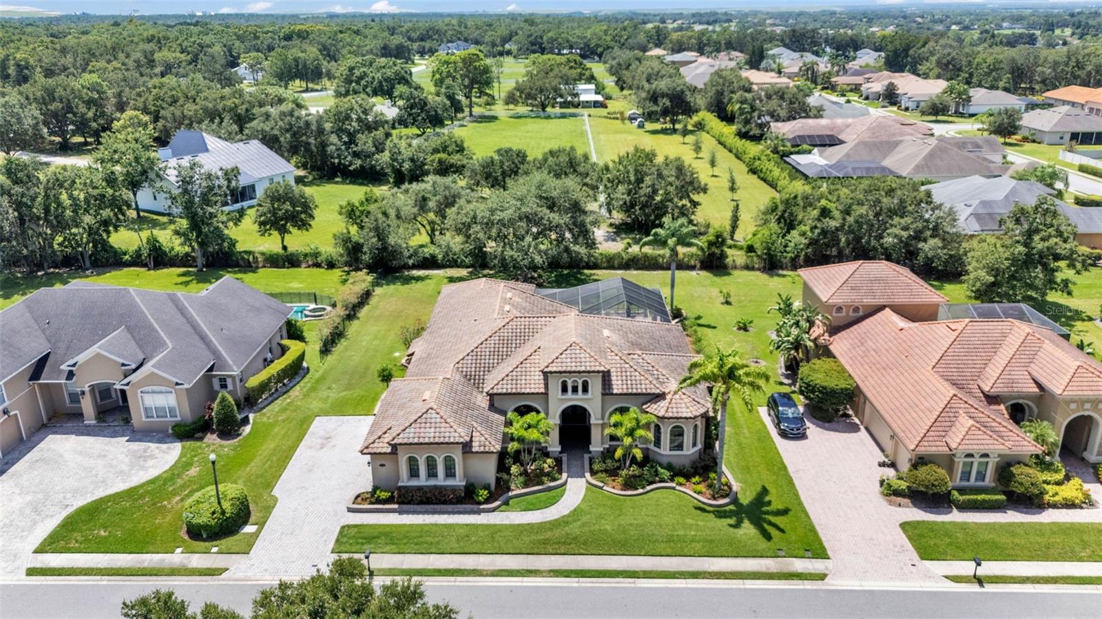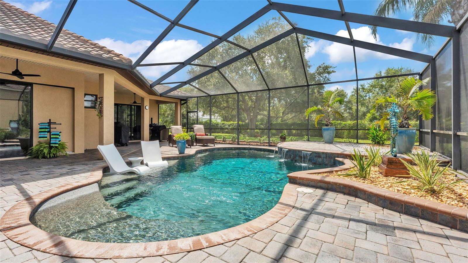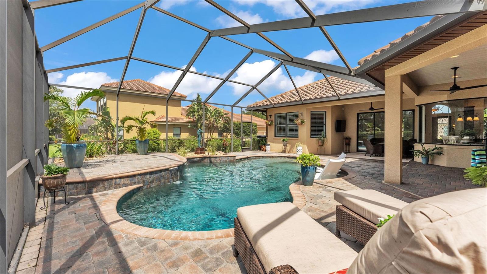 Welcome to 6572 Eagle View Loop, a stunning Mediterranean-style estate nestled in the heart of The Preserve at Eaglebrooke North, one of Lakeland's most sought after 24-hour guarded and gated Country Club communities. This impeccably maintained 5-bedroom, 3.5-bathroom custom home spans 3,546 square feet of refined single-level living and sits on an expansive 0.34-acre lot. Built by award-winning Hulbert Homes, this residence offers the perfect blend of elegance, comfort, and modern convenience. A grand barrel tile roof, paver driveway, and elegant eight-foot double front doors set the stage for the luxury found within. Step inside to discover a freshly repainted interior (August 2025) and rich hardwood flooring added in 2023, complemented by sleek tile throughout the wet and common areas. Every detail is carefully curated from the custom closets by Closets by Design to the classic Florida Plantation Shutters gracing the windows. The gourmet kitchen is the heart of the home, featuring custom wood cabinetry, granite countertops, stainless steel appliances, and a spacious island. A built-in double oven, gas cooktop with decorative hood, and microwave make culinary endeavors a delight, while the breakfast bar comfortably seats four. The adjacent wet bar with a built-in icemaker is perfect for entertaining guests. The living room is anchored by a stunning stone-accented gas fireplace, offering a warm and inviting space to gather. This home also includes a private study and a versatile bonus/theatre room, designed to fit your lifestyle needs. The primary suite is a true retreat, showcasing a spacious bedroom with custom closets and an opulent en-suite bathroom featuring granite counters, abundant cabinetry, a walk-in shower, and eye-catching decorative mirrors. Step into your outdoor paradise with an expansive screen-enclosed lanai with paver flooring, recently refreshed in 2024 with new screening, tie-downs, and three new outdoor fans in 2025. Enjoy Florida's year-round sunshine by the beach entry pool, a resort-style feature with a gradual, walk-in slope that mimics the shoreline of a tropical beach. This luxurious pool is enhanced with a sun shelf, soothing fountains, and two built-in seating areas for ultimate relaxation. A tranquil waterfall completes this private backyard oasis. Notable upgrades include a full-home Generac 26kW generator (2024), water softener and reverse osmosis system (2023), and a Bosch 800 dishwasher (2023). The pool pump, salt system, and valves were also updated in 2023, ensuring peak performance. Two brand-new AC systems were installed in August 2025 for optimal climate control year-round. Additional features include a beautifully landscaped Zoysia lawn with upgraded outdoor lighting (2024), and a new ice machine added in 2025 for everyday convenience. The oversized three-car garage offers plenty of space for vehicles and storage, while the meticulously serviced irrigation system keeps the grounds lush and vibrant. Residents of Eaglebrooke enjoy access to a 4 1/2-Star Championship Golf Course, Junior Olympic swimming pool, tennis, pickleball courts, and a clubhouse with formal dining, sports bar, event space, and a fully stocked pro shop, all with available membership options. Luxury, comfort, and resort-style living await you at 6572 Eagle View Loop where every detail has been thoughtfully crafted for the most discerning homeowner.