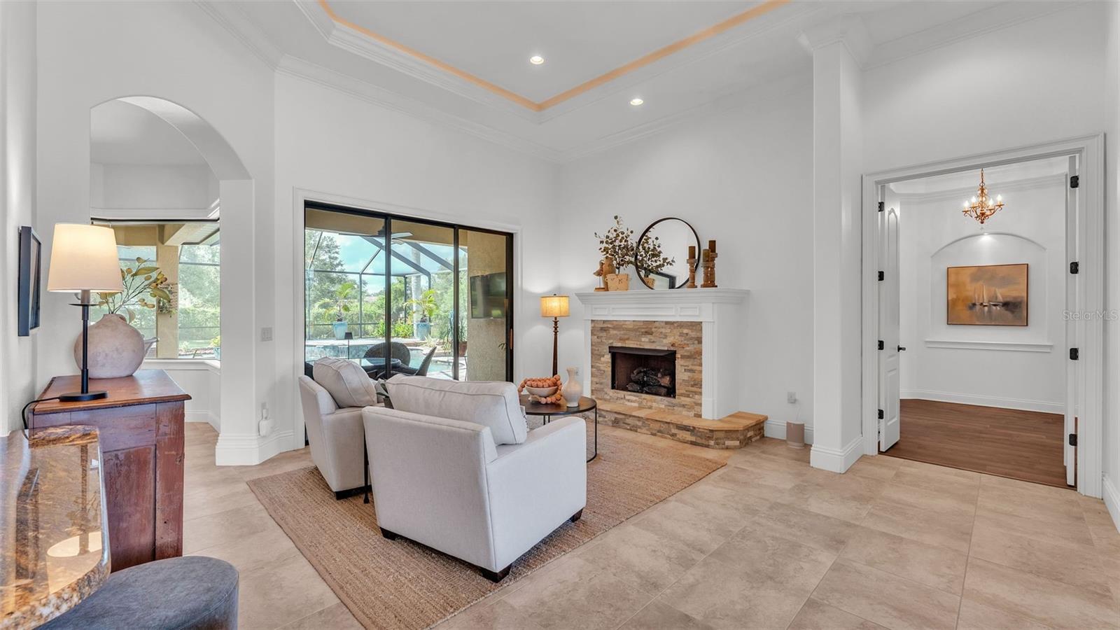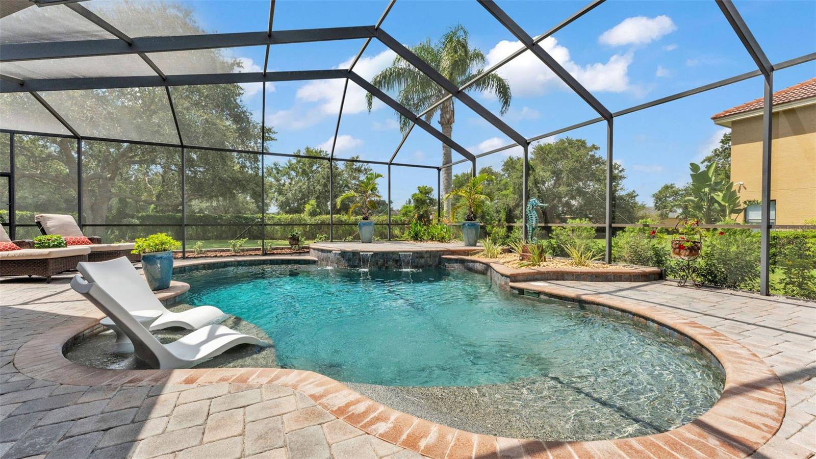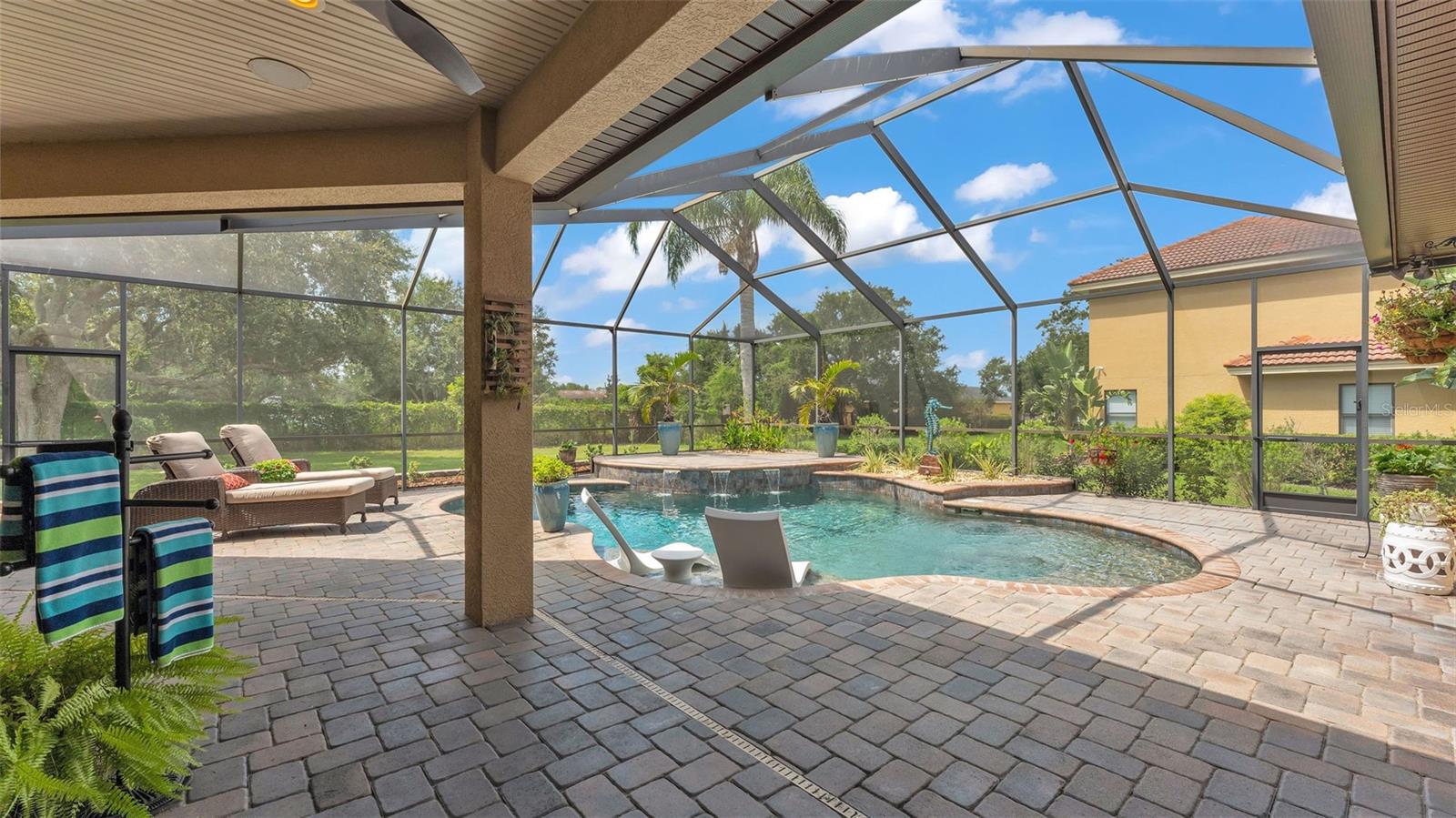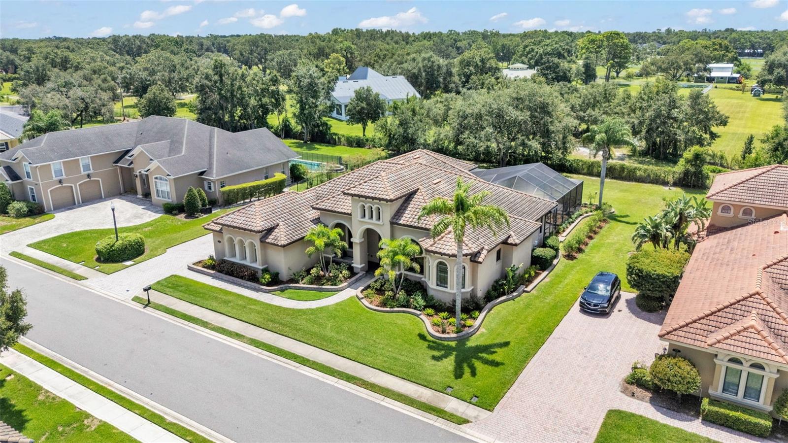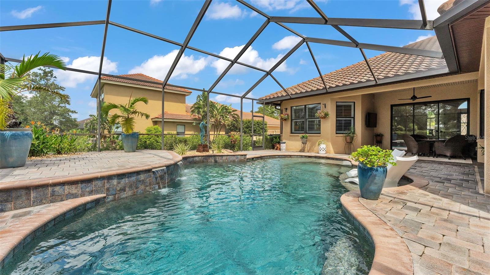 Welcome to 6572 Eagle View Loop, a stunning Mediterranean-style estate nestled in the heart of The Preserve at Eaglebrooke North, one of Lakeland's most sought after 24-hour guarded and gated Country Club communities. This impeccably maintained 5-bedroom, 3.5-bathroom custom home spans 3,546 square feet of refined single-level living and sits on an expansive 0.34-acre lot. Built by award-winning Hulbert Homes, this residence offers the perfect blend of elegance, comfort, and modern convenience. A grand barrel tile roof, paver driveway, and elegant eight-foot double front doors set the stage for the luxury found within. Step inside to discover a freshly repainted interior (August 2025) and rich hardwood flooring added in 2023, complemented by sleek tile throughout the wet and common areas. Every detail is carefully curated from the custom closets by Closets by Design to the classic Florida Plantation Shutters gracing the windows. The gourmet kitchen is the heart of the home, featuring custom wood cabinetry, granite countertops, stainless steel appliances, and a spacious island. A built-in double oven, gas cooktop with decorative hood, and microwave make culinary endeavors a delight, while the breakfast bar comfortably seats four. The adjacent wet bar with a built-in icemaker is perfect for entertaining guests. The living room is anchored by a stunning stone-accented gas fireplace, offering a warm and inviting space to gather. This home also includes a private study and a versatile bonus/theatre room, designed to fit your lifestyle needs. The primary suite is a true retreat, showcasing a spacious bedroom with custom closets and an opulent en-suite bathroom featuring granite counters, abundant cabinetry, a walk-in shower, and eye-catching decorative mirrors. Step into your outdoor paradise with an expansive screen-enclosed lanai with paver flooring, recently refreshed in 2024 with new screening, tie-downs, and three new outdoor fans in 2025. Enjoy Florida's year-round sunshine by the beach entry pool, a resort-style feature with a gradual, walk-in slope that mimics the shoreline of a tropical beach. This luxurious pool is enhanced with a sun shelf, soothing fountains, and two built-in seating areas for ultimate relaxation. A tranquil waterfall completes this private backyard oasis. Notable upgrades include a full-home Generac 26kW generator (2024), water softener and reverse osmosis system (2023), and a Bosch 800 dishwasher (2023). The pool pump, salt system, and valves were also updated in 2023, ensuring peak performance. Two brand-new AC systems were installed in August 2025 for optimal climate control year-round. Additional features include a beautifully landscaped Zoysia lawn with upgraded outdoor lighting (2024), and a new ice machine added in 2025 for everyday convenience. The oversized three-car garage offers plenty of space for vehicles and storage, while the meticulously serviced irrigation system keeps the grounds lush and vibrant. Residents of Eaglebrooke enjoy access to a 4 1/2-Star Championship Golf Course, Junior Olympic swimming pool, tennis, pickleball courts, and a clubhouse with formal dining, sports bar, event space, and a fully stocked pro shop, all with available membership options. Luxury, comfort, and resort-style living await you at 6572 Eagle View Loop where every detail has been thoughtfully crafted for the most discerning homeowner.