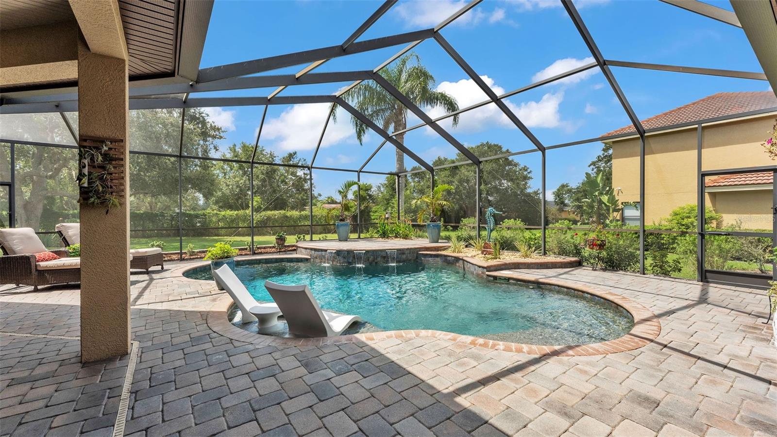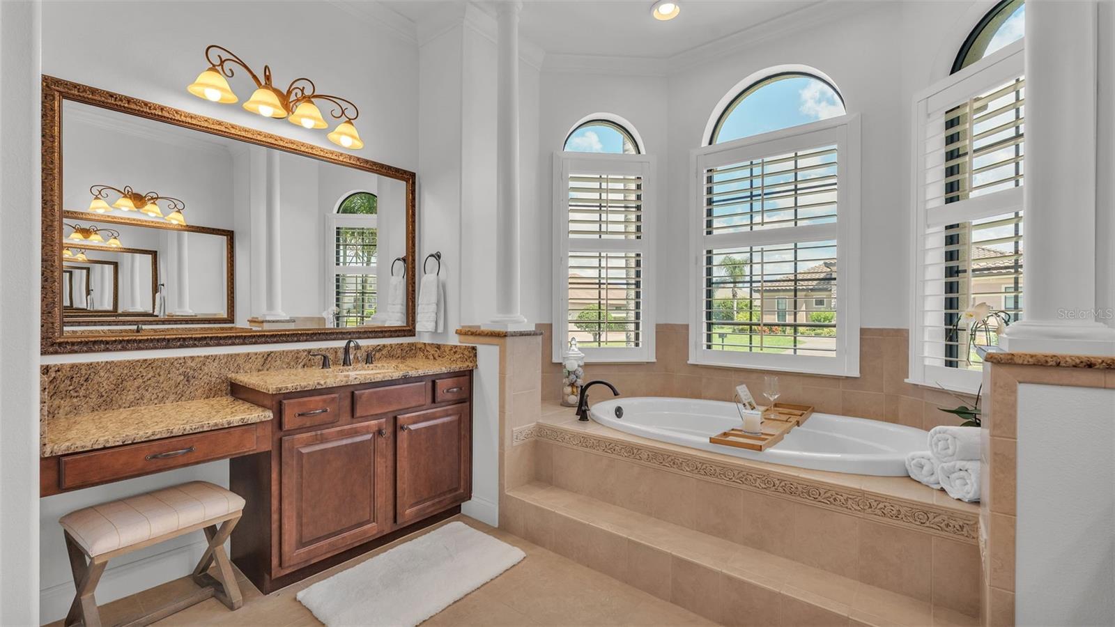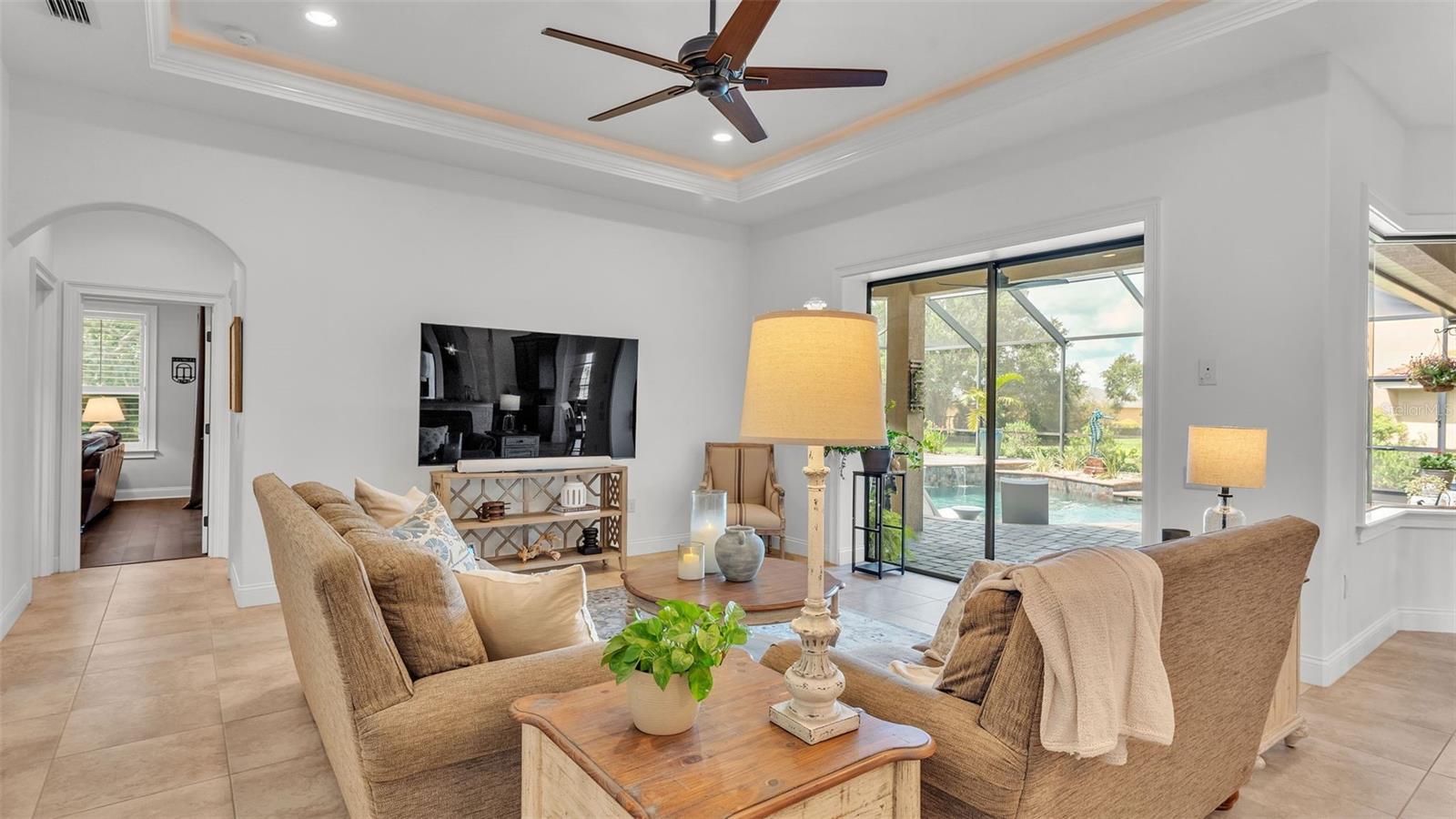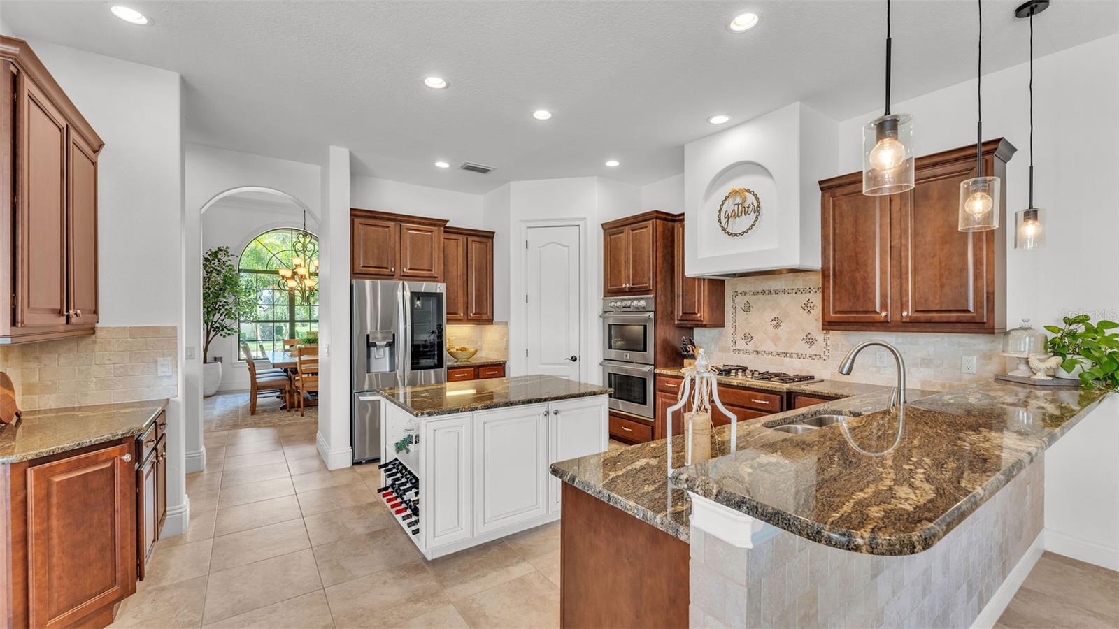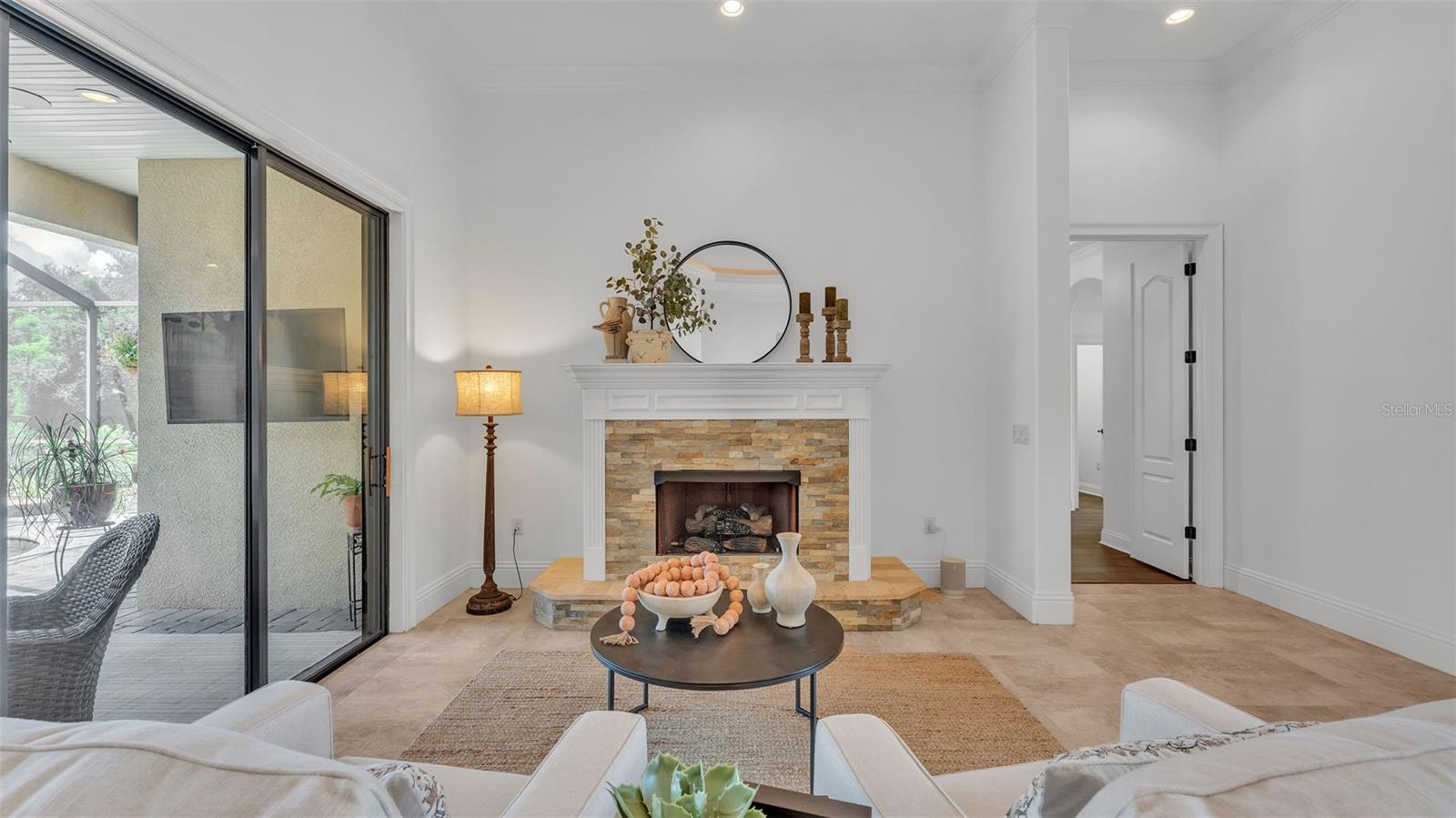 Welcome to 6572 Eagle View Loop, a stunning Mediterranean-style estate nestled in the heart of The Preserve at Eaglebrooke North, one of Lakeland's most sought after 24-hour guarded and gated Country Club communities. This impeccably maintained 5-bedroom, 3.5-bathroom custom home spans 3,546 square feet of refined single-level living and sits on an expansive 0.34-acre lot. Built by award-winning Hulbert Homes, this residence offers the perfect blend of elegance, comfort, and modern convenience. A grand barrel tile roof, paver driveway, and elegant eight-foot double front doors set the stage for the luxury found within. Step inside to discover a freshly repainted interior (August 2025) and rich hardwood flooring added in 2023, complemented by sleek tile throughout the wet and common areas. Every detail is carefully curated from the custom closets by Closets by Design to the classic Florida Plantation Shutters gracing the windows. The gourmet kitchen is the heart of the home, featuring custom wood cabinetry, granite countertops, stainless steel appliances, and a spacious island. A built-in double oven, gas cooktop with decorative hood, and microwave make culinary endeavors a delight, while the breakfast bar comfortably seats four. The adjacent wet bar with a built-in icemaker is perfect for entertaining guests. The living room is anchored by a stunning stone-accented gas fireplace, offering a warm and inviting space to gather. This home also includes a private study and a versatile bonus/theatre room, designed to fit your lifestyle needs. The primary suite is a true retreat, showcasing a spacious bedroom with custom closets and an opulent en-suite bathroom featuring granite counters, abundant cabinetry, a walk-in shower, and eye-catching decorative mirrors. Step into your outdoor paradise with an expansive screen-enclosed lanai with paver flooring, recently refreshed in 2024 with new screening, tie-downs, and three new outdoor fans in 2025. Enjoy Florida's year-round sunshine by the beach entry pool, a resort-style feature with a gradual, walk-in slope that mimics the shoreline of a tropical beach. This luxurious pool is enhanced with a sun shelf, soothing fountains, and two built-in seating areas for ultimate relaxation. A tranquil waterfall completes this private backyard oasis. Notable upgrades include a full-home Generac 26kW generator (2024), water softener and reverse osmosis system (2023), and a Bosch 800 dishwasher (2023). The pool pump, salt system, and valves were also updated in 2023, ensuring peak performance. Two brand-new AC systems were installed in August 2025 for optimal climate control year-round. Additional features include a beautifully landscaped Zoysia lawn with upgraded outdoor lighting (2024), and a new ice machine added in 2025 for everyday convenience. The oversized three-car garage offers plenty of space for vehicles and storage, while the meticulously serviced irrigation system keeps the grounds lush and vibrant. Residents of Eaglebrooke enjoy access to a 4 1/2-Star Championship Golf Course, Junior Olympic swimming pool, tennis, pickleball courts, and a clubhouse with formal dining, sports bar, event space, and a fully stocked pro shop, all with available membership options. Luxury, comfort, and resort-style living await you at 6572 Eagle View Loop where every detail has been thoughtfully crafted for the most discerning homeowner.