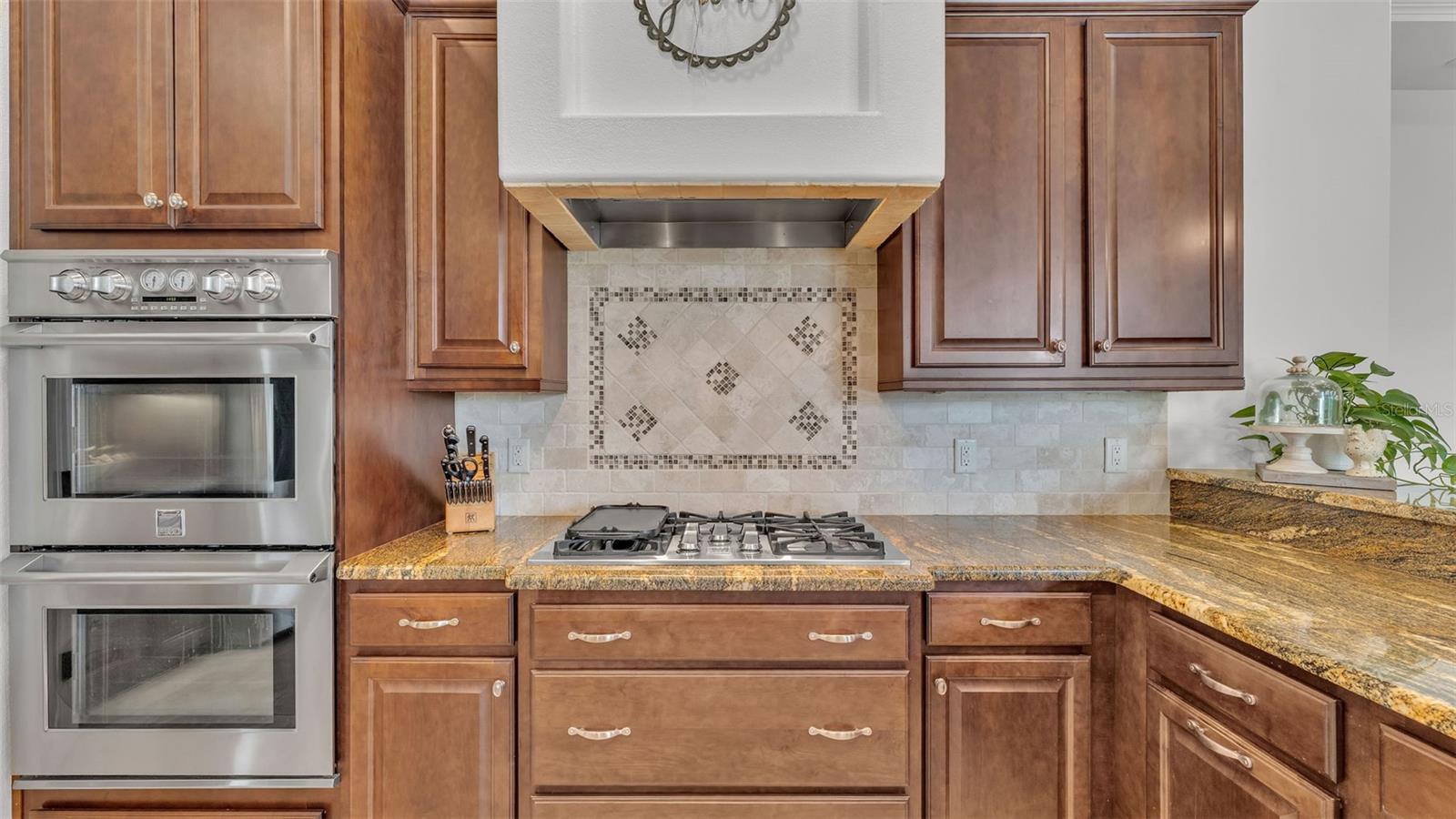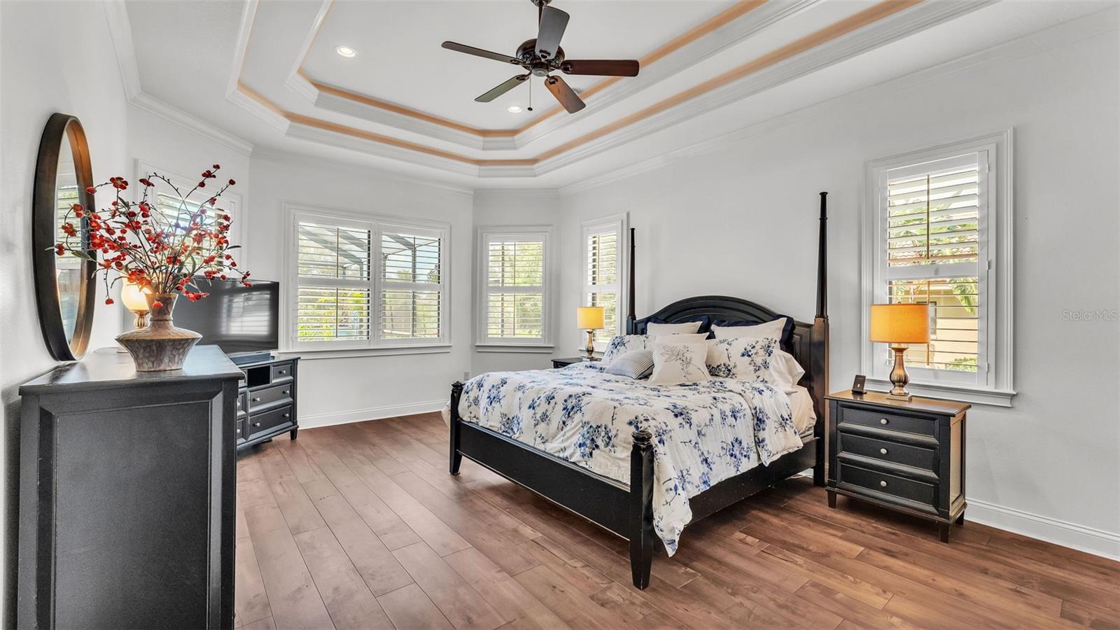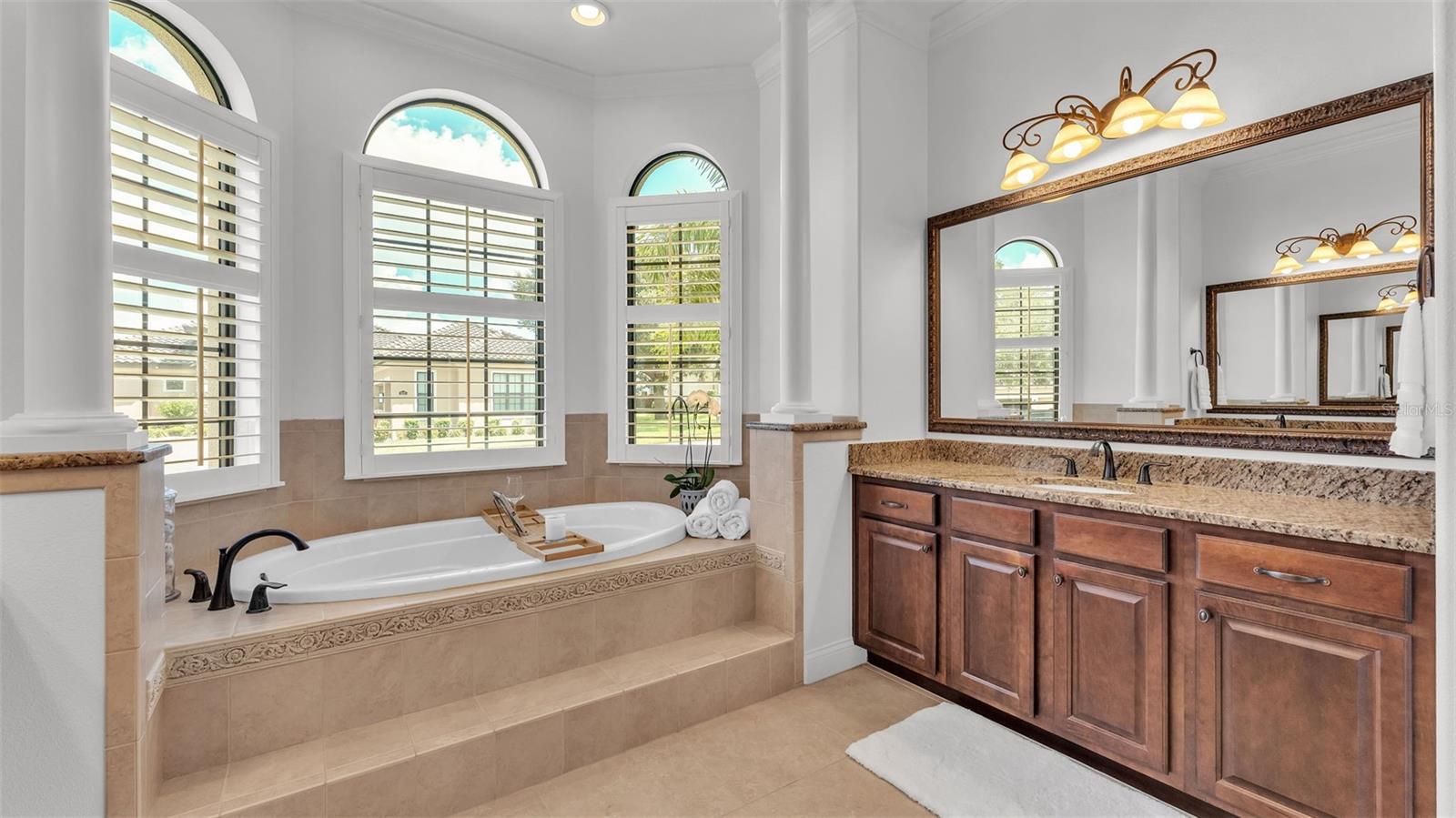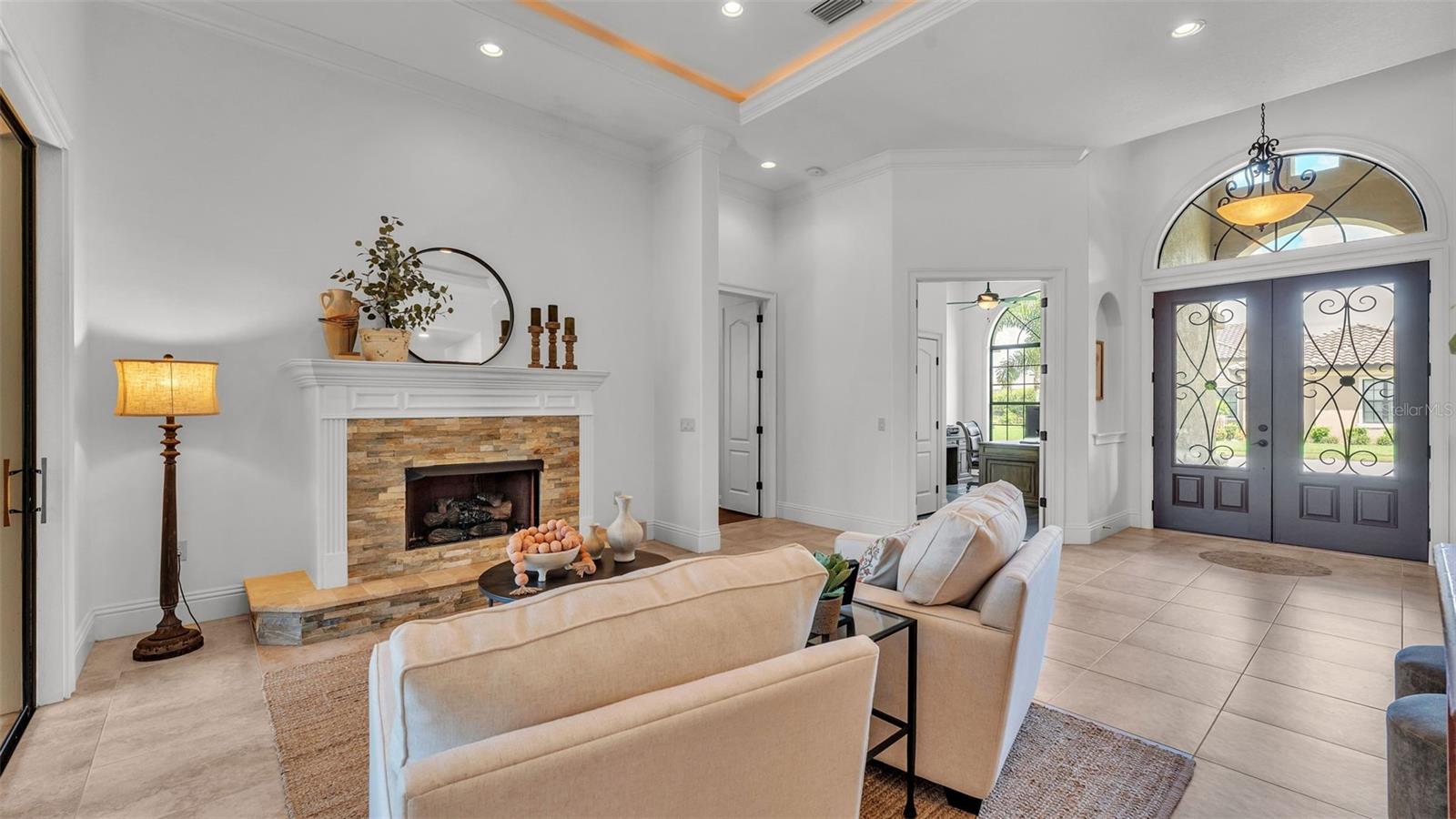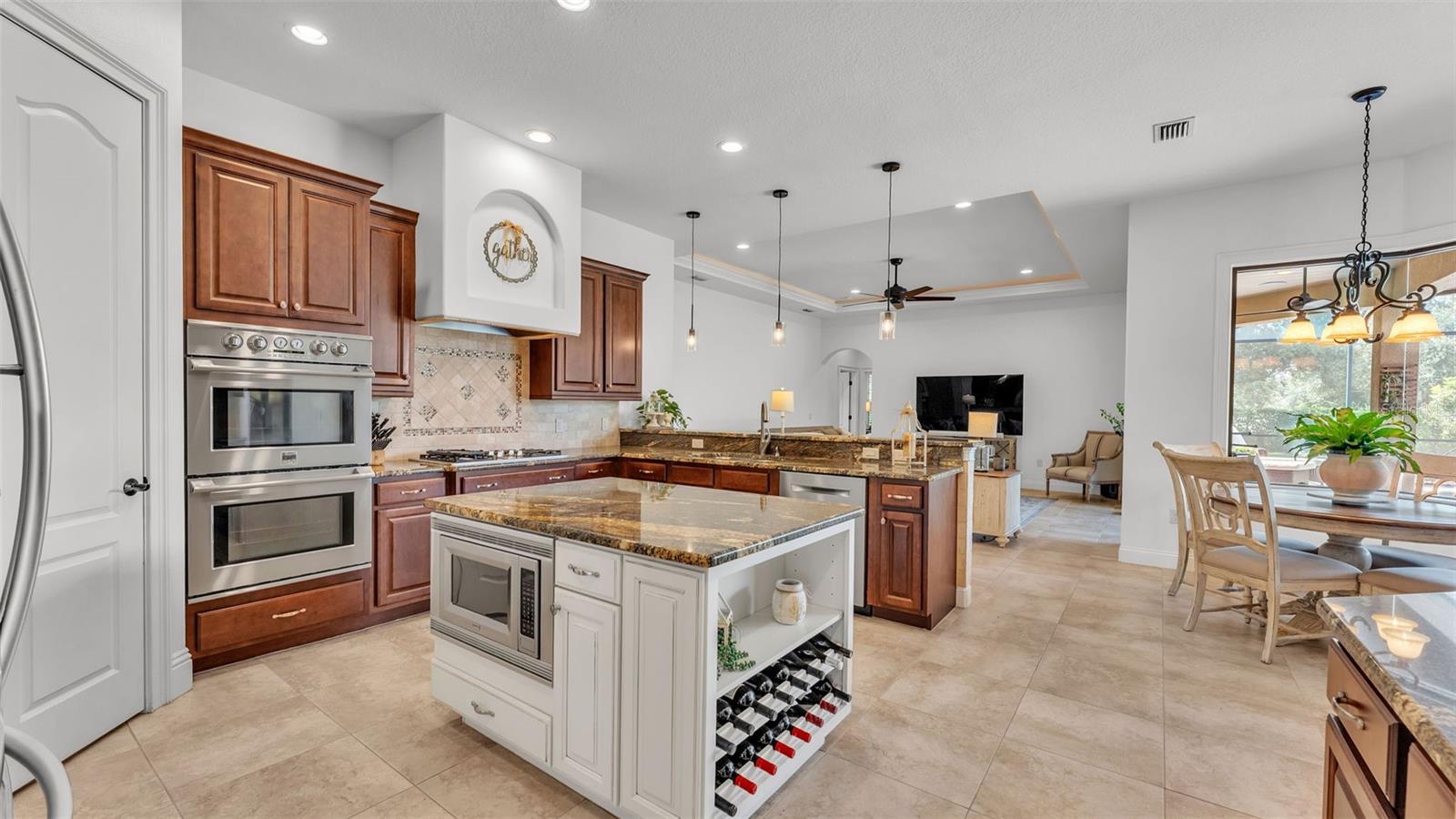 Welcome to 6572 Eagle View Loop, a stunning Mediterranean-style estate nestled in the heart of The Preserve at Eaglebrooke North, one of Lakeland's most sought after 24-hour guarded and gated Country Club communities. This impeccably maintained 5-bedroom, 3.5-bathroom custom home spans 3,546 square feet of refined single-level living and sits on an expansive 0.34-acre lot. Built by award-winning Hulbert Homes, this residence offers the perfect blend of elegance, comfort, and modern convenience. A grand barrel tile roof, paver driveway, and elegant eight-foot double front doors set the stage for the luxury found within. Step inside to discover a freshly repainted interior (August 2025) and rich hardwood flooring added in 2023, complemented by sleek tile throughout the wet and common areas. Every detail is carefully curated from the custom closets by Closets by Design to the classic Florida Plantation Shutters gracing the windows. The gourmet kitchen is the heart of the home, featuring custom wood cabinetry, granite countertops, stainless steel appliances, and a spacious island. A built-in double oven, gas cooktop with decorative hood, and microwave make culinary endeavors a delight, while the breakfast bar comfortably seats four. The adjacent wet bar with a built-in icemaker is perfect for entertaining guests. The living room is anchored by a stunning stone-accented gas fireplace, offering a warm and inviting space to gather. This home also includes a private study and a versatile bonus/theatre room, designed to fit your lifestyle needs. The primary suite is a true retreat, showcasing a spacious bedroom with custom closets and an opulent en-suite bathroom featuring granite counters, abundant cabinetry, a walk-in shower, and eye-catching decorative mirrors. Step into your outdoor paradise with an expansive screen-enclosed lanai with paver flooring, recently refreshed in 2024 with new screening, tie-downs, and three new outdoor fans in 2025. Enjoy Florida's year-round sunshine by the beach entry pool, a resort-style feature with a gradual, walk-in slope that mimics the shoreline of a tropical beach. This luxurious pool is enhanced with a sun shelf, soothing fountains, and two built-in seating areas for ultimate relaxation. A tranquil waterfall completes this private backyard oasis. Notable upgrades include a full-home Generac 26kW generator (2024), water softener and reverse osmosis system (2023), and a Bosch 800 dishwasher (2023). The pool pump, salt system, and valves were also updated in 2023, ensuring peak performance. Two brand-new AC systems were installed in August 2025 for optimal climate control year-round. Additional features include a beautifully landscaped Zoysia lawn with upgraded outdoor lighting (2024), and a new ice machine added in 2025 for everyday convenience. The oversized three-car garage offers plenty of space for vehicles and storage, while the meticulously serviced irrigation system keeps the grounds lush and vibrant. Residents of Eaglebrooke enjoy access to a 4 1/2-Star Championship Golf Course, Junior Olympic swimming pool, tennis, pickleball courts, and a clubhouse with formal dining, sports bar, event space, and a fully stocked pro shop, all with available membership options. Luxury, comfort, and resort-style living await you at 6572 Eagle View Loop where every detail has been thoughtfully crafted for the most discerning homeowner.