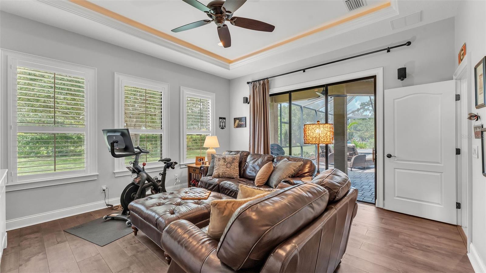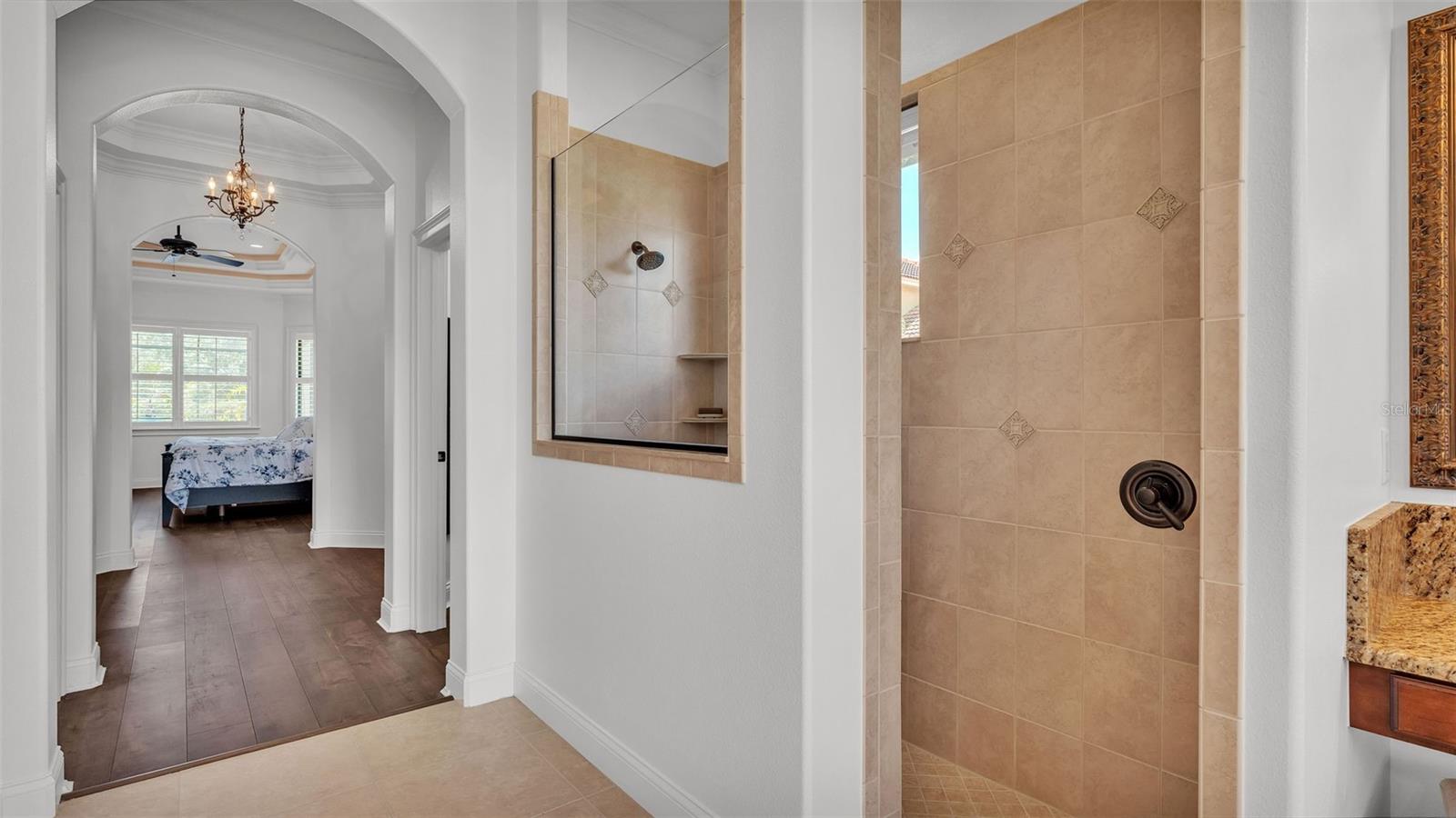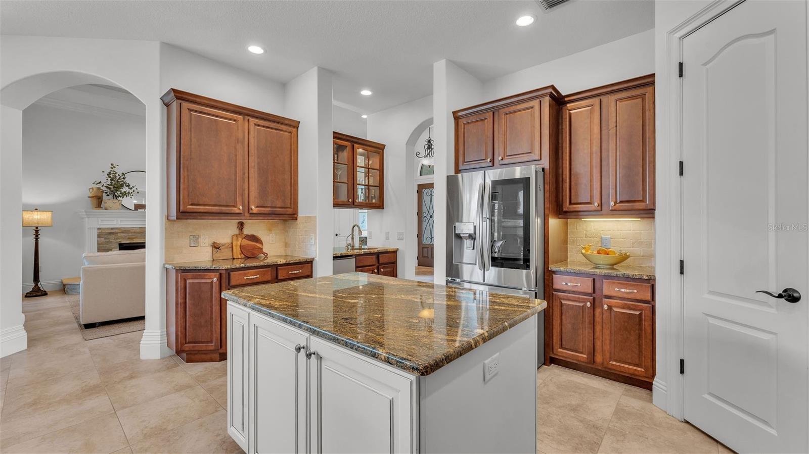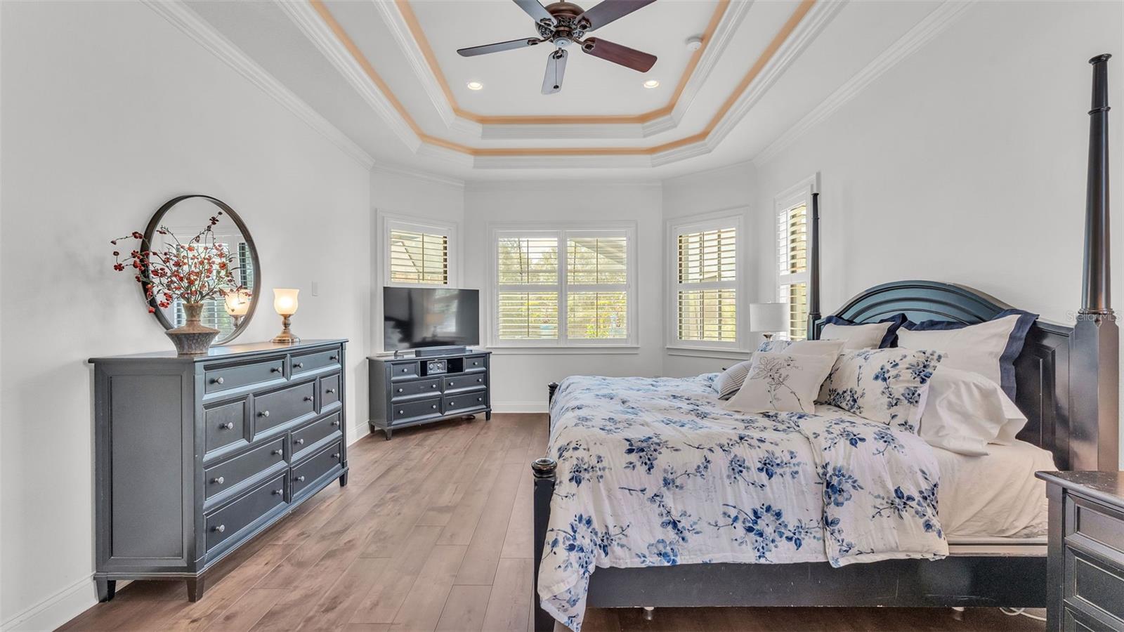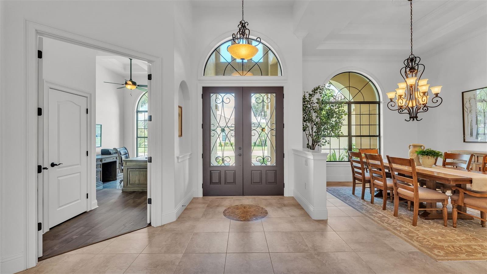 Welcome to 6572 Eagle View Loop, a stunning Mediterranean-style estate nestled in the heart of The Preserve at Eaglebrooke North, one of Lakeland's most sought after 24-hour guarded and gated Country Club communities. This impeccably maintained 5-bedroom, 3.5-bathroom custom home spans 3,546 square feet of refined single-level living and sits on an expansive 0.34-acre lot. Built by award-winning Hulbert Homes, this residence offers the perfect blend of elegance, comfort, and modern convenience. A grand barrel tile roof, paver driveway, and elegant eight-foot double front doors set the stage for the luxury found within. Step inside to discover a freshly repainted interior (August 2025) and rich hardwood flooring added in 2023, complemented by sleek tile throughout the wet and common areas. Every detail is carefully curated from the custom closets by Closets by Design to the classic Florida Plantation Shutters gracing the windows. The gourmet kitchen is the heart of the home, featuring custom wood cabinetry, granite countertops, stainless steel appliances, and a spacious island. A built-in double oven, gas cooktop with decorative hood, and microwave make culinary endeavors a delight, while the breakfast bar comfortably seats four. The adjacent wet bar with a built-in icemaker is perfect for entertaining guests. The living room is anchored by a stunning stone-accented gas fireplace, offering a warm and inviting space to gather. This home also includes a private study and a versatile bonus/theatre room, designed to fit your lifestyle needs. The primary suite is a true retreat, showcasing a spacious bedroom with custom closets and an opulent en-suite bathroom featuring granite counters, abundant cabinetry, a walk-in shower, and eye-catching decorative mirrors. Step into your outdoor paradise with an expansive screen-enclosed lanai with paver flooring, recently refreshed in 2024 with new screening, tie-downs, and three new outdoor fans in 2025. Enjoy Florida's year-round sunshine by the beach entry pool, a resort-style feature with a gradual, walk-in slope that mimics the shoreline of a tropical beach. This luxurious pool is enhanced with a sun shelf, soothing fountains, and two built-in seating areas for ultimate relaxation. A tranquil waterfall completes this private backyard oasis. Notable upgrades include a full-home Generac 26kW generator (2024), water softener and reverse osmosis system (2023), and a Bosch 800 dishwasher (2023). The pool pump, salt system, and valves were also updated in 2023, ensuring peak performance. Two brand-new AC systems were installed in August 2025 for optimal climate control year-round. Additional features include a beautifully landscaped Zoysia lawn with upgraded outdoor lighting (2024), and a new ice machine added in 2025 for everyday convenience. The oversized three-car garage offers plenty of space for vehicles and storage, while the meticulously serviced irrigation system keeps the grounds lush and vibrant. Residents of Eaglebrooke enjoy access to a 4 1/2-Star Championship Golf Course, Junior Olympic swimming pool, tennis, pickleball courts, and a clubhouse with formal dining, sports bar, event space, and a fully stocked pro shop, all with available membership options. Luxury, comfort, and resort-style living await you at 6572 Eagle View Loop where every detail has been thoughtfully crafted for the most discerning homeowner.