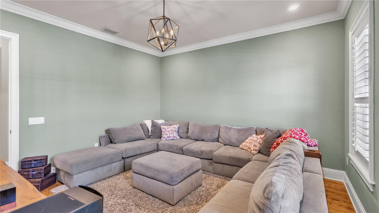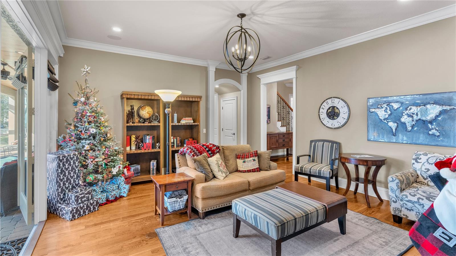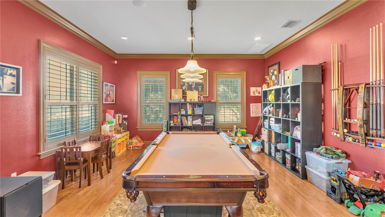 In the charming community of Crescent Woods, this inviting home boasts a thoughtful layout, effortlessly distributing bedrooms between upper and lower levels. As you step inside, a casual elegance embraces the space, creating an atmosphere perfect for envisioning gatherings and crafting cherished moments. The interconnected formal rooms showcase tasteful trim work, setting the scene for relaxed social occasions. The kitchen, a practical dream, features granite countertops, stainless steel appliances, custom cabinets, a walk-in pantry, and a delightful breakfast bar, all bathed in natural light. Additional spaces, including a billiards room with a wet bar, a den, and an office, provide versatile options for daily living. The family room becomes a comfortable hub, featuring built-ins, ample natural light, and a gas fireplace that adds warmth and charm. Flowing seamlessly to the screened pool area, this outdoor retreat includes a covered lanai, an outdoor kitchen, and a heated pool, creating an ideal setting for laid-back entertaining. The spacious Master Suite, positioned on the second floor, boasts a California Closet walk-in dressing room, a well-appointed bath with dual sinks, a garden tub, and an indulgent walk-in shower. Upstairs, three bedrooms each enjoy walk-in California closets and access to two additional bathrooms. With over 4,500 sqft, this residence provides ample space for comfortable living. The 3-car garage, with its generous dimensions, is thoughtfully organized with California Closets and conveniently connects to a mudroom and a roomy laundry area. Nestled in a friendly South Lakeland gated neighborhood, this home falls within a sought-after school zone. Throughout the home, the inclusion of tasteful plantation shutters, upgraded lighting fixtures, and graceful chandeliers adds a touch of refinement to the comfortable living space. French doors from the living area extend to the back lanai, completing the harmonious indoor-outdoor experience and infusing the home with an enduring sense of timeless elegance.