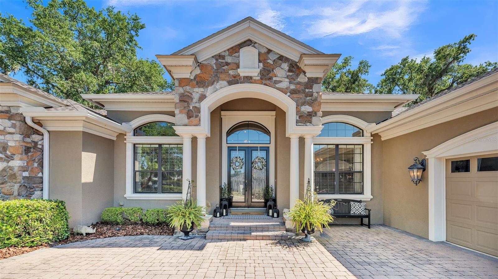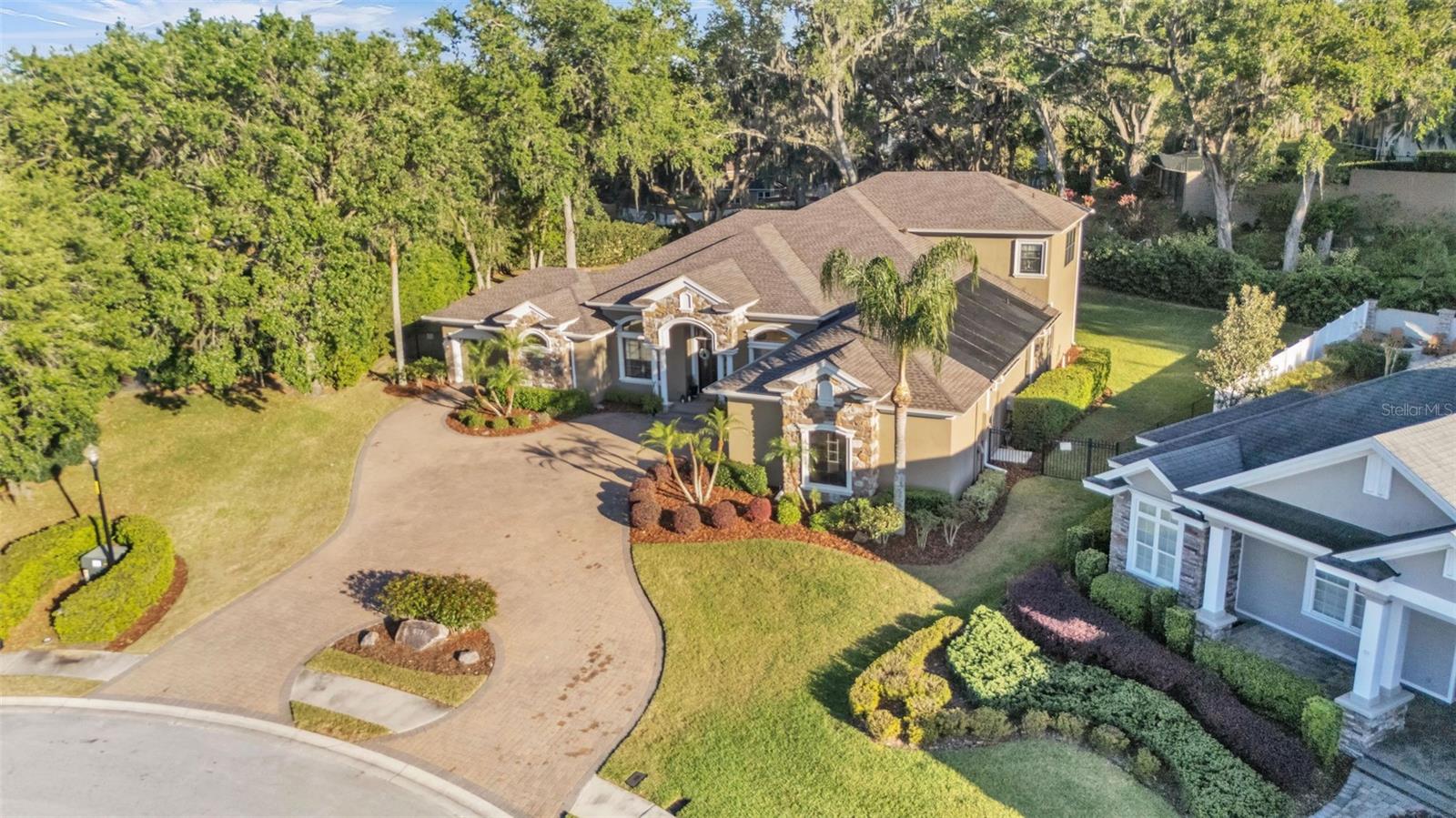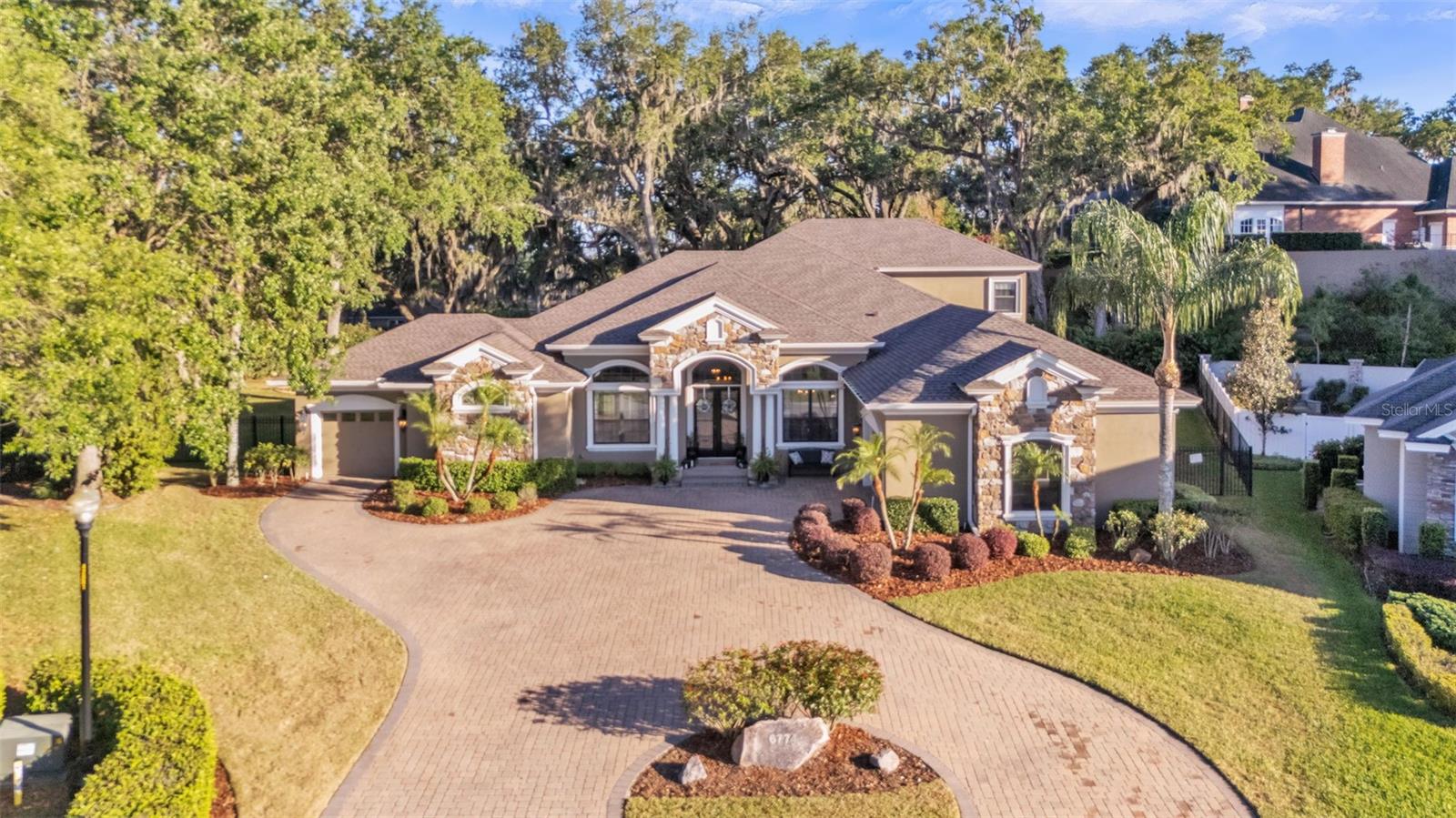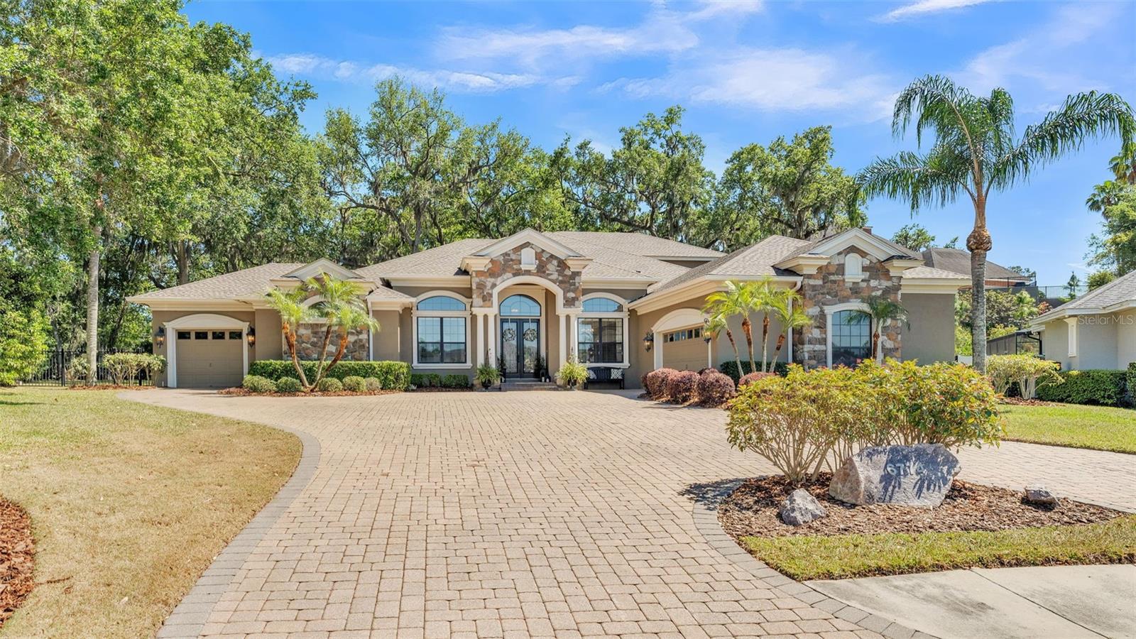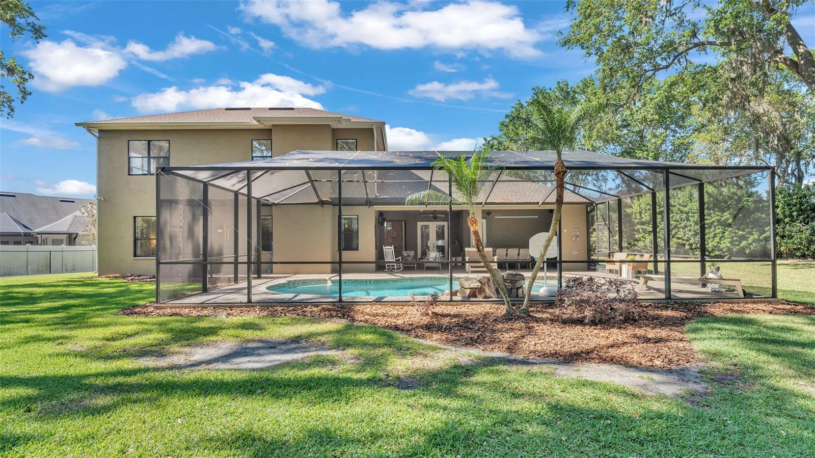 Welcome to 6774 Crescent Woods Circle, a stunning estate located in the exclusive, gated community of Crescent Woods in South Lakeland. This coveted neighborhood, consisting of only 48 homes, offers a rare level of privacy and luxury. Situated on a spacious .60-acre lot, this expansive residence spans over 6,000 square feet under roof and features five bedrooms, four bathrooms, and a dedicated office with French doors that open to the grand great room, allowing an abundance of natural light to flood the space. Built in 2008 by the renowned Strawbridge Homes, known for their exceptional craftsmanship, this home exudes elegance at every turn. Upon entering, you are greeted by soaring 15-foot ceilings and a series of custom-built features that elevate its stunning appeal. The open floor plan is complemented by crown molding throughout, double-pane windows, and foam-insulated exterior walls that ensure both comfort and energy efficiency. The gourmet kitchen, a true centerpiece of the home, overlooks the living area and features built-in cabinetry, high-end appliances, and large windows offering breathtaking views of the private, screened-in solar-heated pool. The luxurious primary suite provides a tranquil retreat, complete with direct access to the lanai, a tray ceiling, and ample space for relaxation. The en-suite bathroom is an oasis in itself, featuring dual vanities, a seated vanity area, a tiled step-in shower, and two spacious walk-in closets. Upstairs, a charming living area awaits, complete with its own full-size bathroom, walk-in closet, and custom-built storage, offering the perfect space for guests or additional family members. The resort-style backyard is truly an entertainer's paradise, with mature landscaping and an expansive circular paver driveway leading to a two-car garage on the right and a single-vehicle garage on the left. The fenced-in backyard offers complete privacy and serenity, surrounded by towering trees that create a peaceful retreat. The solar-heated, screen-enclosed pool, with a waterfall feature and 8-foot depth, provides the ultimate place to unwind or host guests, complemented by a large pavered patio and a fully-equipped custom outdoor kitchen. This exceptional home is perfectly situated on a corner lot, offering both space and an ideal location near excellent schools such as Scott Lake Elementary, Valleyview Elementary, and Highlands Grove Elementary, as well as Lakeland Highlands Middle School and George Jenkins High School. The best of South Lakeland's shopping, dining, and amenities are just minutes away. With a roof replacement completed in December 2024, a new pool pump in 2024 and a tankless hot water heater installed in 2024, this home is ready for years of enjoyment. Don't miss the opportunity to experience this exquisite residence. Schedule your tour today and discover the perfect blend of luxury, comfort, and style.