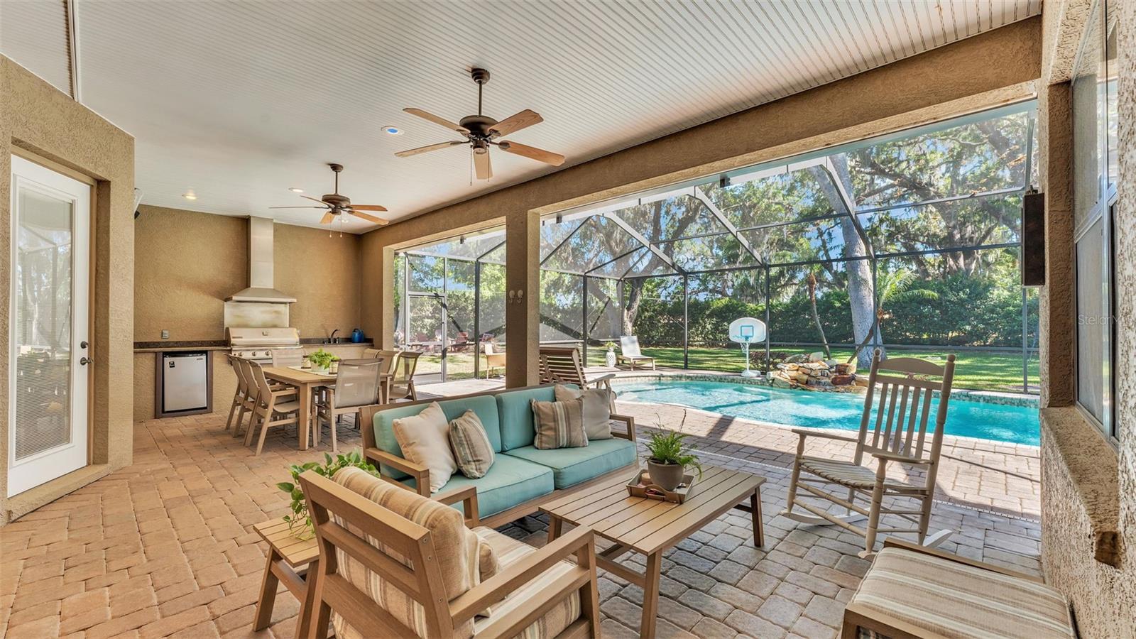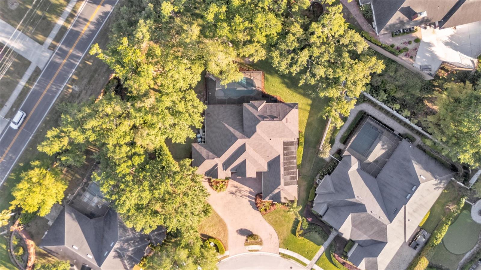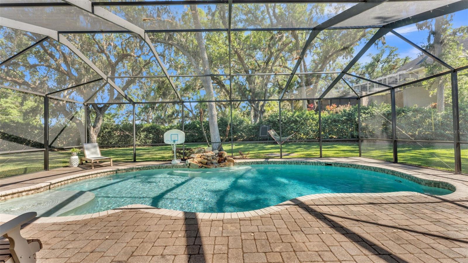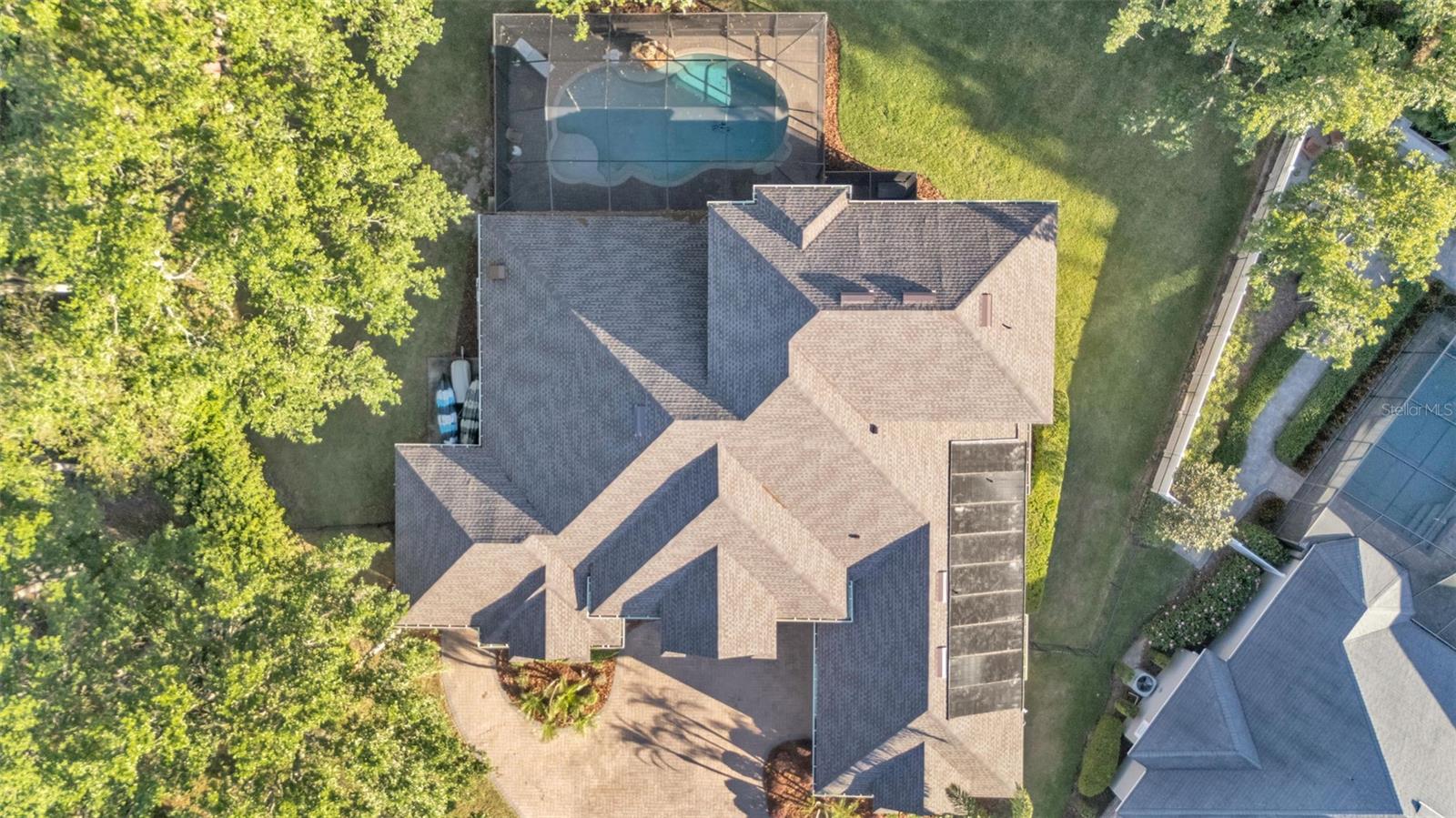 Welcome to 6774 Crescent Woods Circle, a stunning estate located in the exclusive, gated community of Crescent Woods in South Lakeland. This coveted neighborhood, consisting of only 48 homes, offers a rare level of privacy and luxury. Situated on a spacious .60-acre lot, this expansive residence spans over 6,000 square feet under roof and features five bedrooms, four bathrooms, and a dedicated office with French doors that open to the grand great room, allowing an abundance of natural light to flood the space. Built in 2008 by the renowned Strawbridge Homes, known for their exceptional craftsmanship, this home exudes elegance at every turn. Upon entering, you are greeted by soaring 15-foot ceilings and a series of custom-built features that elevate its stunning appeal. The open floor plan is complemented by crown molding throughout, double-pane windows, and foam-insulated exterior walls that ensure both comfort and energy efficiency. The gourmet kitchen, a true centerpiece of the home, overlooks the living area and features built-in cabinetry, high-end appliances, and large windows offering breathtaking views of the private, screened-in solar-heated pool. The luxurious primary suite provides a tranquil retreat, complete with direct access to the lanai, a tray ceiling, and ample space for relaxation. The en-suite bathroom is an oasis in itself, featuring dual vanities, a seated vanity area, a tiled step-in shower, and two spacious walk-in closets. Upstairs, a charming living area awaits, complete with its own full-size bathroom, walk-in closet, and custom-built storage, offering the perfect space for guests or additional family members. The resort-style backyard is truly an entertainer's paradise, with mature landscaping and an expansive circular paver driveway leading to a two-car garage on the right and a single-vehicle garage on the left. The fenced-in backyard offers complete privacy and serenity, surrounded by towering trees that create a peaceful retreat. The solar-heated, screen-enclosed pool, with a waterfall feature and 8-foot depth, provides the ultimate place to unwind or host guests, complemented by a large pavered patio and a fully-equipped custom outdoor kitchen. This exceptional home is perfectly situated on a corner lot, offering both space and an ideal location near excellent schools such as Scott Lake Elementary, Valleyview Elementary, and Highlands Grove Elementary, as well as Lakeland Highlands Middle School and George Jenkins High School. The best of South Lakeland's shopping, dining, and amenities are just minutes away. With a roof replacement completed in December 2024, a new pool pump in 2024 and a tankless hot water heater installed in 2024, this home is ready for years of enjoyment. Don't miss the opportunity to experience this exquisite residence. Schedule your tour today and discover the perfect blend of luxury, comfort, and style.