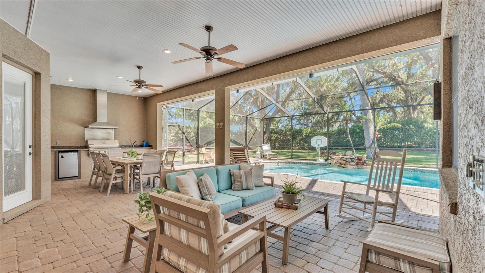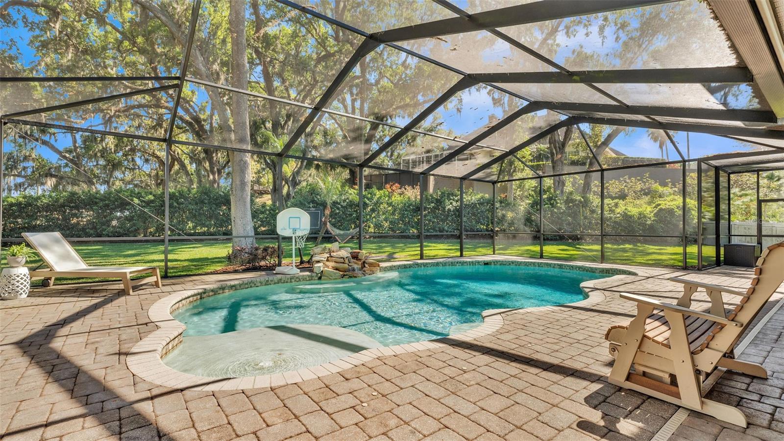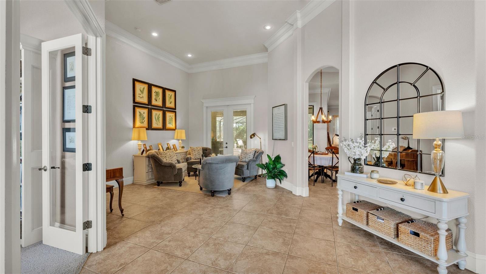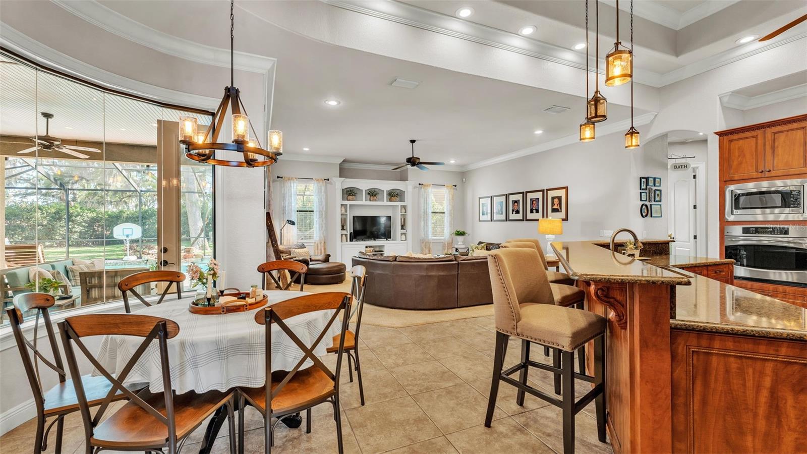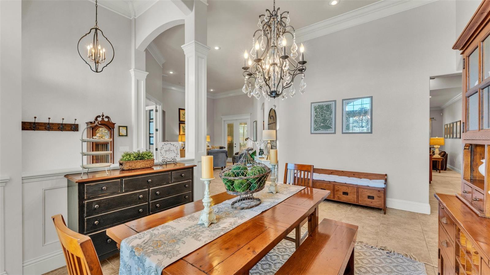 Welcome to 6774 Crescent Woods Circle, a stunning estate located in the exclusive, gated community of Crescent Woods in South Lakeland. This coveted neighborhood, consisting of only 48 homes, offers a rare level of privacy and luxury. Situated on a spacious .60-acre lot, this expansive residence spans over 6,000 square feet under roof and features five bedrooms, four bathrooms, and a dedicated office with French doors that open to the grand great room, allowing an abundance of natural light to flood the space. Built in 2008 by the renowned Strawbridge Homes, known for their exceptional craftsmanship, this home exudes elegance at every turn. Upon entering, you are greeted by soaring 15-foot ceilings and a series of custom-built features that elevate its stunning appeal. The open floor plan is complemented by crown molding throughout, double-pane windows, and foam-insulated exterior walls that ensure both comfort and energy efficiency. The gourmet kitchen, a true centerpiece of the home, overlooks the living area and features built-in cabinetry, high-end appliances, and large windows offering breathtaking views of the private, screened-in solar-heated pool. The luxurious primary suite provides a tranquil retreat, complete with direct access to the lanai, a tray ceiling, and ample space for relaxation. The en-suite bathroom is an oasis in itself, featuring dual vanities, a seated vanity area, a tiled step-in shower, and two spacious walk-in closets. Upstairs, a charming living area awaits, complete with its own full-size bathroom, walk-in closet, and custom-built storage, offering the perfect space for guests or additional family members. The resort-style backyard is truly an entertainer's paradise, with mature landscaping and an expansive circular paver driveway leading to a two-car garage on the right and a single-vehicle garage on the left. The fenced-in backyard offers complete privacy and serenity, surrounded by towering trees that create a peaceful retreat. The solar-heated, screen-enclosed pool, with a waterfall feature and 8-foot depth, provides the ultimate place to unwind or host guests, complemented by a large pavered patio and a fully-equipped custom outdoor kitchen. This exceptional home is perfectly situated on a corner lot, offering both space and an ideal location near excellent schools such as Scott Lake Elementary, Valleyview Elementary, and Highlands Grove Elementary, as well as Lakeland Highlands Middle School and George Jenkins High School. The best of South Lakeland's shopping, dining, and amenities are just minutes away. With a roof replacement completed in December 2024, a new pool pump in 2024 and a tankless hot water heater installed in 2024, this home is ready for years of enjoyment. Don't miss the opportunity to experience this exquisite residence. Schedule your tour today and discover the perfect blend of luxury, comfort, and style.