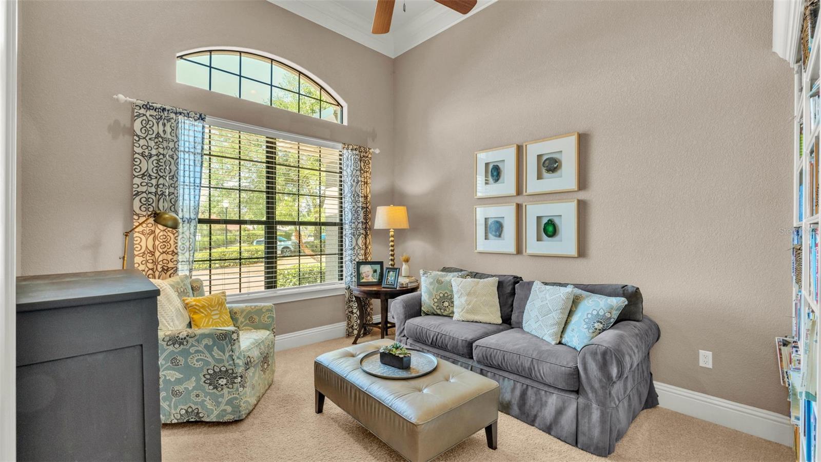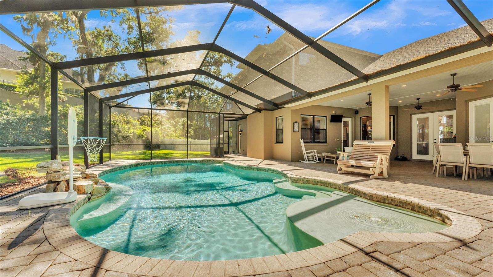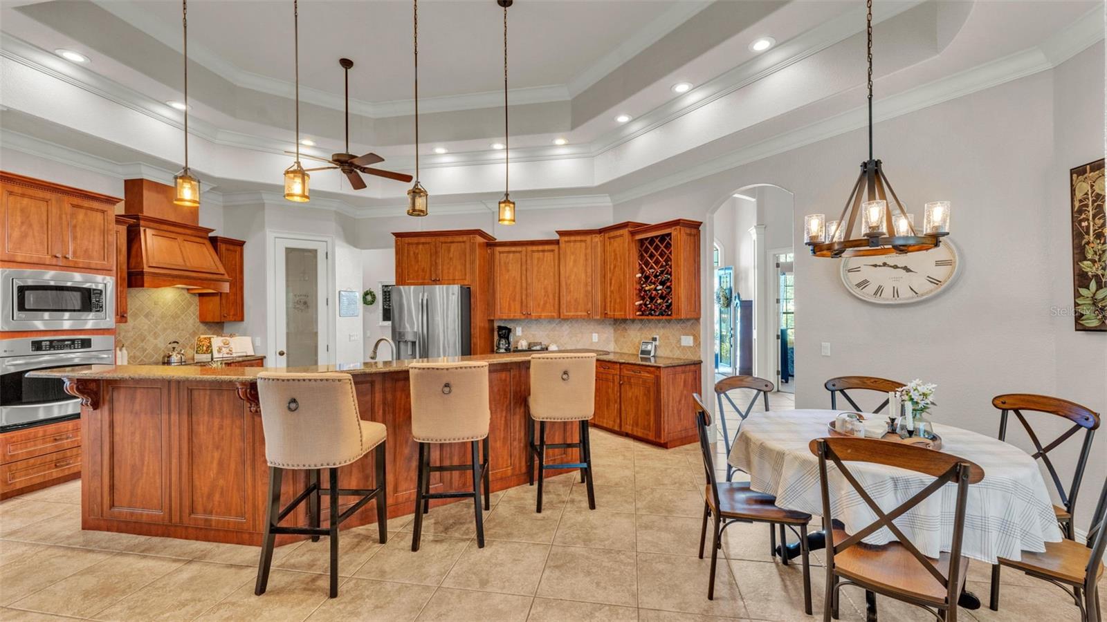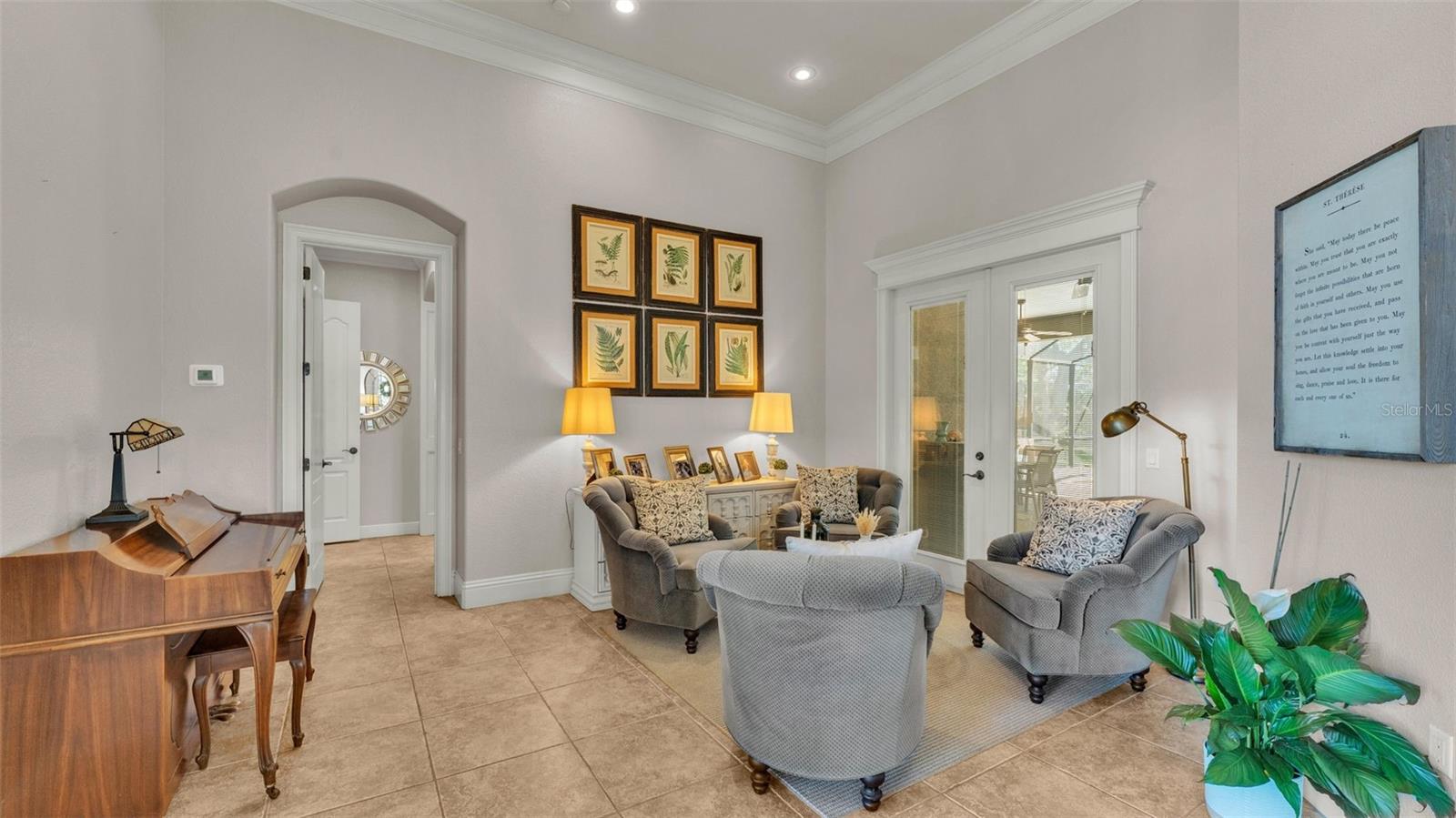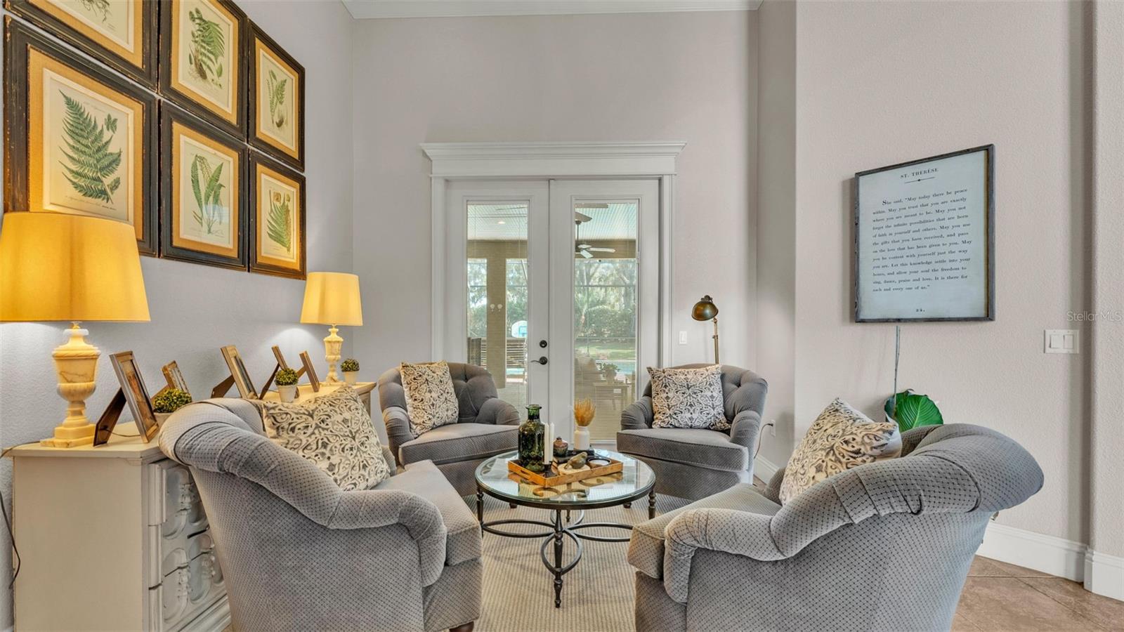 Welcome to 6774 Crescent Woods Circle, a stunning estate located in the exclusive, gated community of Crescent Woods in South Lakeland. This coveted neighborhood, consisting of only 48 homes, offers a rare level of privacy and luxury. Situated on a spacious .60-acre lot, this expansive residence spans over 6,000 square feet under roof and features five bedrooms, four bathrooms, and a dedicated office with French doors that open to the grand great room, allowing an abundance of natural light to flood the space. Built in 2008 by the renowned Strawbridge Homes, known for their exceptional craftsmanship, this home exudes elegance at every turn. Upon entering, you are greeted by soaring 15-foot ceilings and a series of custom-built features that elevate its stunning appeal. The open floor plan is complemented by crown molding throughout, double-pane windows, and foam-insulated exterior walls that ensure both comfort and energy efficiency. The gourmet kitchen, a true centerpiece of the home, overlooks the living area and features built-in cabinetry, high-end appliances, and large windows offering breathtaking views of the private, screened-in solar-heated pool. The luxurious primary suite provides a tranquil retreat, complete with direct access to the lanai, a tray ceiling, and ample space for relaxation. The en-suite bathroom is an oasis in itself, featuring dual vanities, a seated vanity area, a tiled step-in shower, and two spacious walk-in closets. Upstairs, a charming living area awaits, complete with its own full-size bathroom, walk-in closet, and custom-built storage, offering the perfect space for guests or additional family members. The resort-style backyard is truly an entertainer's paradise, with mature landscaping and an expansive circular paver driveway leading to a two-car garage on the right and a single-vehicle garage on the left. The fenced-in backyard offers complete privacy and serenity, surrounded by towering trees that create a peaceful retreat. The solar-heated, screen-enclosed pool, with a waterfall feature and 8-foot depth, provides the ultimate place to unwind or host guests, complemented by a large pavered patio and a fully-equipped custom outdoor kitchen. This exceptional home is perfectly situated on a corner lot, offering both space and an ideal location near excellent schools such as Scott Lake Elementary, Valleyview Elementary, and Highlands Grove Elementary, as well as Lakeland Highlands Middle School and George Jenkins High School. The best of South Lakeland's shopping, dining, and amenities are just minutes away. With a roof replacement completed in December 2024, a new pool pump in 2024 and a tankless hot water heater installed in 2024, this home is ready for years of enjoyment. Don't miss the opportunity to experience this exquisite residence. Schedule your tour today and discover the perfect blend of luxury, comfort, and style.