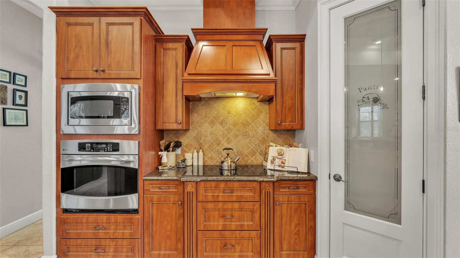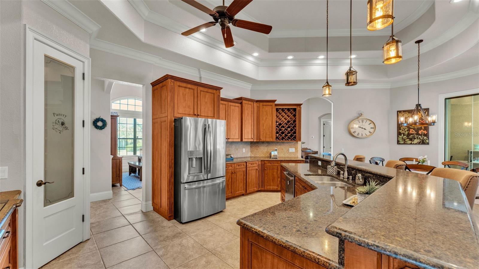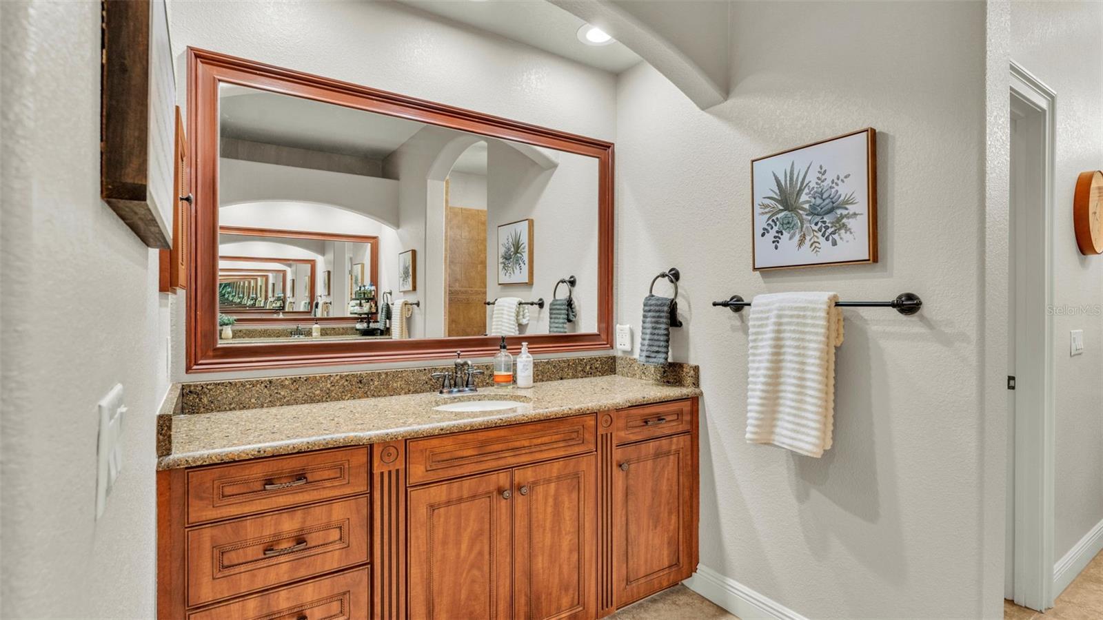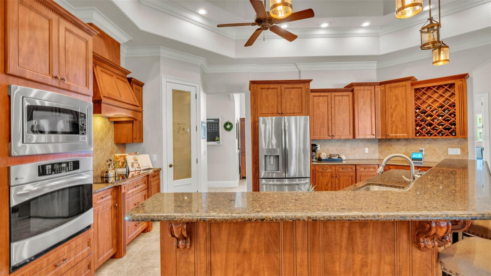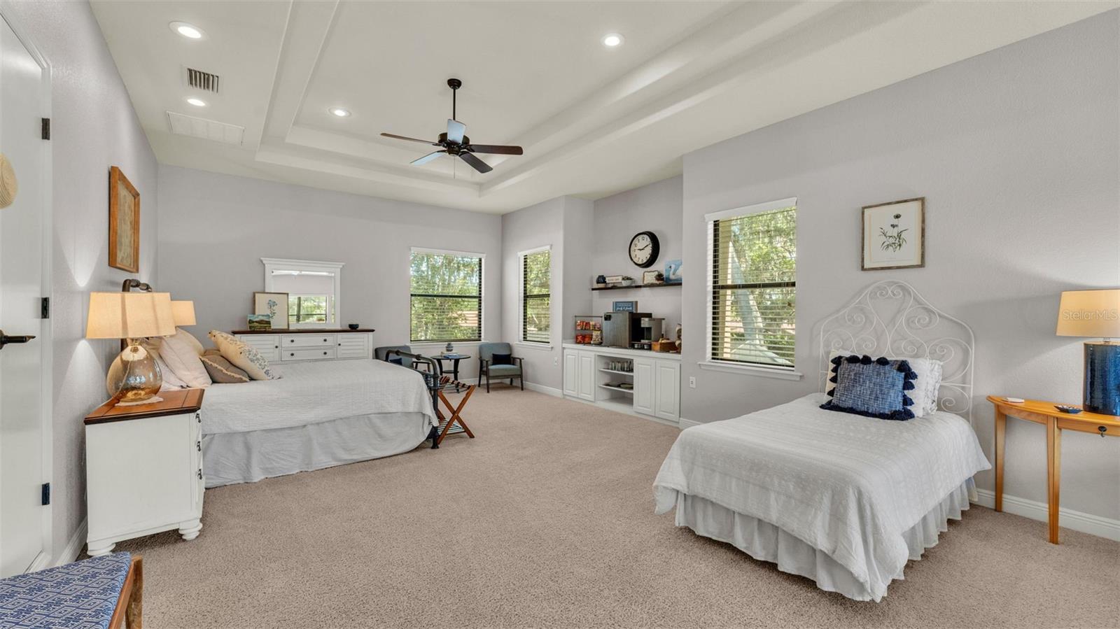 Welcome to 6774 Crescent Woods Circle, a stunning estate located in the exclusive, gated community of Crescent Woods in South Lakeland. This coveted neighborhood, consisting of only 48 homes, offers a rare level of privacy and luxury. Situated on a spacious .60-acre lot, this expansive residence spans over 6,000 square feet under roof and features five bedrooms, four bathrooms, and a dedicated office with French doors that open to the grand great room, allowing an abundance of natural light to flood the space. Built in 2008 by the renowned Strawbridge Homes, known for their exceptional craftsmanship, this home exudes elegance at every turn. Upon entering, you are greeted by soaring 15-foot ceilings and a series of custom-built features that elevate its stunning appeal. The open floor plan is complemented by crown molding throughout, double-pane windows, and foam-insulated exterior walls that ensure both comfort and energy efficiency. The gourmet kitchen, a true centerpiece of the home, overlooks the living area and features built-in cabinetry, high-end appliances, and large windows offering breathtaking views of the private, screened-in solar-heated pool. The luxurious primary suite provides a tranquil retreat, complete with direct access to the lanai, a tray ceiling, and ample space for relaxation. The en-suite bathroom is an oasis in itself, featuring dual vanities, a seated vanity area, a tiled step-in shower, and two spacious walk-in closets. Upstairs, a charming living area awaits, complete with its own full-size bathroom, walk-in closet, and custom-built storage, offering the perfect space for guests or additional family members. The resort-style backyard is truly an entertainer's paradise, with mature landscaping and an expansive circular paver driveway leading to a two-car garage on the right and a single-vehicle garage on the left. The fenced-in backyard offers complete privacy and serenity, surrounded by towering trees that create a peaceful retreat. The solar-heated, screen-enclosed pool, with a waterfall feature and 8-foot depth, provides the ultimate place to unwind or host guests, complemented by a large pavered patio and a fully-equipped custom outdoor kitchen. This exceptional home is perfectly situated on a corner lot, offering both space and an ideal location near excellent schools such as Scott Lake Elementary, Valleyview Elementary, and Highlands Grove Elementary, as well as Lakeland Highlands Middle School and George Jenkins High School. The best of South Lakeland's shopping, dining, and amenities are just minutes away. With a roof replacement completed in December 2024, a new pool pump in 2024 and a tankless hot water heater installed in 2024, this home is ready for years of enjoyment. Don't miss the opportunity to experience this exquisite residence. Schedule your tour today and discover the perfect blend of luxury, comfort, and style.