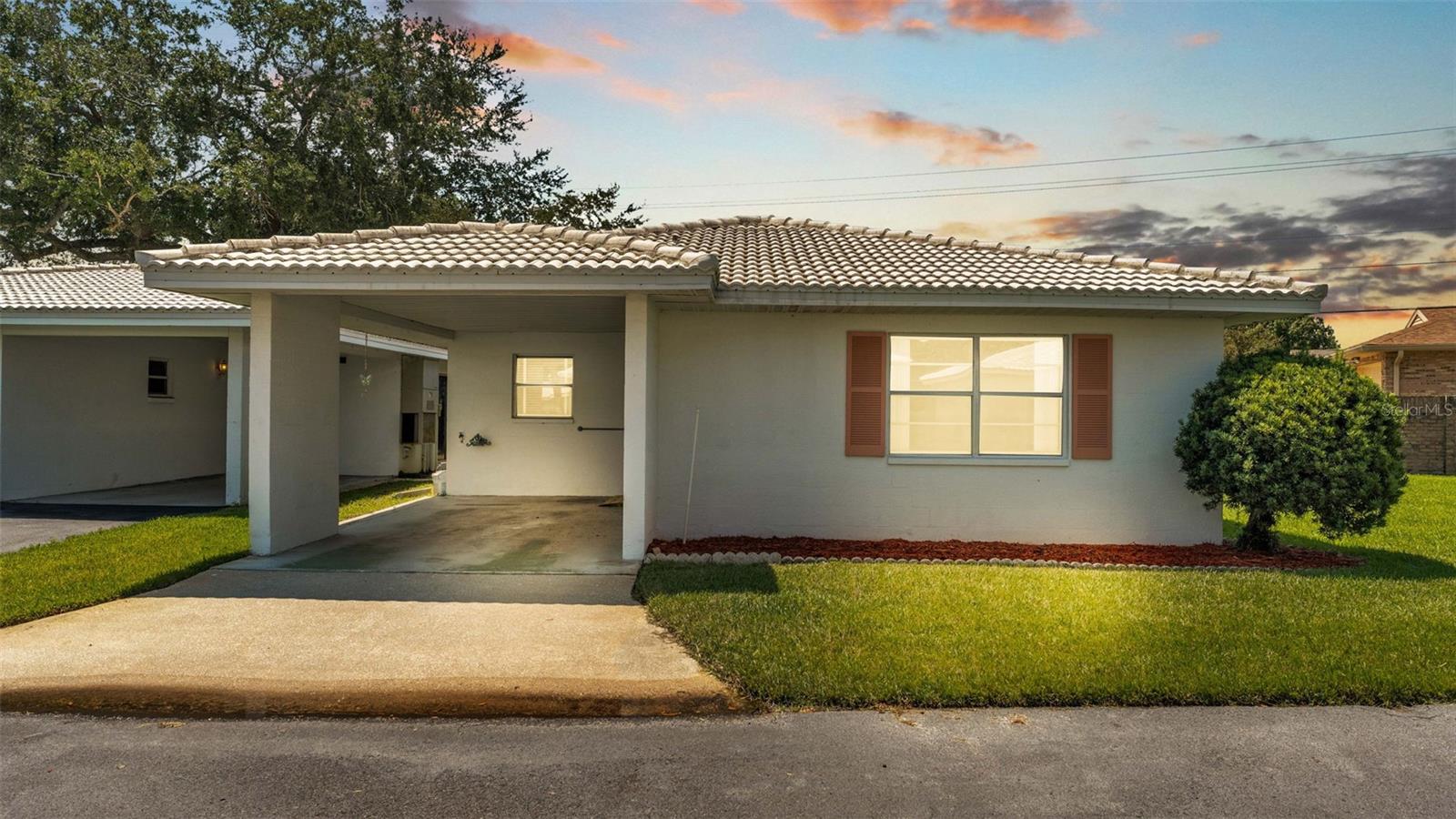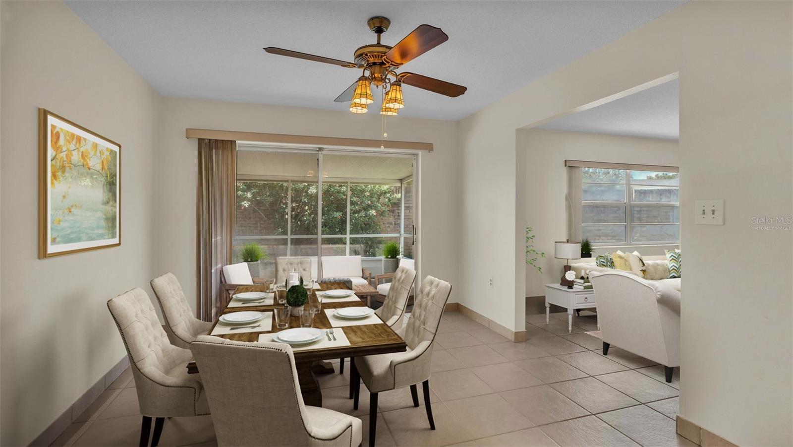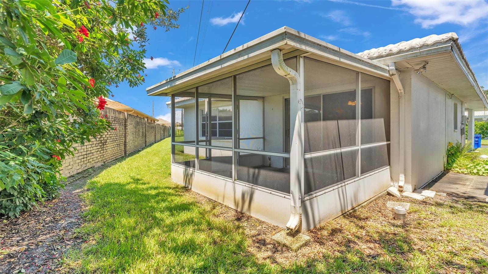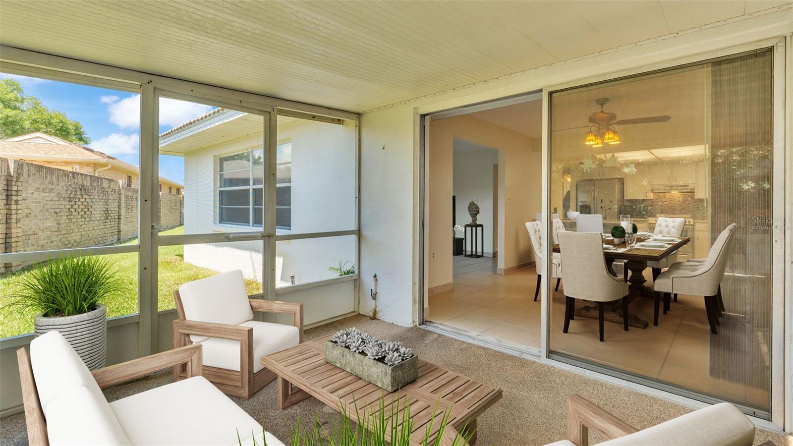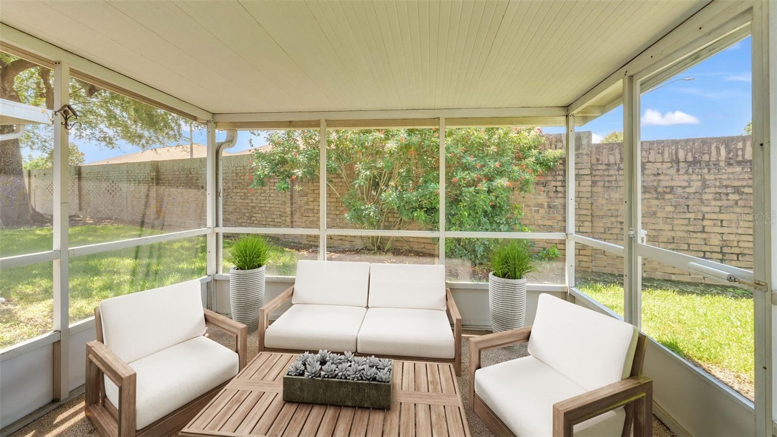 One or more photo(s) has been virtually staged. Welcome to this maintenance free home located in Lakeland, Florida with many included services provided within the HOA such as routine lawn care, cable and internet. Within the 55+ community of Imperial Southgate Villas, this 2 bed and 2 bath residence has a total of 1,380 square feet and is ready to accommodate any style of living. Upon first entering, you will find a hall with egress to the guest bathroom, secondary bedroom, and living room. Porcelain tile adorns the floor while sunset yellow walls provide an air of relaxed comfort. The guest bathroom, to the right of the entry, is equipped with a tub and sink vanity, as well as storage shelving above the toilet to ensure that the necessities are always within reach. The bedroom beyond is of generous size, and has a built in closet with accordion style doors to tuck away whatever you choose. Across from the bedroom lies a utility closet, including the water heater and sink basin, while awaiting the addition of a washing machine and dryer. Located in the main egress of the home, this space is accessible and convenient while providing plenty of wire shelving for tools and supplies of any kind. A few steps down the hall brings you to the primary bedroom to the right. Here is another large living area, equipped with a walk in closet and attached bathroom. The primary bathroom has a standing shower and sink within the privacy of your own quarters. At the end of the hall lies the dining room and attached kitchen. The kitchen itself presents abundant counter space and a double-basin sink, as well built in cutting board and a bar style countertop which overlooks the dining room and grants the option of additional seating. The dining room serves as the central location of the home, perfect for hosting gatherings of any sort, and leads to the enclosed lanai through its sliding glass door. An overhead fan and light provide day-round ambience while the patio door ensures plentiful natural light for whichever meal you're currently enjoying. A wide doorway to the side of the dining room gives way to the largest room yet, the living room. This wide area is ready to accommodate any taste of style or furniture, and has a long window to supply light throughout the day. Within a screened in lanai at the rear of the home, you'll discover the perfect place to enjoy the outdoors while retaining a sense of privacy via the beautiful red-brick wall that spans the rear property line. Equipped with a mail slot and wheelchair access ramp at the front door, as well as support railings throughout, this home provides thoughtful convenience no matter your needs. The surrounding community is operated by an HOA, and provides optional use of a clubhouse area, pool, tennis court and bocce ball. Tucked into its private neighborhood just off of South Florida Avenue, this location is perfect for anyone who wants easy access to the many stores and unique locales of Central Lakeland.