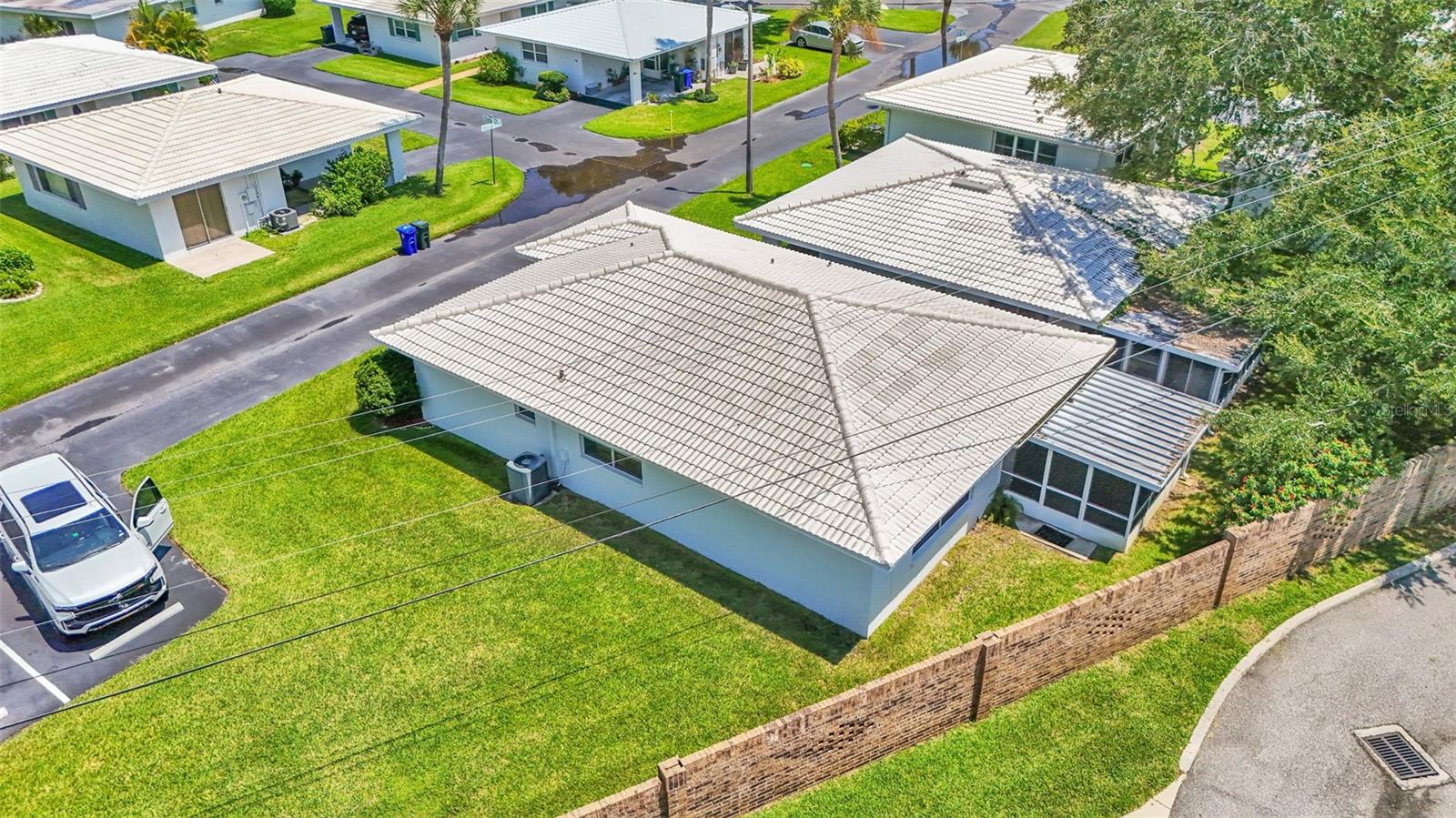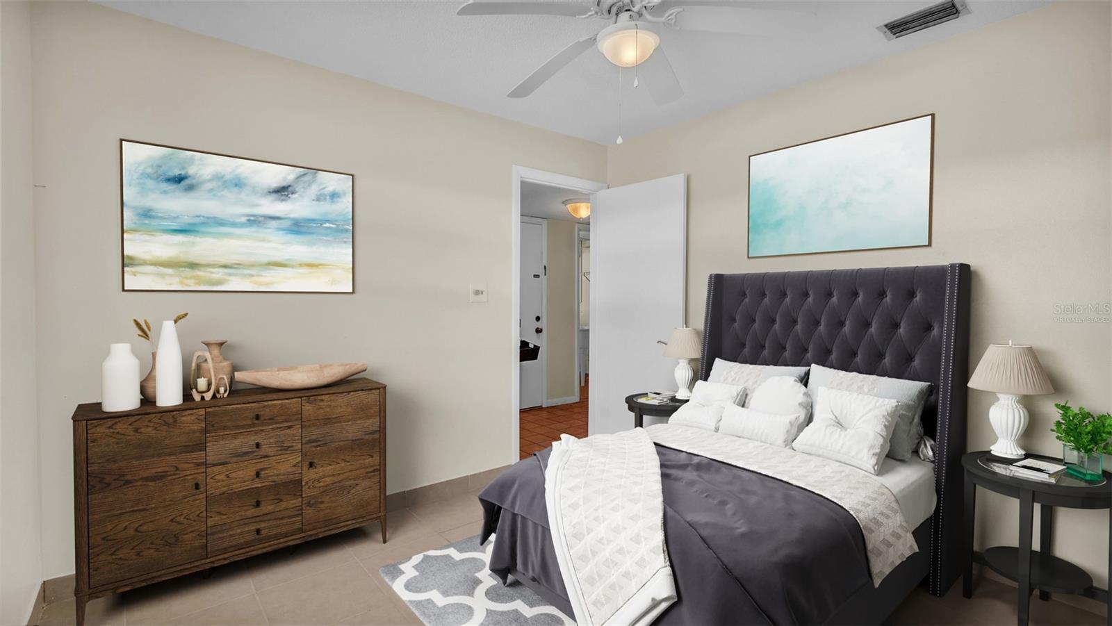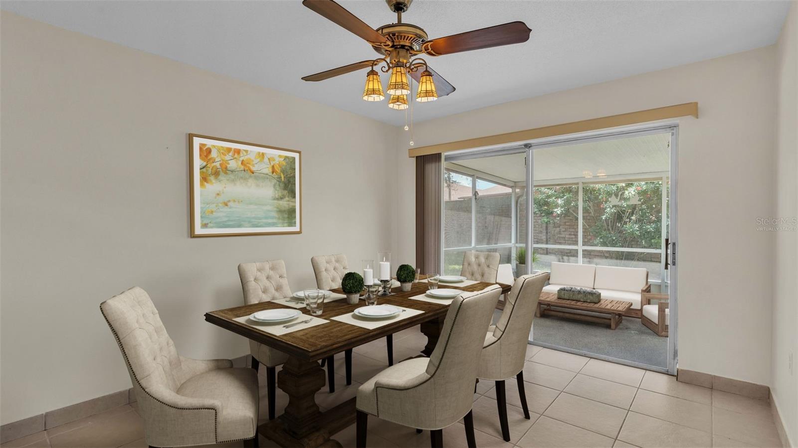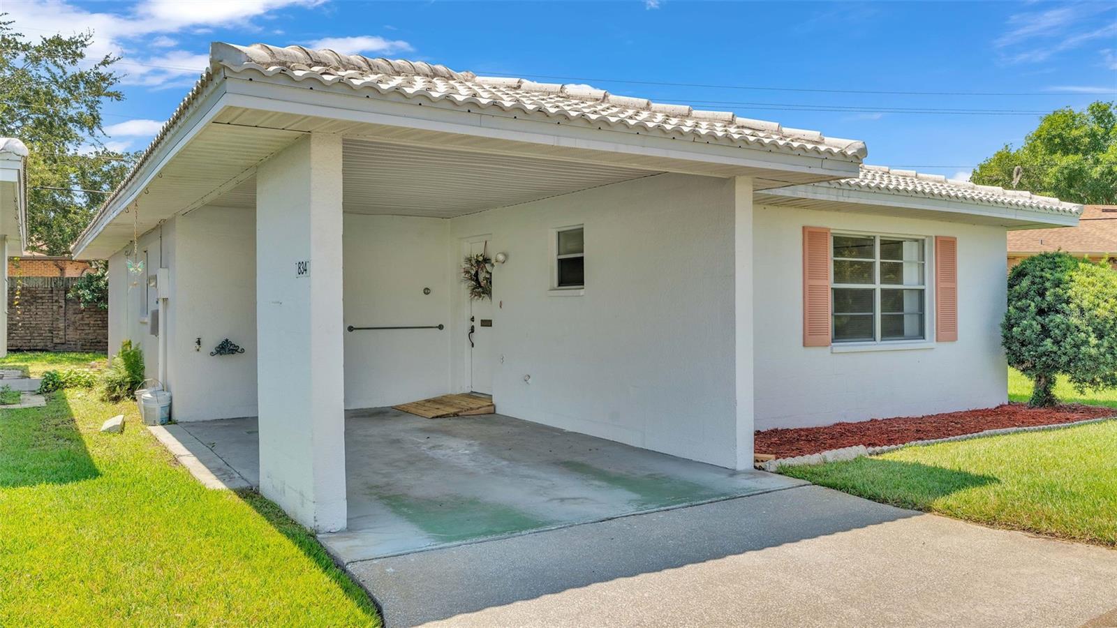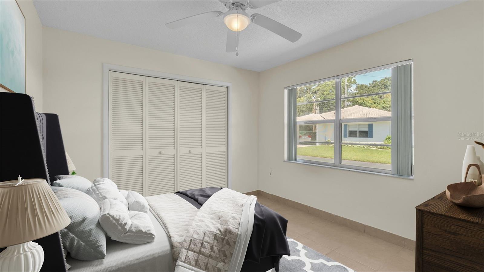 One or more photo(s) has been virtually staged. Welcome to this maintenance free home located in Lakeland, Florida with many included services provided within the HOA such as routine lawn care, cable and internet. Within the 55+ community of Imperial Southgate Villas, this 2 bed and 2 bath residence has a total of 1,380 square feet and is ready to accommodate any style of living. Upon first entering, you will find a hall with egress to the guest bathroom, secondary bedroom, and living room. Porcelain tile adorns the floor while sunset yellow walls provide an air of relaxed comfort. The guest bathroom, to the right of the entry, is equipped with a tub and sink vanity, as well as storage shelving above the toilet to ensure that the necessities are always within reach. The bedroom beyond is of generous size, and has a built in closet with accordion style doors to tuck away whatever you choose. Across from the bedroom lies a utility closet, including the water heater and sink basin, while awaiting the addition of a washing machine and dryer. Located in the main egress of the home, this space is accessible and convenient while providing plenty of wire shelving for tools and supplies of any kind. A few steps down the hall brings you to the primary bedroom to the right. Here is another large living area, equipped with a walk in closet and attached bathroom. The primary bathroom has a standing shower and sink within the privacy of your own quarters. At the end of the hall lies the dining room and attached kitchen. The kitchen itself presents abundant counter space and a double-basin sink, as well built in cutting board and a bar style countertop which overlooks the dining room and grants the option of additional seating. The dining room serves as the central location of the home, perfect for hosting gatherings of any sort, and leads to the enclosed lanai through its sliding glass door. An overhead fan and light provide day-round ambience while the patio door ensures plentiful natural light for whichever meal you're currently enjoying. A wide doorway to the side of the dining room gives way to the largest room yet, the living room. This wide area is ready to accommodate any taste of style or furniture, and has a long window to supply light throughout the day. Within a screened in lanai at the rear of the home, you'll discover the perfect place to enjoy the outdoors while retaining a sense of privacy via the beautiful red-brick wall that spans the rear property line. Equipped with a mail slot and wheelchair access ramp at the front door, as well as support railings throughout, this home provides thoughtful convenience no matter your needs. The surrounding community is operated by an HOA, and provides optional use of a clubhouse area, pool, tennis court and bocce ball. Tucked into its private neighborhood just off of South Florida Avenue, this location is perfect for anyone who wants easy access to the many stores and unique locales of Central Lakeland.