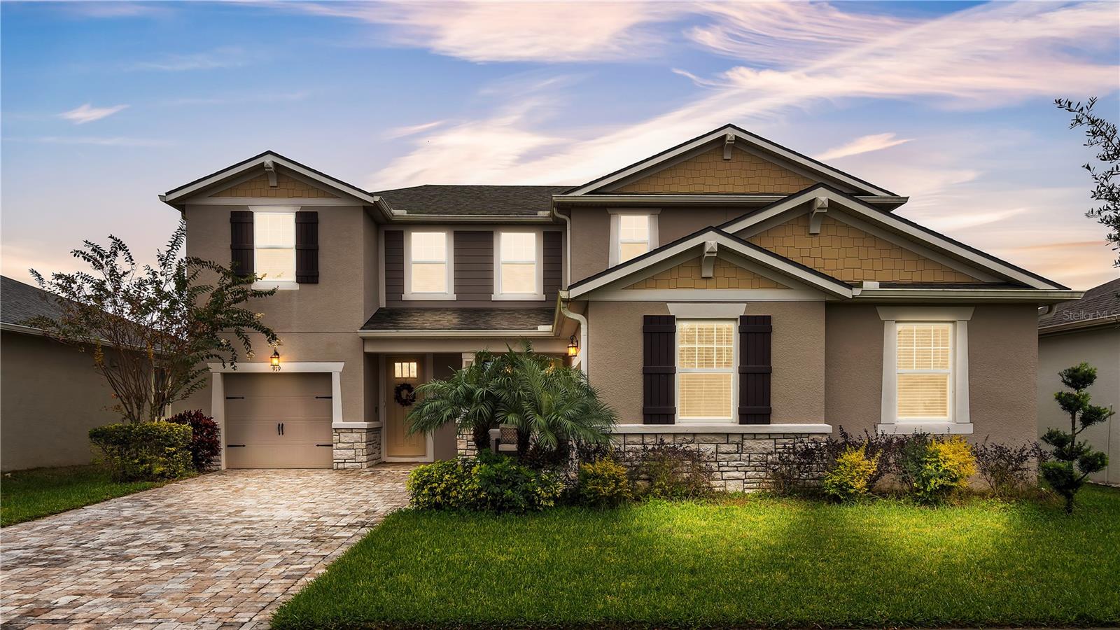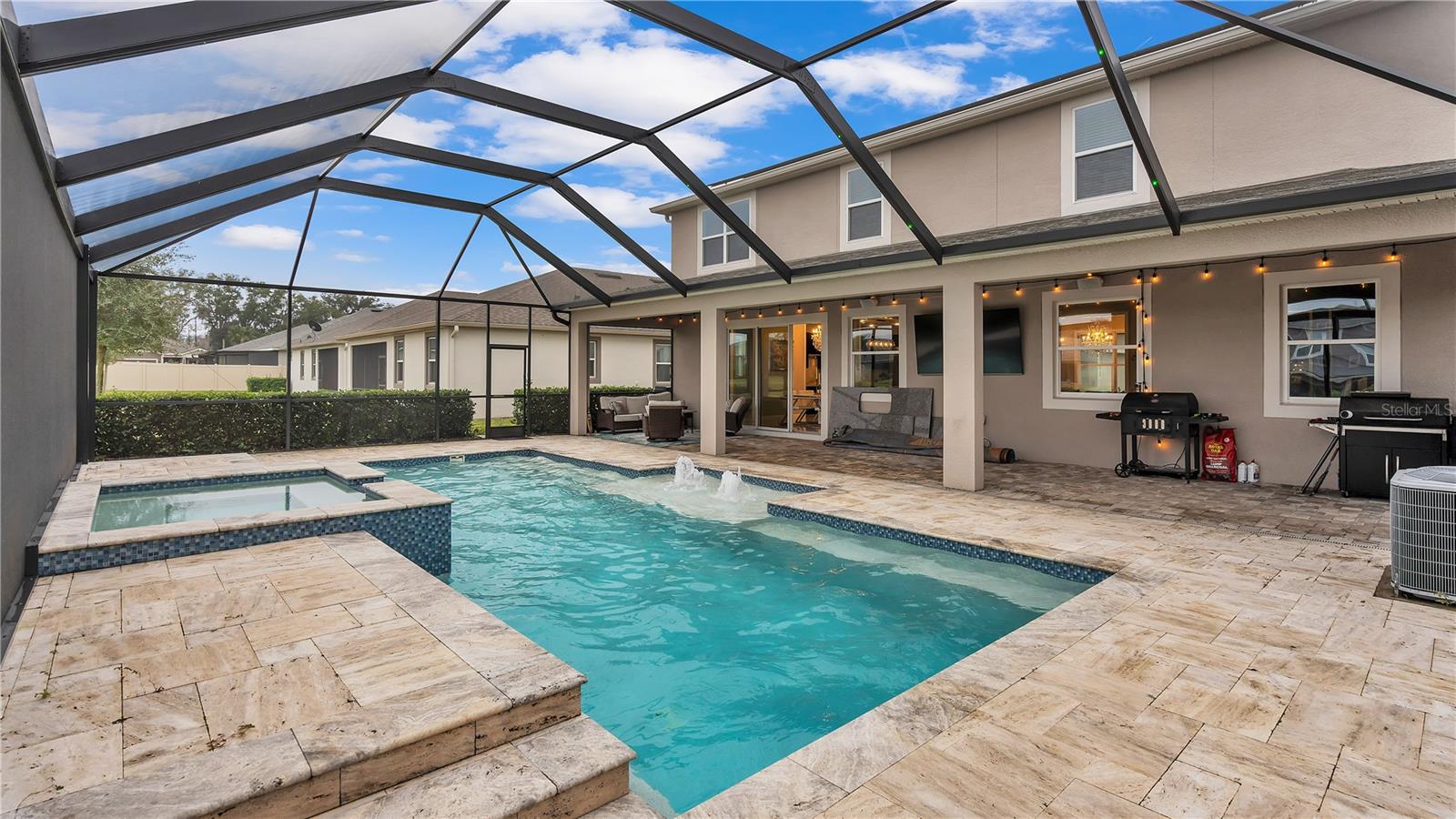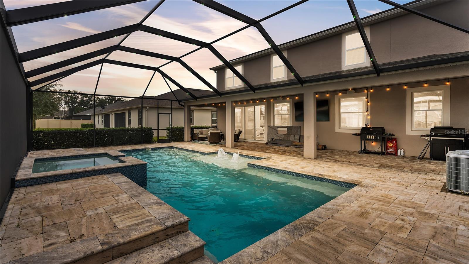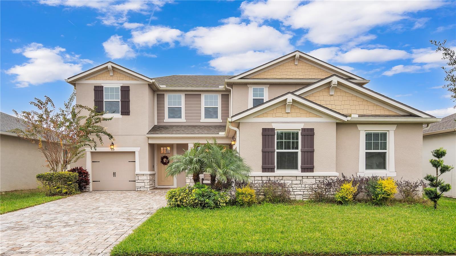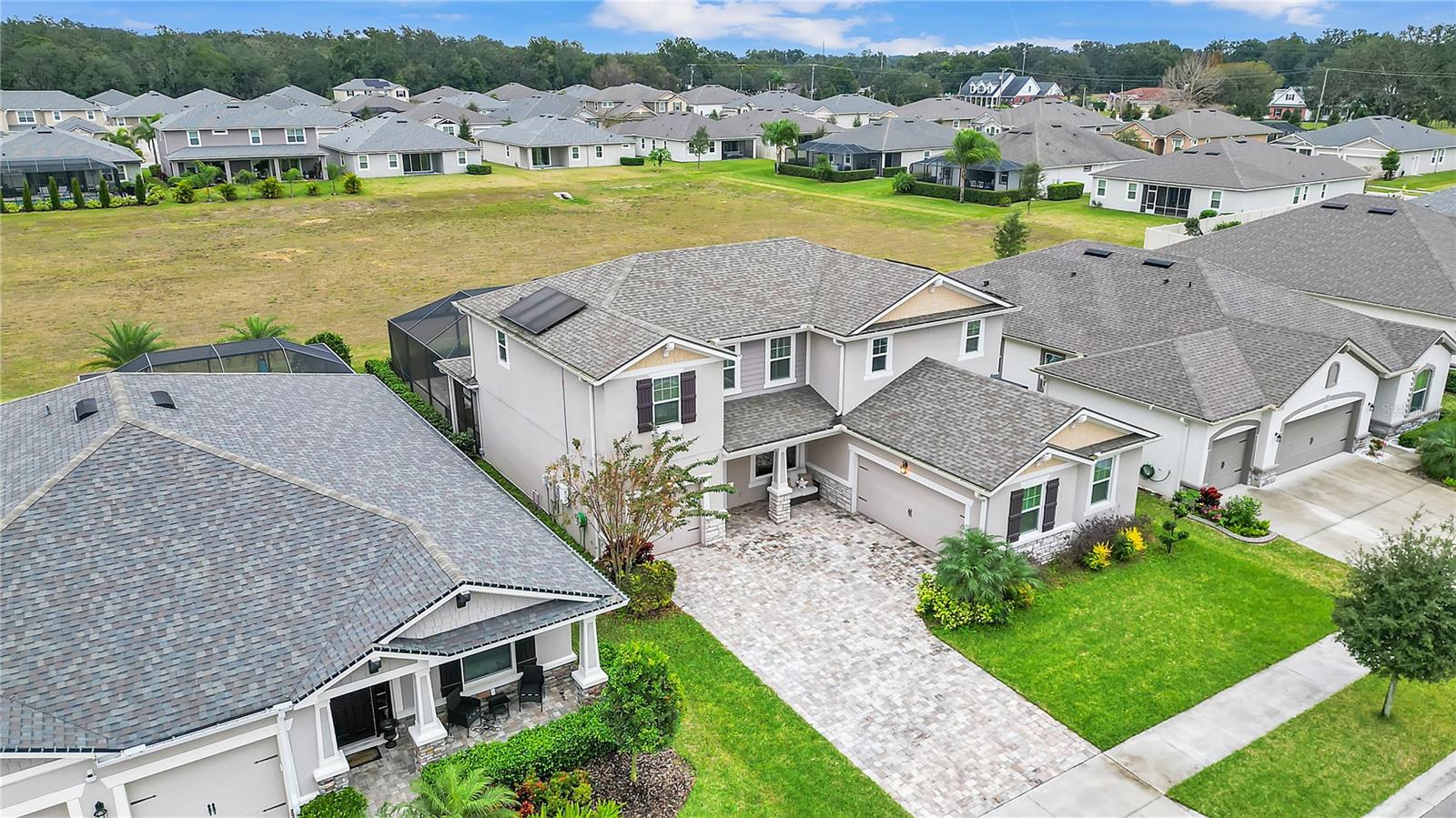 ***PRICE IMPROVEMENT*** Nestled within the community of Meadow Grove, this 2020 built luxurious residence offers the epitome of contemporary living. With four bedrooms, all conveniently located upstairs, and two and a half bathrooms, this meticulously crafted home boasts a three-car garage, artfully subdivided with a single-car garage on the front left and a double-car garage on the right side. The pavered driveway leads to a grand entrance adorned with lush landscaping and a welcoming front porch. Step inside to discover a living room featuring exquisite tiled flooring throughout, complemented by recessed lighting, built-in surround sound, and elegantly cased windows. The open floor plan seamlessly integrates the living space with a gourmet kitchen adorned with top-of-the-line stainless steel KitchenAid appliances, a double oven, and a built-in fridge. Quartzite countertops and a decorative backsplash add a touch of sophistication, while the induction cooktop and a complete island remodel with waterfall granite on both sides showcase meticulous attention to detail. All walls and window edges are framed with wood trim, creating an ambiance of timeless elegance. The dining area and guest room are adorned with three elegant chandeliers, while the guest room's walls are wrapped in golden Italian wall wrap for a touch of opulence. The entire property is equipped with pre-wired security camera installations for added peace of mind, with the living area featuring two 110v plugs on the floor and four pre-wired ceiling speakers. The flex room/office boasts fully renovated walls, paint, and wood trim, with most walls prewired for Ethernet. Practical amenities include a laundry room with a sink and ample cabinet space. The outdoor oasis features a pool with a, a travertine deck, and a pool enclosure with LED changing colors on the ceiling light. The solar system is designed to cover 115% of the house's average consumption, complemented by a water softener and two water hoses on both sides of the house. The lanai is equipped with prewired Sonans ceiling speakers and an 87" wall-mounted TV, creating an ideal space for outdoor entertainment. This residence seamlessly combines opulence, functionality, and technological sophistication, promising a lifestyle of unparalleled luxury. Scheduled your showing today!