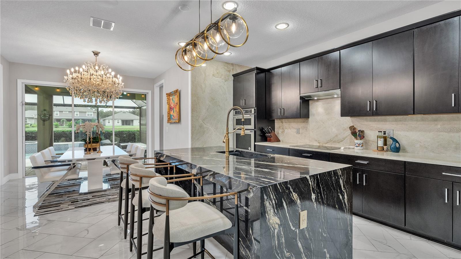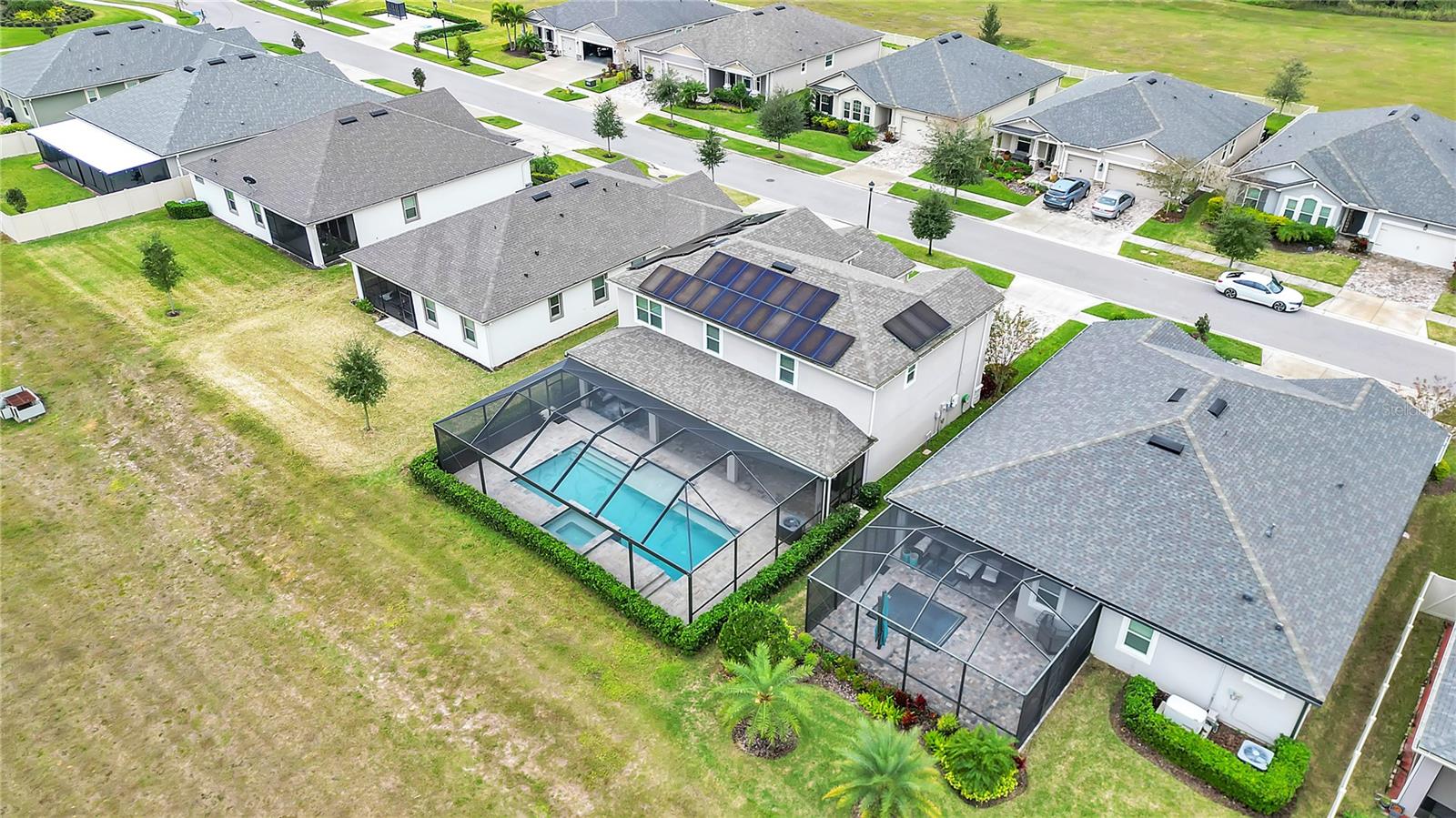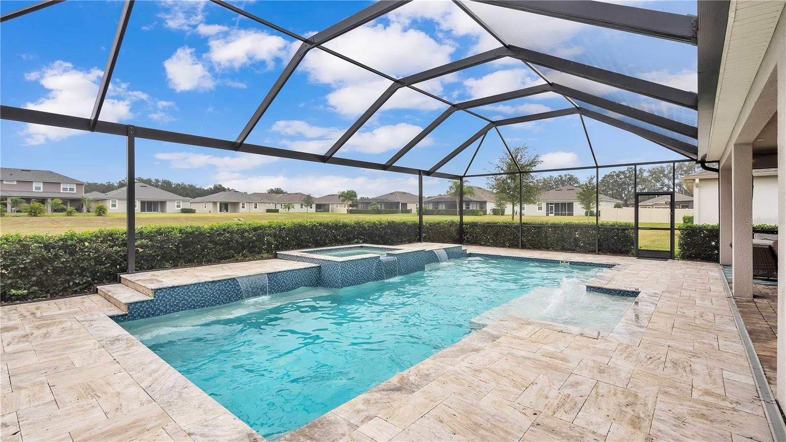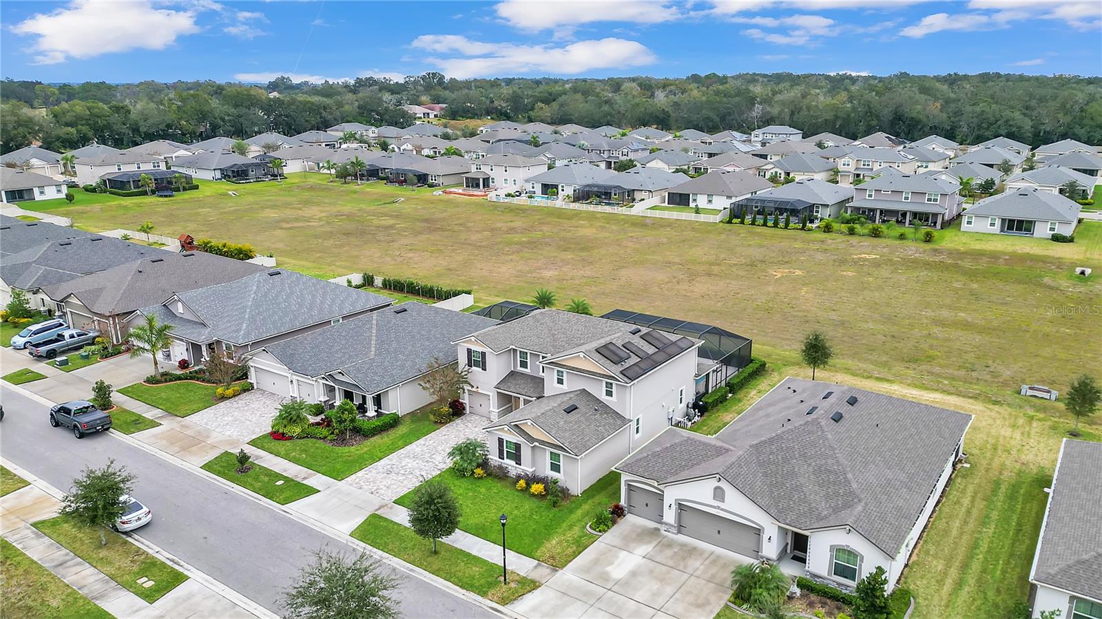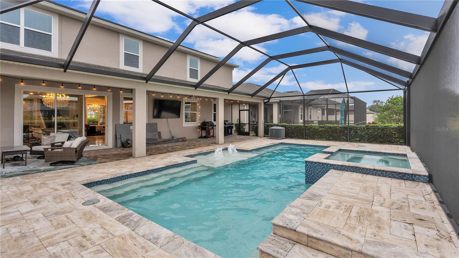 ***PRICE IMPROVEMENT*** Nestled within the community of Meadow Grove, this 2020 built luxurious residence offers the epitome of contemporary living. With four bedrooms, all conveniently located upstairs, and two and a half bathrooms, this meticulously crafted home boasts a three-car garage, artfully subdivided with a single-car garage on the front left and a double-car garage on the right side. The pavered driveway leads to a grand entrance adorned with lush landscaping and a welcoming front porch. Step inside to discover a living room featuring exquisite tiled flooring throughout, complemented by recessed lighting, built-in surround sound, and elegantly cased windows. The open floor plan seamlessly integrates the living space with a gourmet kitchen adorned with top-of-the-line stainless steel KitchenAid appliances, a double oven, and a built-in fridge. Quartzite countertops and a decorative backsplash add a touch of sophistication, while the induction cooktop and a complete island remodel with waterfall granite on both sides showcase meticulous attention to detail. All walls and window edges are framed with wood trim, creating an ambiance of timeless elegance. The dining area and guest room are adorned with three elegant chandeliers, while the guest room's walls are wrapped in golden Italian wall wrap for a touch of opulence. The entire property is equipped with pre-wired security camera installations for added peace of mind, with the living area featuring two 110v plugs on the floor and four pre-wired ceiling speakers. The flex room/office boasts fully renovated walls, paint, and wood trim, with most walls prewired for Ethernet. Practical amenities include a laundry room with a sink and ample cabinet space. The outdoor oasis features a pool with a, a travertine deck, and a pool enclosure with LED changing colors on the ceiling light. The solar system is designed to cover 115% of the house's average consumption, complemented by a water softener and two water hoses on both sides of the house. The lanai is equipped with prewired Sonans ceiling speakers and an 87" wall-mounted TV, creating an ideal space for outdoor entertainment. This residence seamlessly combines opulence, functionality, and technological sophistication, promising a lifestyle of unparalleled luxury. Scheduled your showing today!