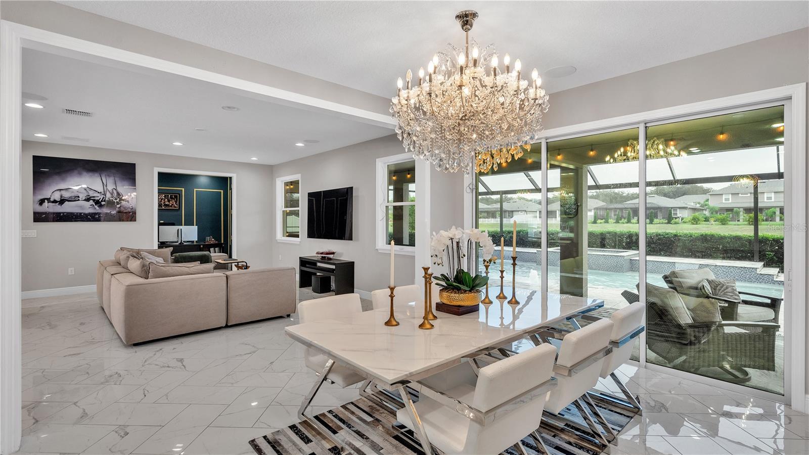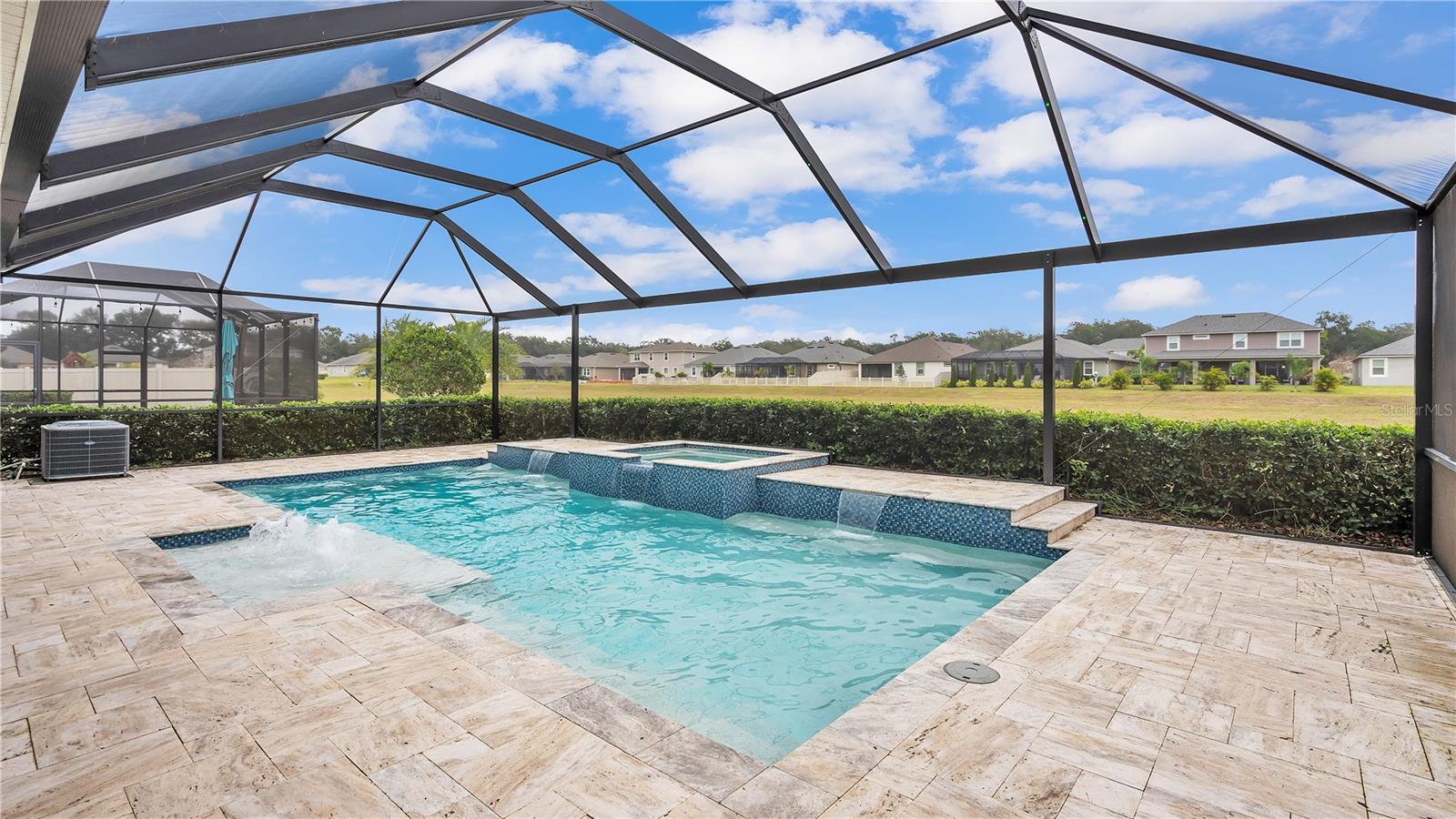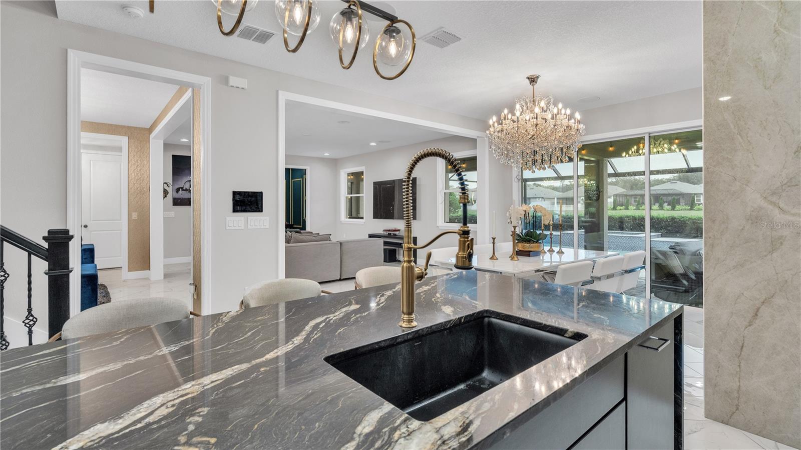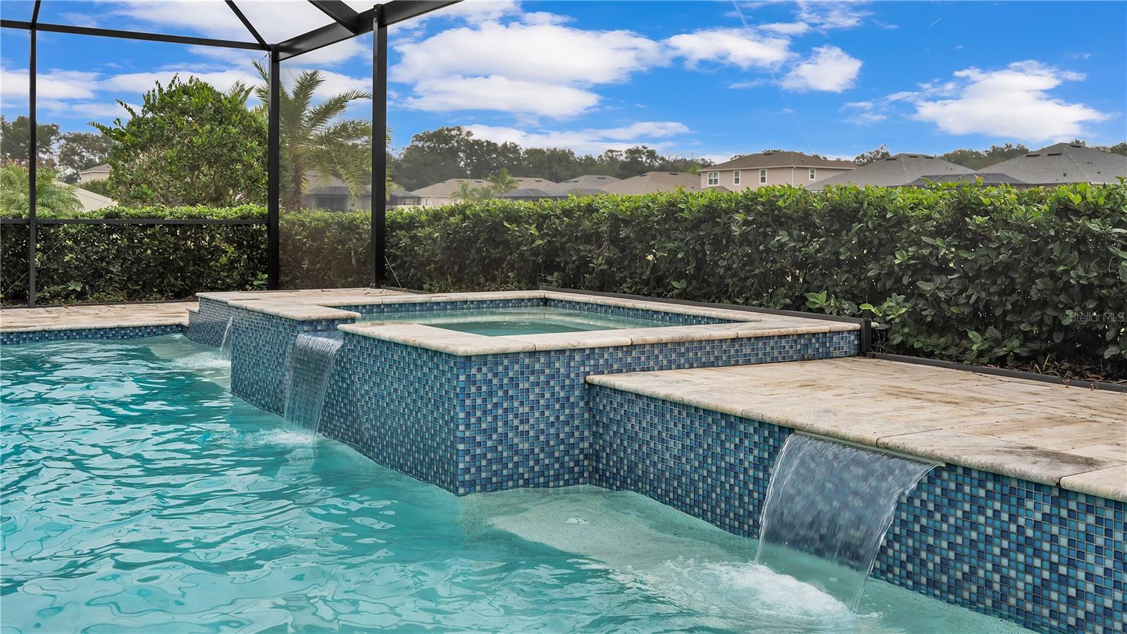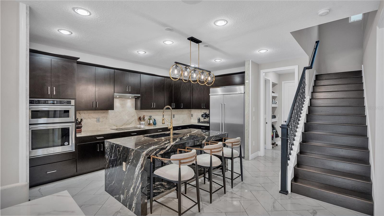 ***PRICE IMPROVEMENT*** Nestled within the community of Meadow Grove, this 2020 built luxurious residence offers the epitome of contemporary living. With four bedrooms, all conveniently located upstairs, and two and a half bathrooms, this meticulously crafted home boasts a three-car garage, artfully subdivided with a single-car garage on the front left and a double-car garage on the right side. The pavered driveway leads to a grand entrance adorned with lush landscaping and a welcoming front porch. Step inside to discover a living room featuring exquisite tiled flooring throughout, complemented by recessed lighting, built-in surround sound, and elegantly cased windows. The open floor plan seamlessly integrates the living space with a gourmet kitchen adorned with top-of-the-line stainless steel KitchenAid appliances, a double oven, and a built-in fridge. Quartzite countertops and a decorative backsplash add a touch of sophistication, while the induction cooktop and a complete island remodel with waterfall granite on both sides showcase meticulous attention to detail. All walls and window edges are framed with wood trim, creating an ambiance of timeless elegance. The dining area and guest room are adorned with three elegant chandeliers, while the guest room's walls are wrapped in golden Italian wall wrap for a touch of opulence. The entire property is equipped with pre-wired security camera installations for added peace of mind, with the living area featuring two 110v plugs on the floor and four pre-wired ceiling speakers. The flex room/office boasts fully renovated walls, paint, and wood trim, with most walls prewired for Ethernet. Practical amenities include a laundry room with a sink and ample cabinet space. The outdoor oasis features a pool with a, a travertine deck, and a pool enclosure with LED changing colors on the ceiling light. The solar system is designed to cover 115% of the house's average consumption, complemented by a water softener and two water hoses on both sides of the house. The lanai is equipped with prewired Sonans ceiling speakers and an 87" wall-mounted TV, creating an ideal space for outdoor entertainment. This residence seamlessly combines opulence, functionality, and technological sophistication, promising a lifestyle of unparalleled luxury. Scheduled your showing today!