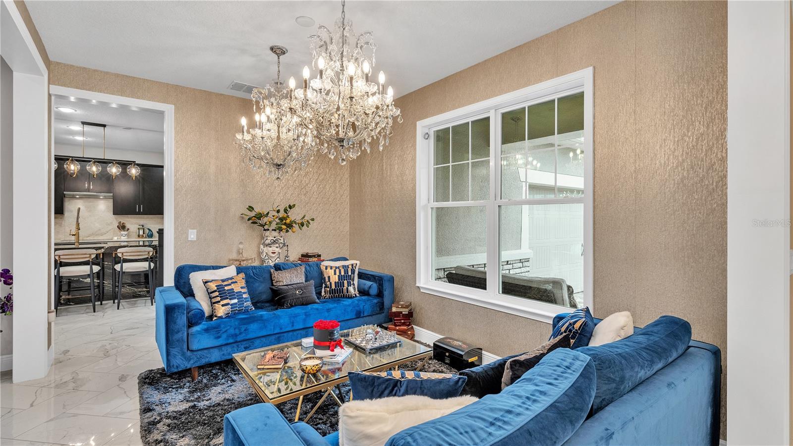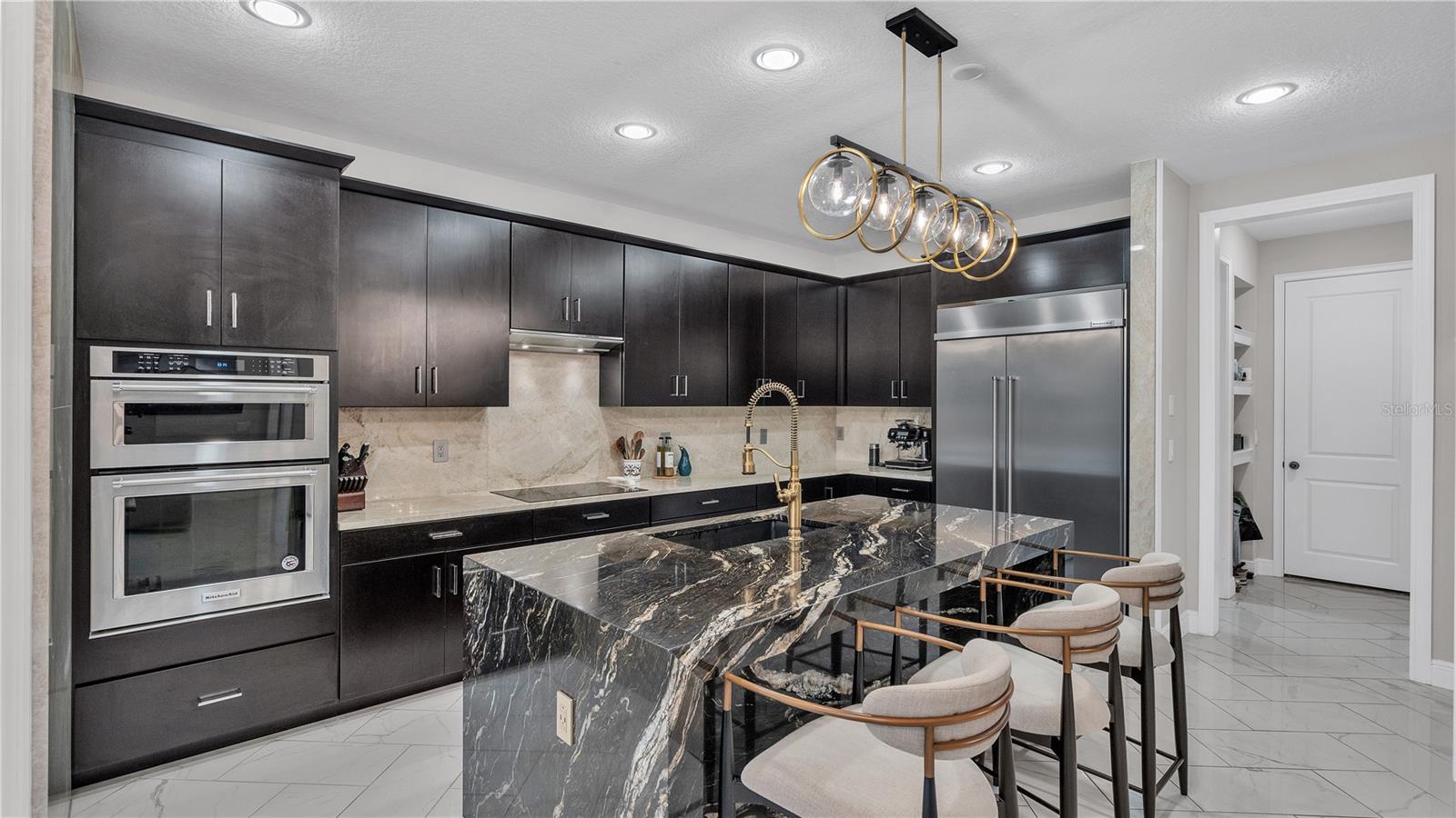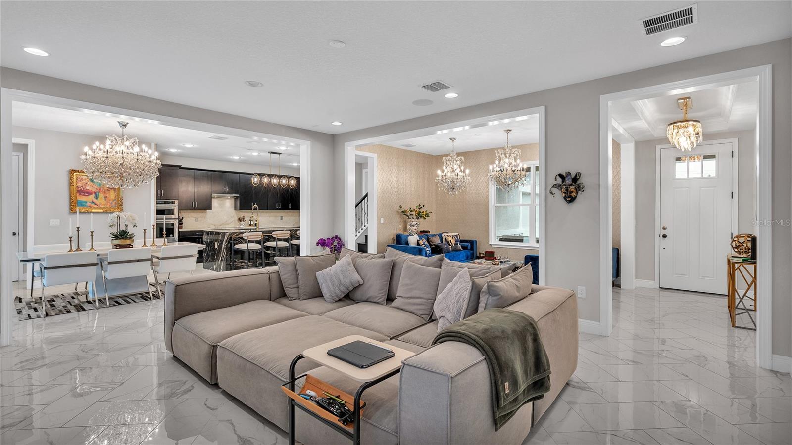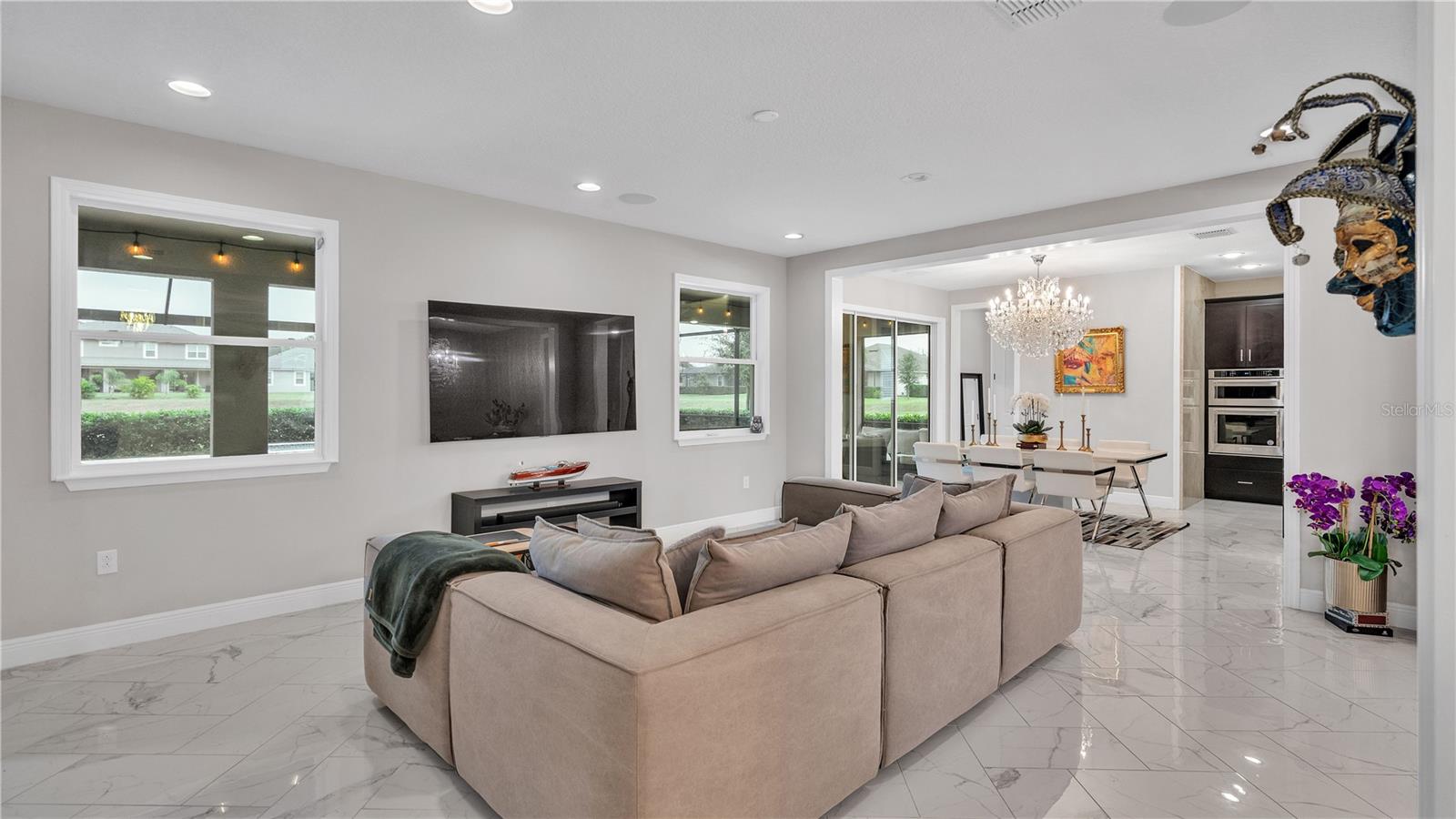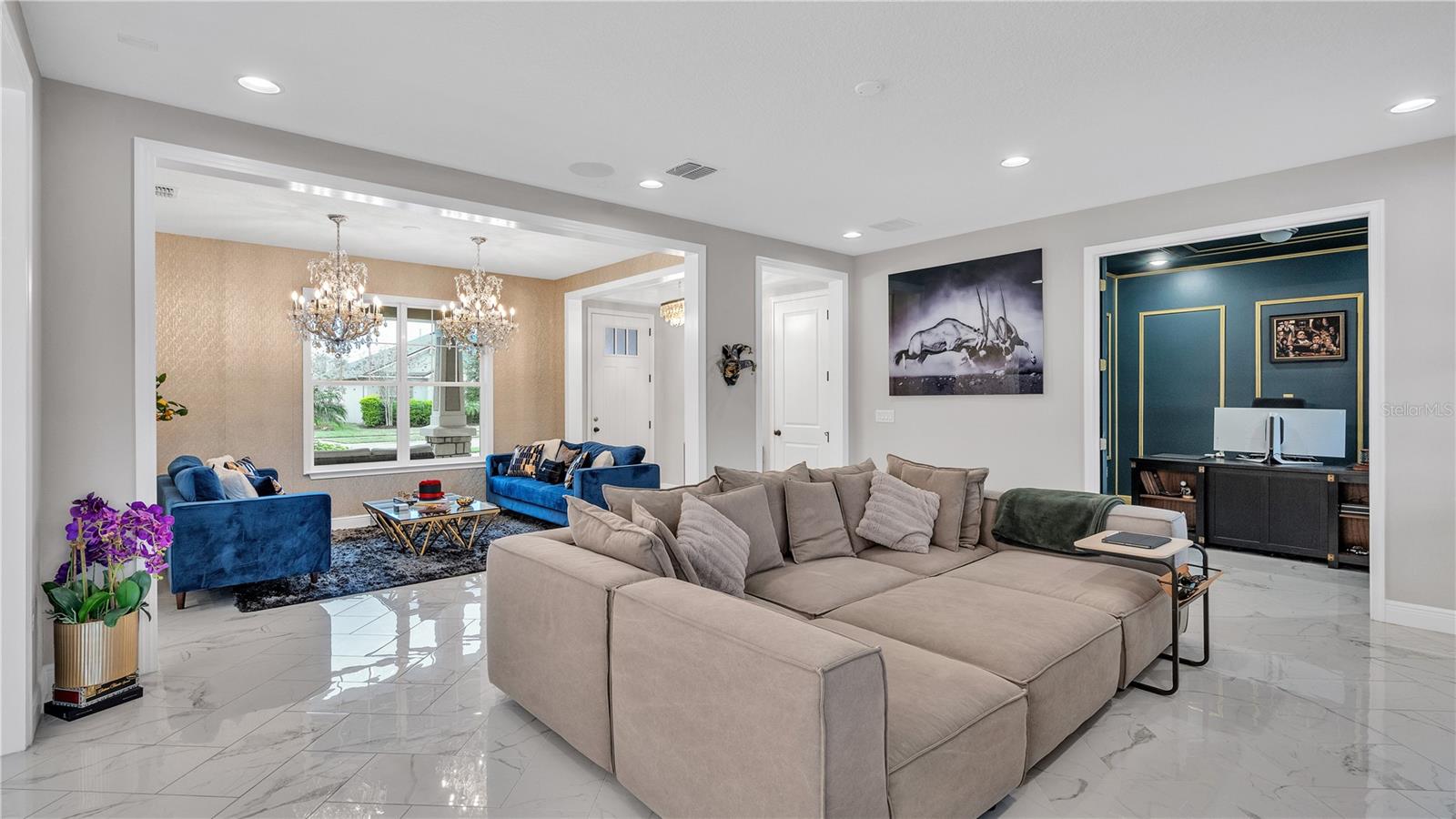 ***PRICE IMPROVEMENT*** Nestled within the community of Meadow Grove, this 2020 built luxurious residence offers the epitome of contemporary living. With four bedrooms, all conveniently located upstairs, and two and a half bathrooms, this meticulously crafted home boasts a three-car garage, artfully subdivided with a single-car garage on the front left and a double-car garage on the right side. The pavered driveway leads to a grand entrance adorned with lush landscaping and a welcoming front porch. Step inside to discover a living room featuring exquisite tiled flooring throughout, complemented by recessed lighting, built-in surround sound, and elegantly cased windows. The open floor plan seamlessly integrates the living space with a gourmet kitchen adorned with top-of-the-line stainless steel KitchenAid appliances, a double oven, and a built-in fridge. Quartzite countertops and a decorative backsplash add a touch of sophistication, while the induction cooktop and a complete island remodel with waterfall granite on both sides showcase meticulous attention to detail. All walls and window edges are framed with wood trim, creating an ambiance of timeless elegance. The dining area and guest room are adorned with three elegant chandeliers, while the guest room's walls are wrapped in golden Italian wall wrap for a touch of opulence. The entire property is equipped with pre-wired security camera installations for added peace of mind, with the living area featuring two 110v plugs on the floor and four pre-wired ceiling speakers. The flex room/office boasts fully renovated walls, paint, and wood trim, with most walls prewired for Ethernet. Practical amenities include a laundry room with a sink and ample cabinet space. The outdoor oasis features a pool with a, a travertine deck, and a pool enclosure with LED changing colors on the ceiling light. The solar system is designed to cover 115% of the house's average consumption, complemented by a water softener and two water hoses on both sides of the house. The lanai is equipped with prewired Sonans ceiling speakers and an 87" wall-mounted TV, creating an ideal space for outdoor entertainment. This residence seamlessly combines opulence, functionality, and technological sophistication, promising a lifestyle of unparalleled luxury. Scheduled your showing today!