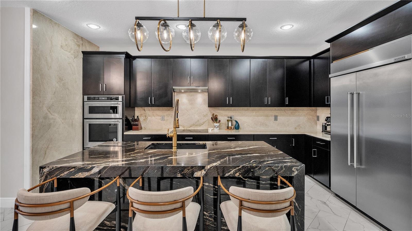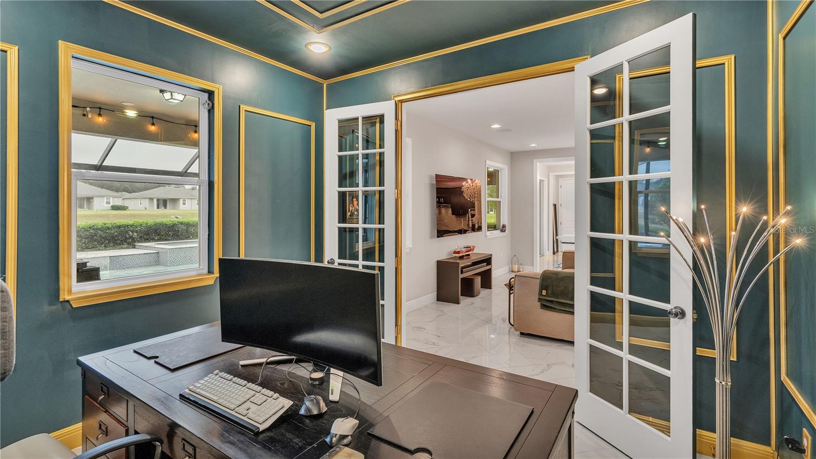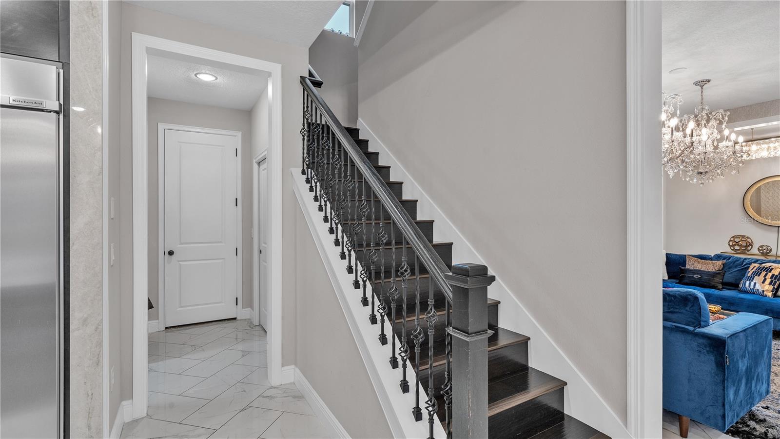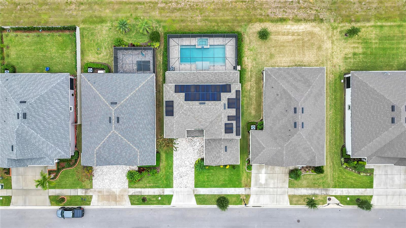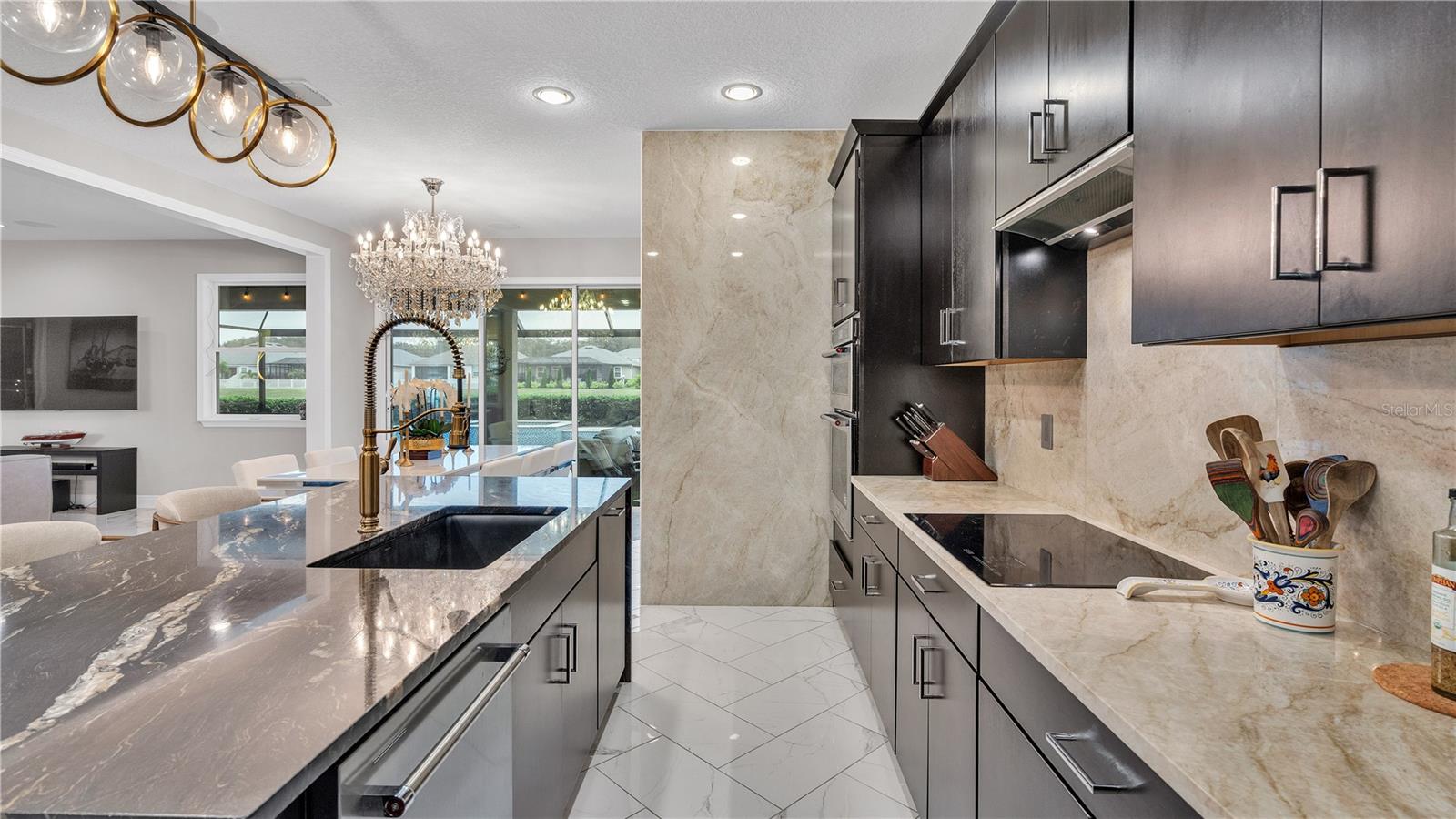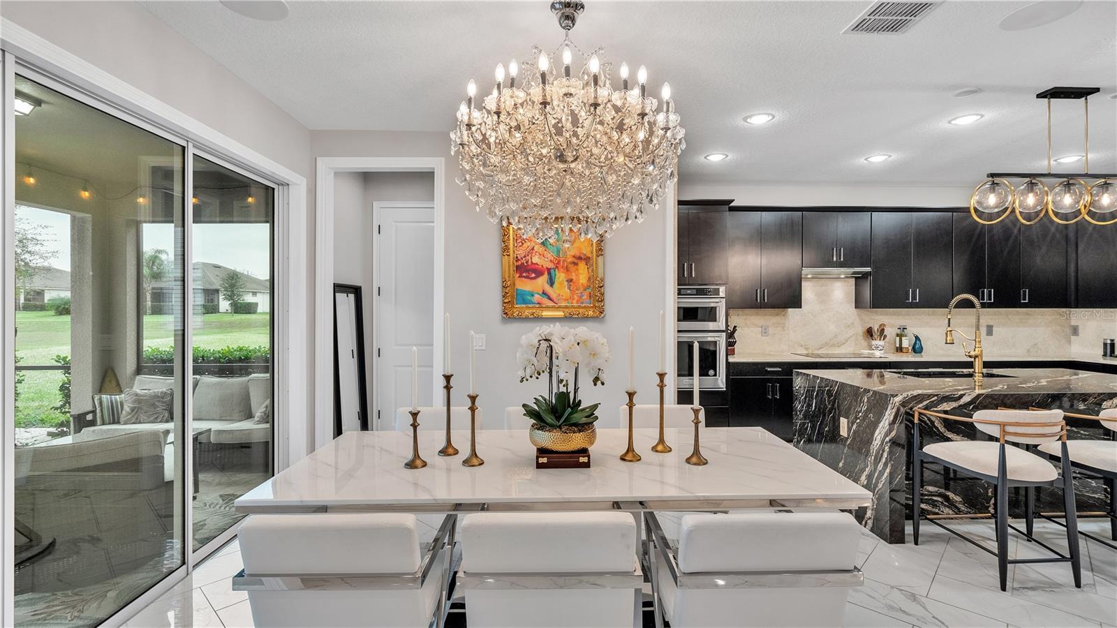 ***PRICE IMPROVEMENT*** Nestled within the community of Meadow Grove, this 2020 built luxurious residence offers the epitome of contemporary living. With four bedrooms, all conveniently located upstairs, and two and a half bathrooms, this meticulously crafted home boasts a three-car garage, artfully subdivided with a single-car garage on the front left and a double-car garage on the right side. The pavered driveway leads to a grand entrance adorned with lush landscaping and a welcoming front porch. Step inside to discover a living room featuring exquisite tiled flooring throughout, complemented by recessed lighting, built-in surround sound, and elegantly cased windows. The open floor plan seamlessly integrates the living space with a gourmet kitchen adorned with top-of-the-line stainless steel KitchenAid appliances, a double oven, and a built-in fridge. Quartzite countertops and a decorative backsplash add a touch of sophistication, while the induction cooktop and a complete island remodel with waterfall granite on both sides showcase meticulous attention to detail. All walls and window edges are framed with wood trim, creating an ambiance of timeless elegance. The dining area and guest room are adorned with three elegant chandeliers, while the guest room's walls are wrapped in golden Italian wall wrap for a touch of opulence. The entire property is equipped with pre-wired security camera installations for added peace of mind, with the living area featuring two 110v plugs on the floor and four pre-wired ceiling speakers. The flex room/office boasts fully renovated walls, paint, and wood trim, with most walls prewired for Ethernet. Practical amenities include a laundry room with a sink and ample cabinet space. The outdoor oasis features a pool with a, a travertine deck, and a pool enclosure with LED changing colors on the ceiling light. The solar system is designed to cover 115% of the house's average consumption, complemented by a water softener and two water hoses on both sides of the house. The lanai is equipped with prewired Sonans ceiling speakers and an 87" wall-mounted TV, creating an ideal space for outdoor entertainment. This residence seamlessly combines opulence, functionality, and technological sophistication, promising a lifestyle of unparalleled luxury. Scheduled your showing today!